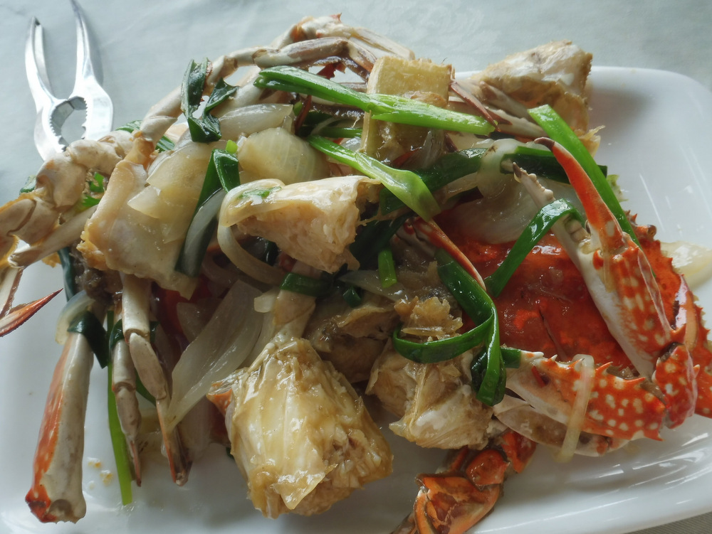 Nous débarquons peu après midi sur un port beaucoup plus animé que ce que j’imaginais, dans ce qui ressemble davantage à une petite ville qu’un village avec ses maisons à flanc de falaise et ses boutiques de souvenirs intercalées avec des restaurants de fruits de mer. J’ai relevé un nom en particulier pendant mes préparatifs de voyage: le So Bor Kee. Nous allons nous y asseoir sur une terrasse ombragée mais pas du tout climatisée, et sommes pris en charge par des gens qui ne parlent visiblement pas un mot d’anglais. Comme d’habitude, nos plats arrivent en décalé. D’abord les Saint-Jacques vapeur à l’aile que Chouchou a commandées, et qui sont délicieuses même si je les aurais préférées sans le corail. Puis mon crabe pas du tout décortiqué et servi sans le moindre grain de riz en accompagnement. Je le fixe d’un air consterné. Même avec l’aide de Chouchou, c’est à peine si je parviens à en extraire 2 dés à coudre de chair. Par contre, j’avale facilement le double en morceaux de carapace, et je me mets de la sauce jusqu’aux coudes et dans les oreilles. L’addition est plutôt salée et j’ai encore faim en sortant de table. Bref, ça n’était pas l’idée du siècle.