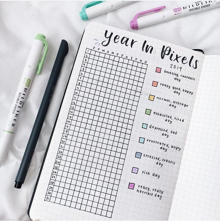 Le concept de "rhoo c'est joli tous ces journaux décorés" ça m'a longtemps chatouillée aussi… et j'ai fini par en commencer un le 26 novembre dernier (c'est facile, c'est là que j'ai commencé à mettre une grille avec des couleurs), initialement comme "journal de lecture"… et ça a très vite dérivé, j'ai ajouté des pages "Personal Log" pour mettre quelques notes sur ce qu'il s'est passé pendant la journée, j'y ai ajouté un challenge de lecture pour 2019, des trackers "style de lecture ; activité physique ; méditation) mois pas mois… Et pour les vacances de Noël je suis partie avec, ainsi qu'avec une trousse minimale de stylos et crayons de couleurs 😉 C'est aussi là que je fais des expériences lettro-typographiques, c'est rigolo et ça calme 😛