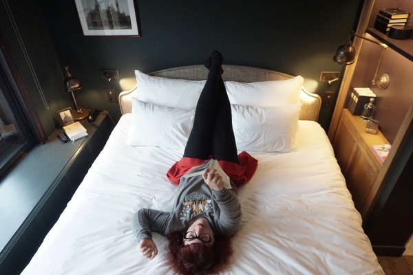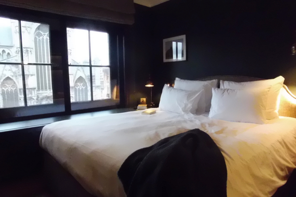 Nous avons passé une grande partie de l’après-midi du vendredi à prendre des photos dans la chambre avant de descendre boire un verre au Cobbler – où il y avait moins de monde que la dernière fois mais où la petite table devant la cheminée était bien entendu déjà occupée. Nous sommes sortis vers 18h30 dîner rapidement dans un resto voisin et faire une promenade nocturne, mais à 20h30, nous étions de retour. Chouchou s’est installé au bureau avec son MacBook pour trier ses photos tandis que je me calais dans le fauteuil pour planifier la journée du lendemain. De temps à autre, l’un de nous jetait un coup d’oeil à l’église Saint-Nicolas qui se dresse de l’autre côté de la place (déserte dès la tombée de la nuit, comme d’ailleurs tout le centre-ville) et soupirait: « On n’est pas trop malheureux, hein? ». Le lendemain matin, nous avons fait la grasse matinée, et nous ne nous sommes résolus à quitter les lieux que 3 minutes avant midi, l’heure maximale de check-out. En nous promettant de chanter les louanges du 1898 The Post à quiconque pourrait être ne serait-ce que vaguement intéressé. Avant même de reprendre le train our Bruxelles, j’avais déjà envie de revenir.