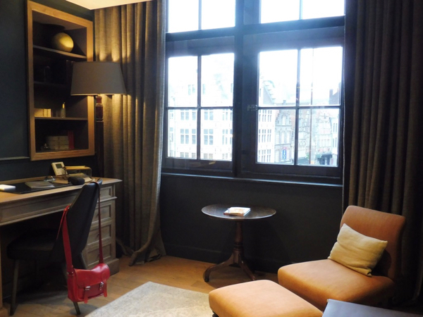 Dès que l’occasion s’est présentée, j’ai donc réservé pour un vendredi soir. J’étais très tentée par la The Letter, mais à 310€ hors taxe de séjour, elle était un peu hors budget. J’ai donc opté pour la The Carriage, une petite suite en duplex composée, en bas d’un salon avec bureau, fauteuil et guéridon, en haut, d’une chambre dont les fenêtres donnent sur la place Korenmarkt et d’une salle d’eau avec une très grande douche. Petit tour du propriétaire à notre arrivée: