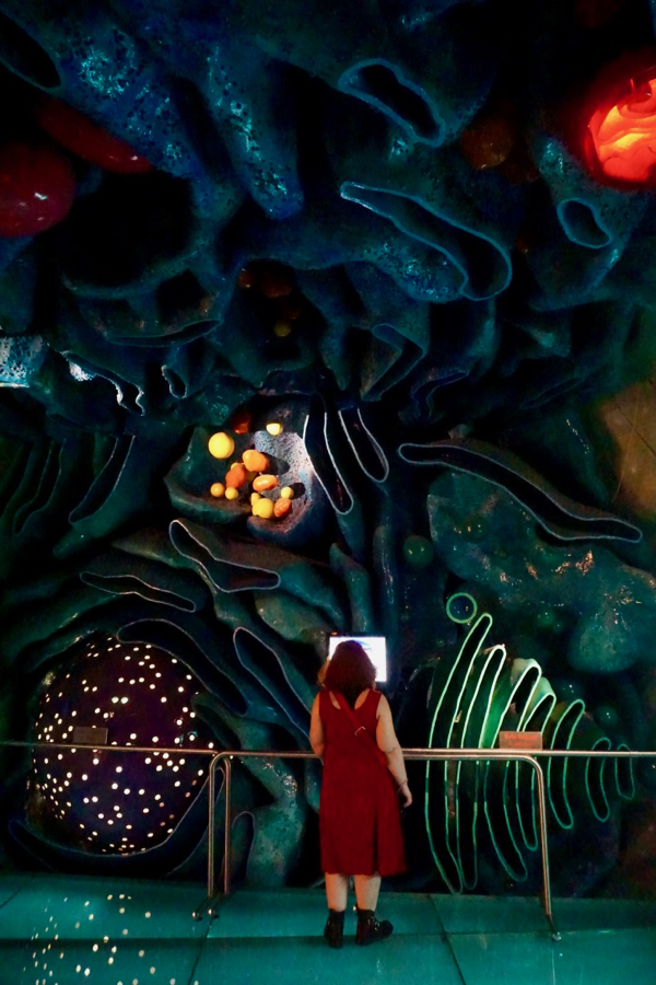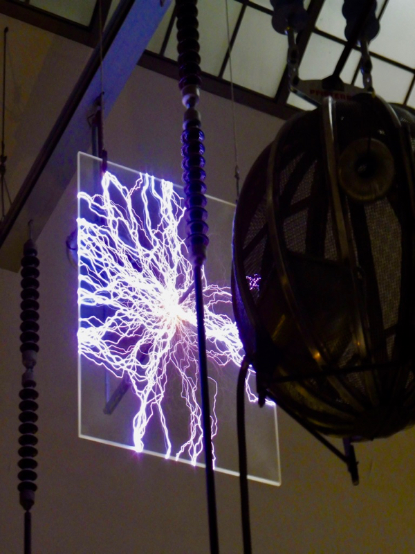 En océoanographie, nous admirons les vieux voiliers, le bathyscape jaune, le sous-marin U1 en coupe, la maquette du Titanic, les beaux instruments de navigation qui se passent de longs commentaires. En aviation, ça commence à coincer quand je me rends compte qu’aucun des textes d’accompagnement de la section réservée aux dirigeables et aux montgolfières (une de mes passions) n’est traduit en anglais. En pharmaceutique, tout m’intéresse mais il y a beaucoup trop de choses pour que je puisse ne serait-ce que parcourir des yeux la moitié des infos à disposition. (Chouchou prend néanmoins une chouette photo de moi à l’intérieur de la cellule géante.) En physique, tout est hyper-austère et en allemand uniquement. Même chose en environnement. A ce stade, je commence à regretter bien fort ma décision de venir. Quand je pense au merveilleux musée des sciences d’Oslo, si ludique et interactif… Ici, il y a une quantité phénoménale de pièces, mais l’ensemble est atrocement rébarbatif, indigeste et inaccessible pour les touristes étrangers qui semblent pourtant constituer un pourcentage non-négligeable des visiteurs. La goutte d’eau, c’est le spectacle sur l’électricité à haute tension: des expériences magnifiques, commentées uniquement en allemand sans même un pauvre prospectus en anglais pour les présenter en quelques lignes aux non-germanophones dans le public. Dégoûtés, nous jetons l’éponge et repartons une heure et demie plus tôt que prévu.