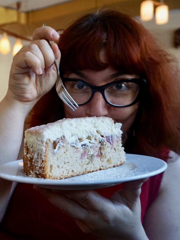 Nous longeons l’Isar où quelques jeunes bronzent sur une mince bande de béton qui émerge à peine des flots en crue et allons nous poser au Trachtenvogl, un café végan réputé pour ses 22 variétés de chocolat froid ou chaud. Je suis hyper tentée par un chocolat chaud au poivre, mais j’ai trop soif et envie d’une boisson fraîche pas trop sucrée: j’opte donc pour une limonade maison au sureau. Chouchou, en revanche, tente le milk-shake choco banane et décrète dès la première gorgée que c’est le meilleur qu’il a bu de toute sa vie. Nous passons une grosse heure vautrés dans les canapés en velours vert, lui à travailler sur son iPad et moi à lire un roman pas terrible en hésitant à l’abandonner en cours de route. Test du gâteau à la rhubarbe végan et sans gluten: dommage, il n’a pas de goût non plus.