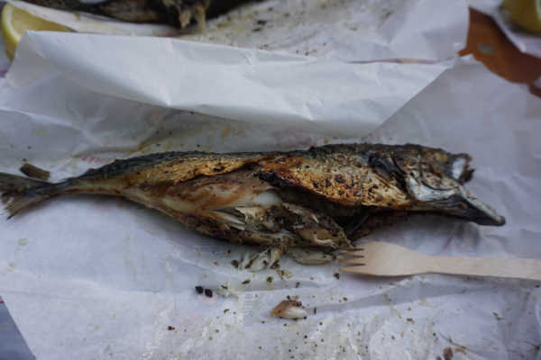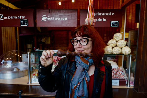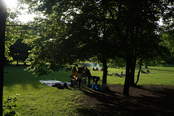 Descendus au beau milieu d’un quartier résidentiel modeste mais joliment agencé, nous marchons jusqu’au parc de Hirschgarten envahi d’autochtones qui ont apporté leur barbecue et font griller des saucisses sur les pelouses. Nous trouvons assez vite le biergarten déjà grouillant de monde. Surprise: j’avais imaginé le « poisson-sur-bâton » comme une sorte de fish stick géant; en réalité, ce sont des poissons entiers grillés. Il est censé y avoir de la truite, et je me dis: « Chic, ça me rappellera les vacances de quand j’étais petite et qu’on mangeait les poissons pêchés par mon père dans la Loire », mais en fait, il ne reste plus que du maquereau, dont l’odeur seule me soulève le coeur. Qu’à cela ne tienne; laissant mes trois acolytes autour d’une table, je vais faire la queue à la cafétéria de plein air pour une portion de hendel (poulet rôti servi avec des frites). En arrivant à la caisse, je me fais hurler dessus par la caissière mal embouchée parce que je n’ai pas de cash et qu’elle ne prend pas les cartes de paiement. Un peu choquée, j’abandonne mon assiette devant elle et rejoins les autres. M blonde a pitié de moi et s’en va récupérer mon dîner avec le liquide de Chouchou et son allemand parfait. Quand il ne reste plus que des arêtes, des os mal nettoyés et des chopes vides sur la table, nous évoquons nos souvenirs d’adolescence en rigolant jusqu’à ce que l’envie de sucré de Chouchou nous fasse partir en quête d’un dessert. Ce sera un mellow cake aux éclats de gaufre pour lui, une crêpe au sucre pour M brune et une brochette de fraises recouvertes de chocolat pour M blonde et moi – le tout servi par une dame très avenante qui compense la mauvaise impression laissée par son horrible collègue.