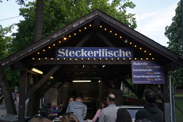 Nous repartons dans l’autre sens pour nous rendre à la bibliothèque publique où travaille M blonde, qui nous fait visiter les lieux avec une fierté palpable. Depuis le toit auquel seuls les employés ont accès, on voit les toits de la ville et un petit bout des Alpes. En attendant que M blonde ait fini sa journée, nous allons avec M brune boire un verre sur la terrasse des bains publics – un bel établissement Art Nouveau où j’avais envisagé d’aller faire trempette avant d’y renoncer à la vue des avis sur TripAdvisor. Il fait doux et ensoleillé; les oiseaux chantent, les arbres bruissent doucement au dessus de nous et on n’entend presque pas les voitures. Je suis sûre qu’il existe des moyens bien pires de tuer une heure. Puis nous allons prendre le métro pour nous lancer dans notre quête du jour: celle du meilleur « poisson sur bâton de Munich ».