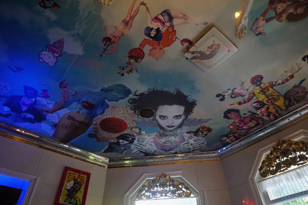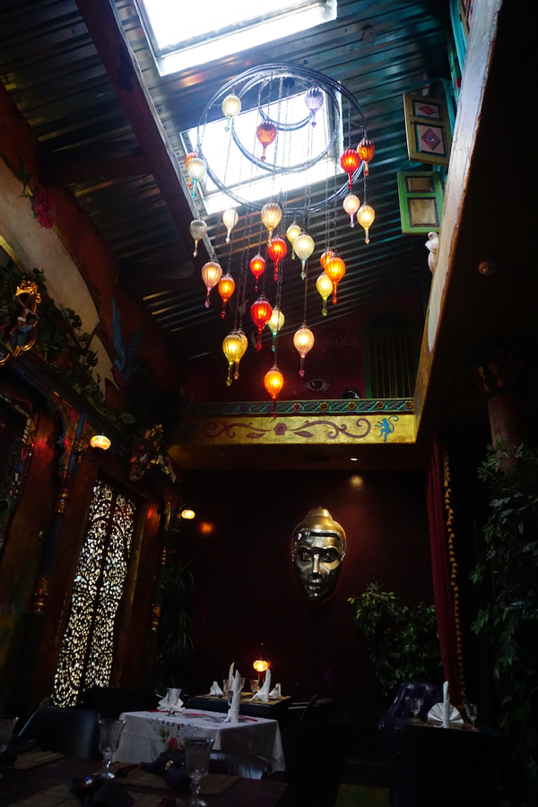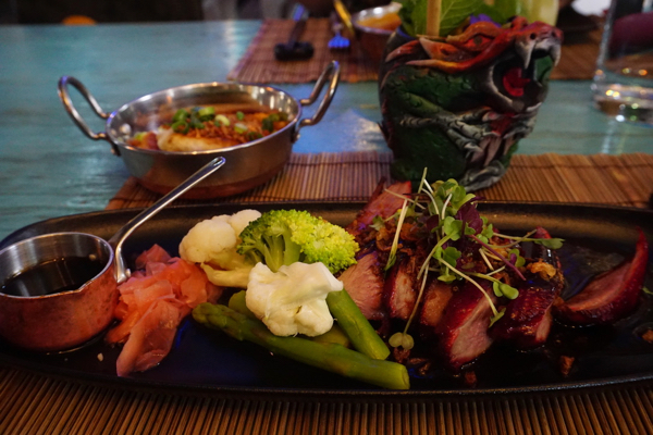 Nous finissons à la fois cette journée et ce séjour au Tai Boh, le restaurant frère du Manna La Roosa où nous avons si bien mangé jeudi. Situé à l’étage de la même magnifique maison, il n’est hélas pas climatisé, et je dégouline littéralement de transpiration à la table du fond que la serveuse nous a attribuée. Je demande s’il serait possible de nous rapprocher d’une des fenêtres grandes ouvertes, et après un « Désolée, c’est impossible, tout est réservé », on nous déplace finalement à une table pour quatre beaucoup mieux située. Ici aussi, la déco est complètement kitsch et délirante; ici aussi, les boissons comme les plats sont recherchés, bien présentés et délicieux. En fait, la seule fausse note, ce sont les quatre Français assis juste derrière moi, et dont je serais très étonnée que le domicile se situe à plus de 100 km de Monpatelin. Totalement sans gêne, ils parlent super fort et téléphonent pendant leur repas. J’ai un peu de mal à les ignorer. Néanmoins, je savoure mon canard au curry jaune comme le mérite sa sauce divine et me retiens de justesse de piquer le verre dragon en terre cuite du mocktail de Chouchou tellement je le trouve fabuleux.