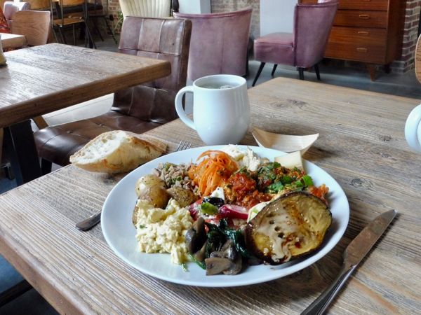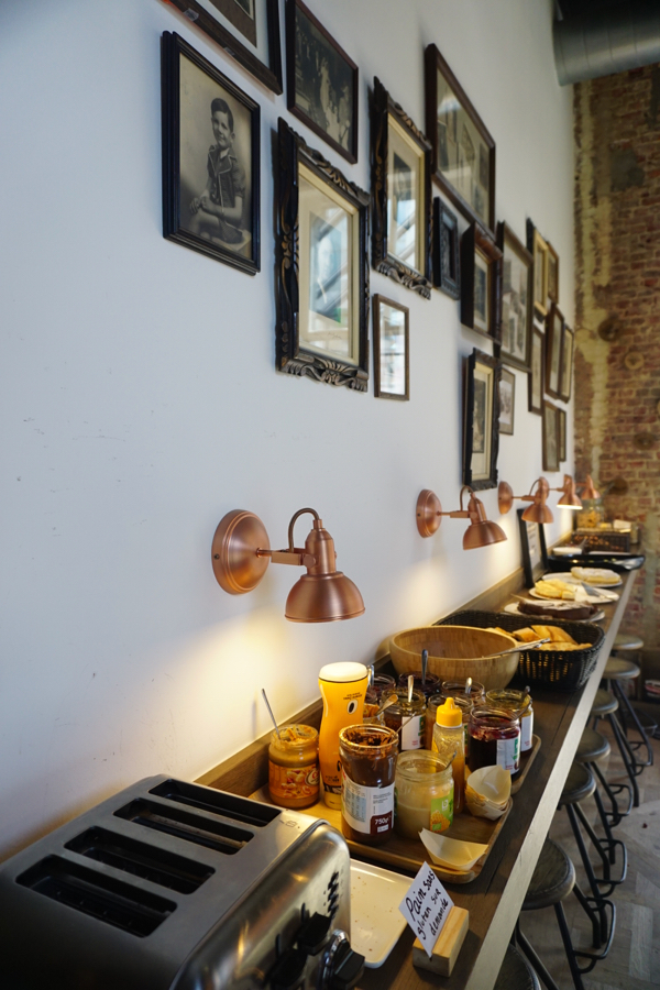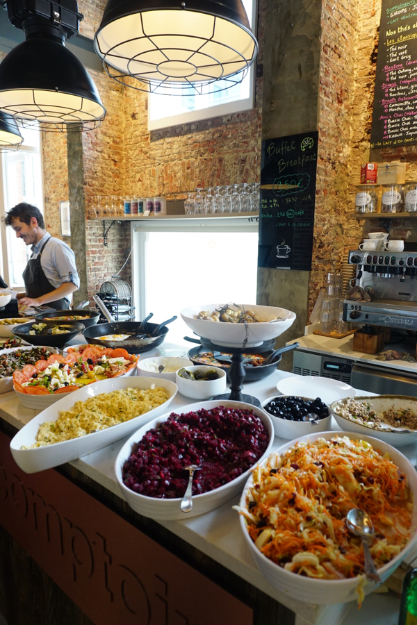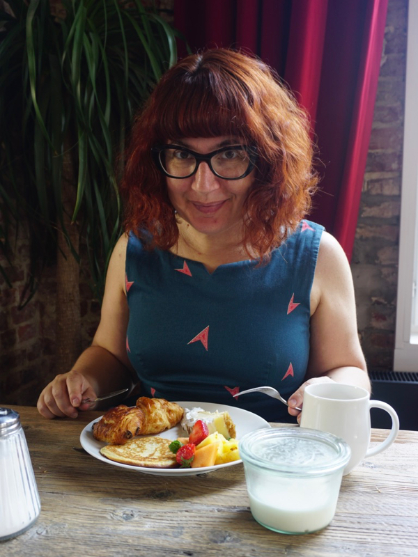 Bref, au final, le prix de ce brunch m’a paru tout à fait justifié. D’autant que j’ai adoré l’atmosphère de la salle: son plafond haut, ses murs de brique nue, la lumière qui entre à flots par les grandes fenêtres, la déco chaleureuse et confortable avant tout. J’ai même repéré un poêle devant lequel il doit être bon camper en hiver. Et puisqu’il y a du wifi, j’envisage de revenir très bientôt travailler ici un matin histoire de me goinfrer de ces divins mini-pains au chocolat profiter du buffet petit déjeuner. Une adresse que je recommande chaudement.