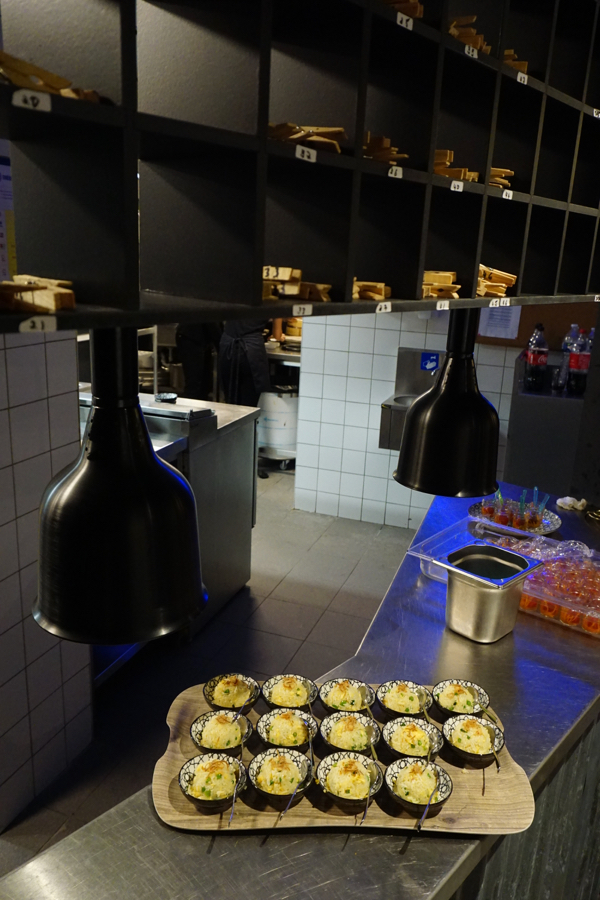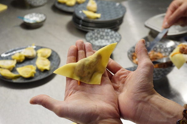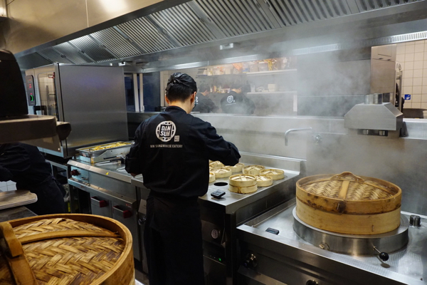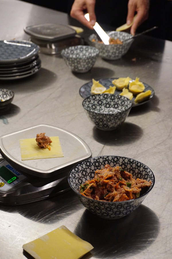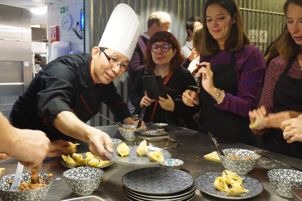 Pas de chamboulement du côté de la carte: le Dam Sum 2 propose les mêmes plats que son grand frère, soit un choix de bouchées vapeur confectionnés à la main dans leurs cuisines, probablement les meilleures et les plus authentiques que j’aie mangées en Europe. (Je suis moins fan de leurs riz et nouilles, un peu gras à mon goût). On y retrouve également leurs cocktails maison, un cran au-dessus de ce qu’on peut déguster dans la plupart des restaurants. Le soir de l’inauguration, des serveurs ont circulé pendant des heures avec un breuvage à la nectarine et au piment, si délicieux que j’ai dû me faire violence pour m’arrêter après le second. Mais je suis déjà assez peu digne à jeûn pour ne pas avoir envie de me montrer soûle en public. Les amateurs pouvaient également participer à un atelier de confection de raviolis avec des carrés de pâte tout prêts, de la farce à peser sur une petite balance (20 grammes, pas un de plus!), et une démonstration par le chef du coup de main à attraper pour sceller les bords et leur donner une belle forme joufflue. Je me suis contentée d’observer, et c’était déjà fort intéressant.