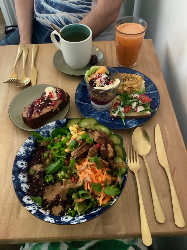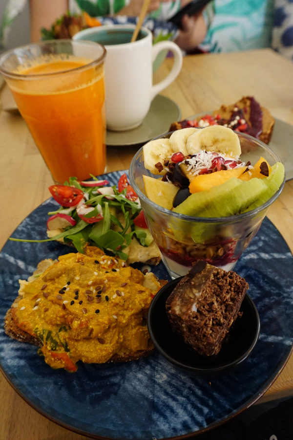 Nous arrivons vers midi et demie. La terrasse est pleine, mais on s’en fout: nous préférons manger à l’intérieur. Nous choisissons une table et consultons les menus en anglais qu’on nous a fournis, puis retournons commander et payer au comptoir. Pour Chouchou, ce sera une formule petit déjeuner M: jus frais au choix, thé Pukka ou café, granola aux fruits frais, deux toasts salés (un à l’houmous et un au tofu préparé façon « oeufs brouillés »), deux morceaux de gâteaux crus. Pour moi, un menu bowl avec Bouddha bowl chaud, jus frais au choix et gâteau cru au choix.