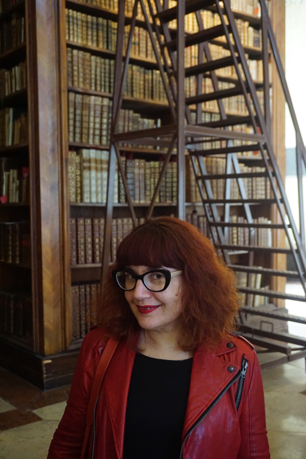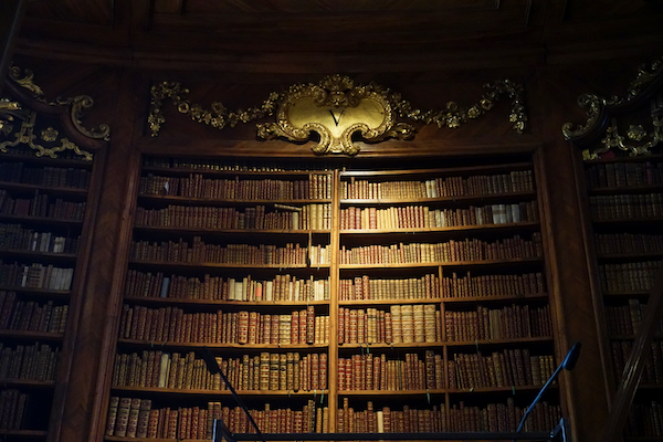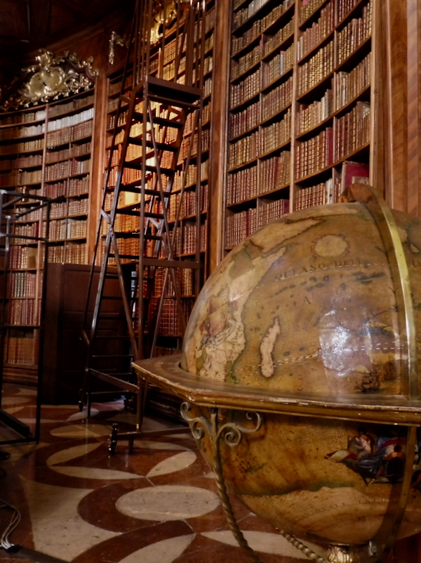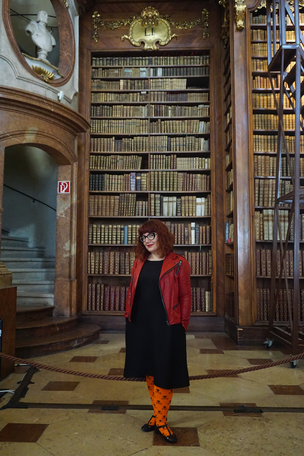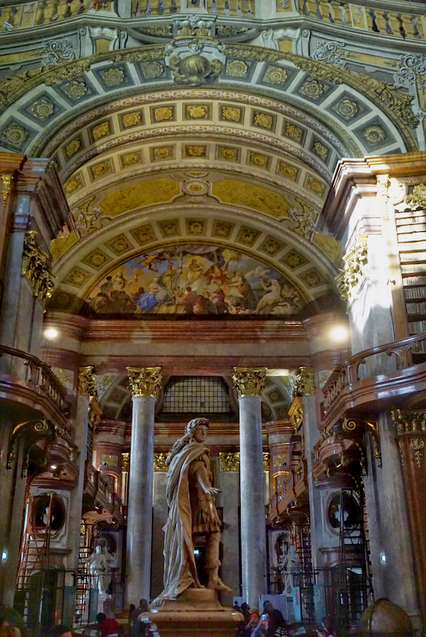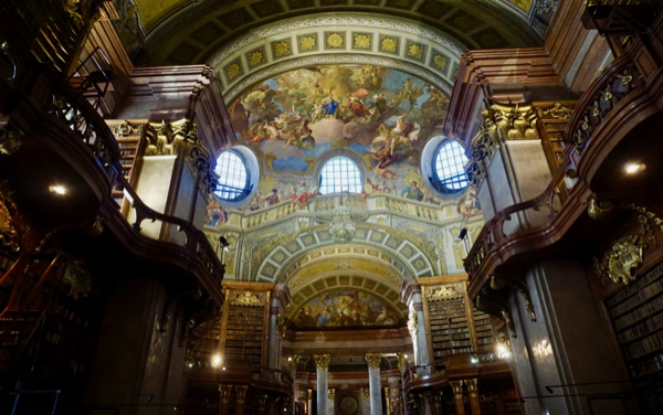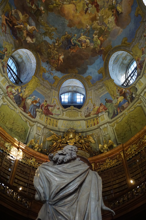 Dormir une heure de plus cette nuit fut appréciable, mais à vrai dire, nous sommes toujours claqués. Nous partons vers 10h45 et prenons le métro jusqu’à Stephensplatz, puis descendons à pied vers la Hofburg. La bibliothèque nationale d’Autriche est assez bien planquée, et malgré les plans qui pullulent, nous mettons un moment à en localiser l’entrée. Mais une fois dans la salle d’apparat, quel éblouissement! Je trouve ça encore plus magnifique que la bibliothèque du Trinity College à Dublin. Evidemment, pas moyen de s’approcher des livres, et encore moins de monter sur les grandes échelles roulantes ou d’accéder à la mezzanine depuis laquelle on doit se sentir comme le roi du monde. Mais la somme d’ouvrages antiques rassemblés là donne le tournis.