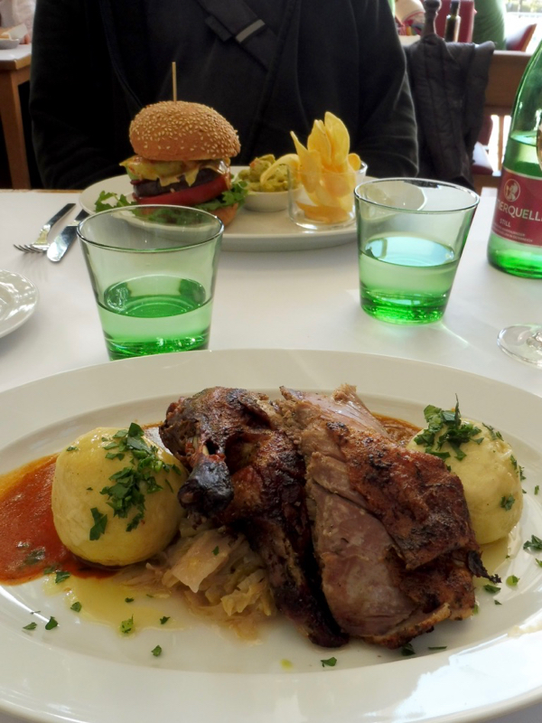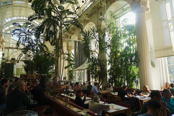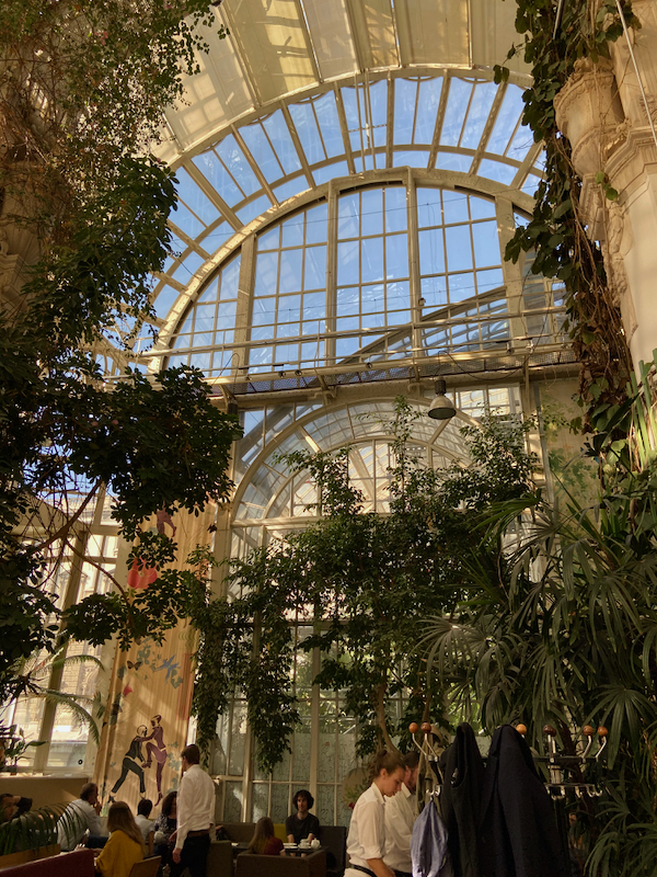 Pour le déjeuner, j’ai réservé chez Palmenhaus, une brasserie située à l’intérieur d’une serre très similaire à celle que nous avons visitée hier au palais de Schonbrunn. L’endroit est superbe, vraiment très agréable avec sa profusion de plantes et la belle lumière d’été indien qui pénètre à flot par les vitres. En revanche, Chouchou se déclare déçu par son burger végétarien, qui contient une rondelle de courgette et une autre d’aubergine d’un centimètre d’épaisseur chacune, plus un steak de falafel pas terrible. Pour une fois, j’ai fait un meilleur choix avec mon canard rôti, même si la cuisson par défaut est à point alors que je l’aime rosé. Service impeccable, mais addition est un peu salée pour ce que nous avons mangé. Venir juste boire un verre dans l’après-midi aurait été préférable.