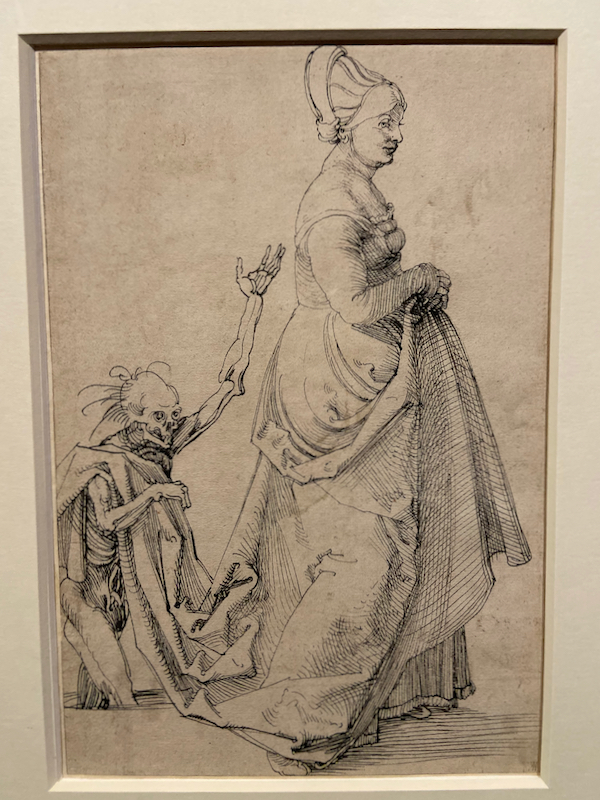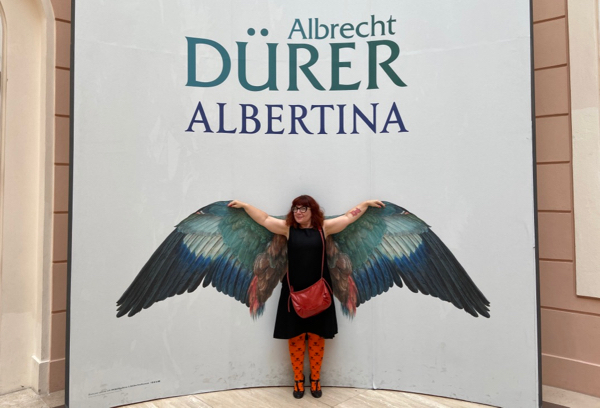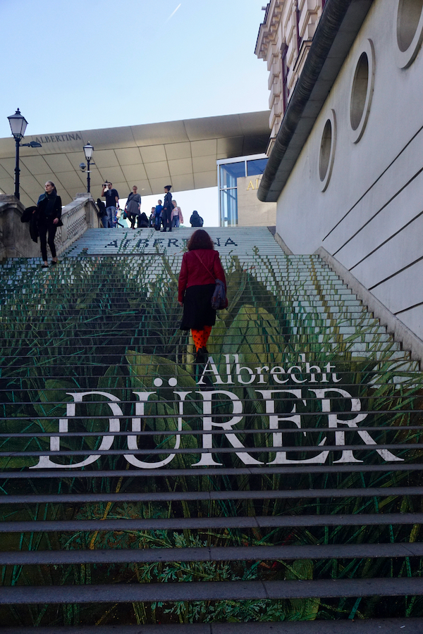 Tout près de là, l’Albertina nous tend les bras avec l’exposition consacrée à Albrecht Dürer dont les affiches nous ont assaillis dès notre descente d’avion. C’est une rétrospective ultra-complète du travail de cet artiste prolifique, à la technique souvent époustouflante de détail et de réalisme. Si ses oeuvres religieuses nous laissent indifférents, je reste en admiration devant ses dessins naturalistes hélas trop peu nombreux, tandis que Chouchou se délecte de ses croquis et tableaux les plus macabres. J’avoue cependant que 8 salles ultra-pleines avec beaucoup de choses à regarder et à lire, c’est un peu trop pour moi qui commence à décrocher vers la moitié. Nous faisons ensuite un tour rapide au 2ème étage où est exposée une collection privée assez fourre-tout, mais qui me fait découvrir quelques peintres du courant expressionniste viennois. Au sous-sol, l’expo temporaire consacrée à l’artiste féministe Maria Lassnig, qui a beaucoup travaillé sur les auto-portraits et la représentation du corps, me laisse plus que perplexe malgré un thème a priori accrocheur pour moi. Je crois que techniquement, l’écart est juste trop grand entre elle et Dürer!