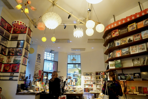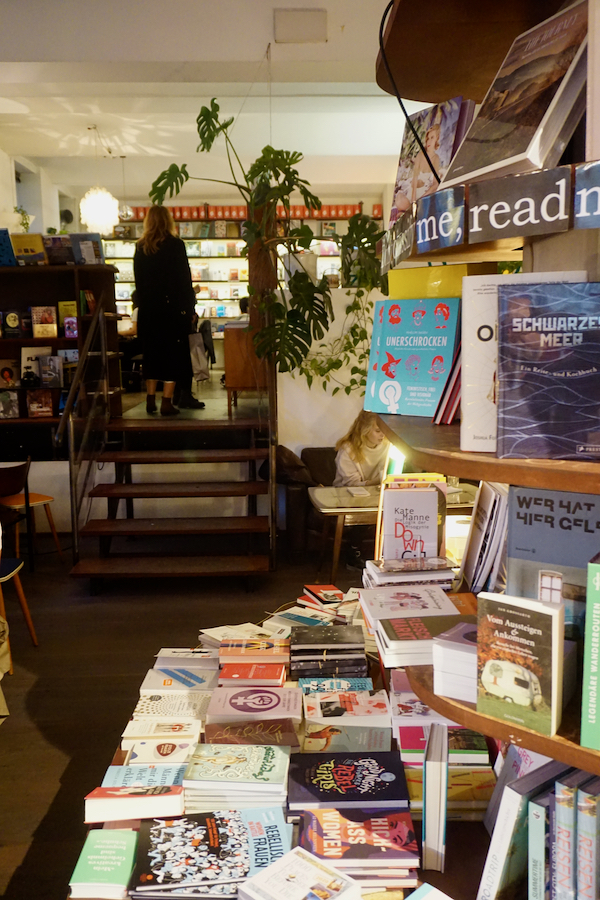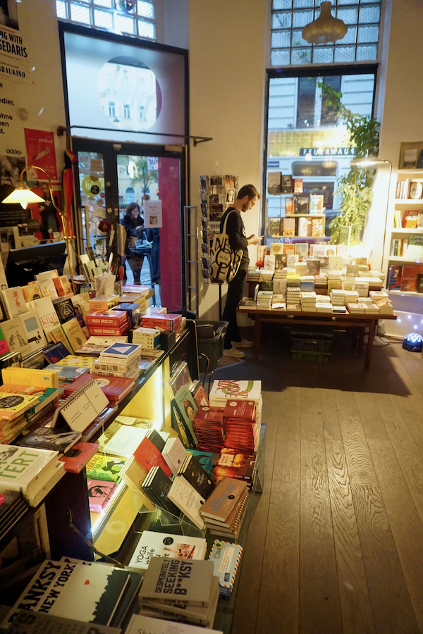Petit crochet par le musée d’histoire de l’art: l’amie de Chouchou qui gardait autrefois nos chats nous a demandé si nous pourrions passer à la boutique lui acheter un ouvrage qu’elle ne trouve pas à Bruxelles, et nous sommes bien entendu ravis de lui rendre ce service. Bien qu’on soit seulement en milieu d’après-midi, je ne me sens pas d’attaque pour enchaîner sur un second musée comme prévu, et nous allons nous poser au café-librairie phil qui grouille de monde en ce dimanche. Je sirote un délicieux jus pomme-cerise en mangeant un non-moins délicieux cheesecake. En revanche, le chocolat chaud italien est bien trop épais, lourd et sucré pour moi. J’ai malheureusement oublié mon mini iPad à l’appart’ ce matin, et n’ayant guère de quoi m’occuper, je flâne parmi les bouquins. Certains d’entre eux (surtout le livre illustré « Girlsplaining » au rayon féministe, juste à côté des « Culottées » de Pénélope Bagieu) me tenteraient beaucoup si seulement je comprenais l’allemand. Comme ce n’est pas le cas, je donne le signal du départ aux environs de 17h. La nuit tombe déjà, et je me réjouis d’avoir une soirée un peu plus longue que d’habitude devant nous.