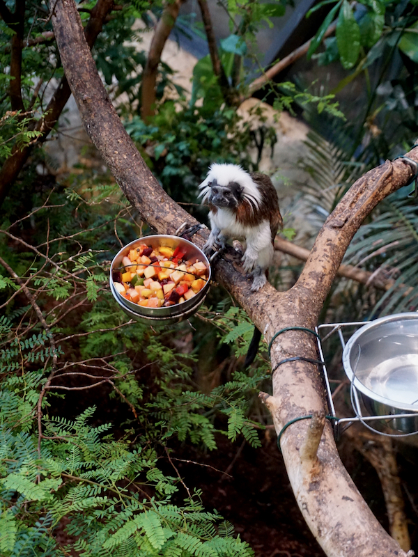 La grosse attraction du jour, ce sera la Haus des Meeres, un zoo terre-mer installé dans une ancienne tour de DCA haute de dix étages. Nous faisons une assez longue queue pour acheter nos billets d’entrée (l’option internet aurait exigé de disposer d’une imprimante…) et devons débourser près de 19€ par personne. Mais une fois à l’intérieur, je ne le regrette pas une seconde. Même les hordes de gamins hurlants et de parents qui me cognent dans les mollets avec leur putain de poussette* ne parviennent pas à entamer mon émerveillement face aux méduses boulet de canon devant lesquelles je reste en admiration plusieurs minutes, ou le poulpe solitaire que tout le monde se bouscule pour photographier. Quand nous pénétrons dans le Kroki Park, un milieu naturel reconstituée sur trois étages où des singes, des chauves-souris, des oiseaux et des tortues se promènent en liberté parmi les visiteurs, je ne me tiens plus de joie. Le nez en l’air, je manque me donner un torticolis à suivre le vol des roussettes pas du tout farouches qui frôlent le bonnet de Chouchou et mes cheveux. Je pousse des couinements ravis chaque fois qu’un petit gibbon (je crois) s’arrête sur la rambarde à vingt centimètres de mon bras. S’il ne faisait pas si chaud avec nos manteaux et nos pulls, je serais fichue d’y passer le reste de la journée.