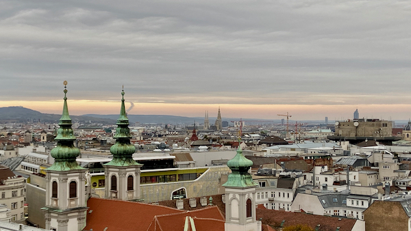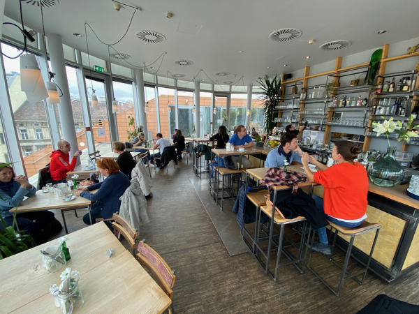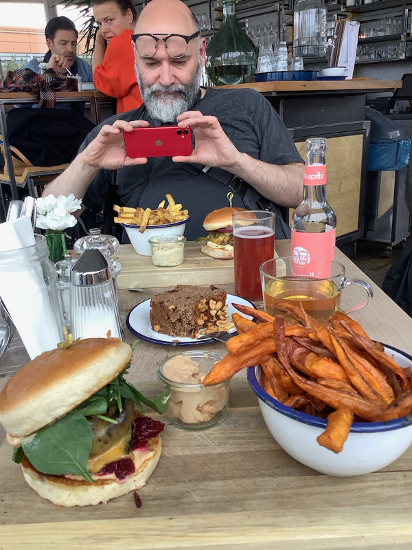 Après avoir racheté une carte de transports en commun illimités pendant 72h, nous filons bruncher chez Oben, au dernier étage de la bibliothèque municipale de Vienne (à ne pas confondre avec la splendeur visitée hier, où nul ne peut emprunter le moindre ouvrage). Pas de chance: le serveur ne retrouve aucune trace de ma réservation. Il m’explique que l’app que j’ai utilisée ne fonctionne pas et se répand en excuses. Du coup, j’imagine qu’il n’a plus une seule table de libre. Mais si. Deuxième hic, avec tout ce patakès, il est désormais 11h32, et le brunch n’était servi que jusqu’à 11h30. Le serveur se répand derechef en excuses. Nous piochons dans la carte des burgers: pour Chouchou, un cheeseburger classique, pour moi, un Kim-Jong Shroom végétarien avec Portobello, kimchi de betterave, pousses d’épinards, mayonnaise au miso et coriandre fraîche. 40 mn plus tard, nous attendons toujours notre commande. A court d’excuses, le serveur nous apporte une part de carrot cake offerte par la maison et promet que nos burgers seront là dans 5 minutes. Ce fut laborieux, mais nous nous régalons tous les deux.
