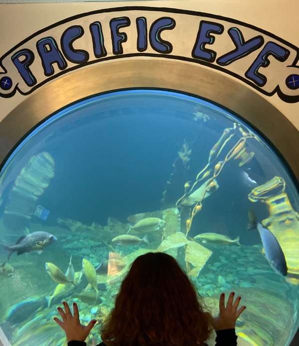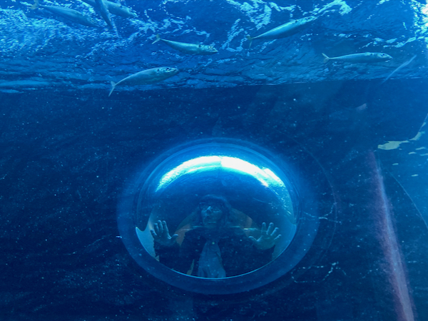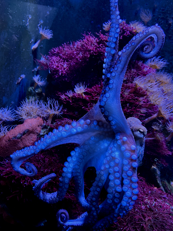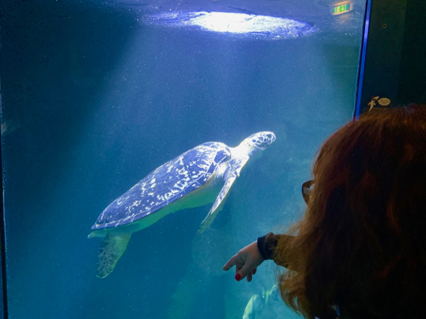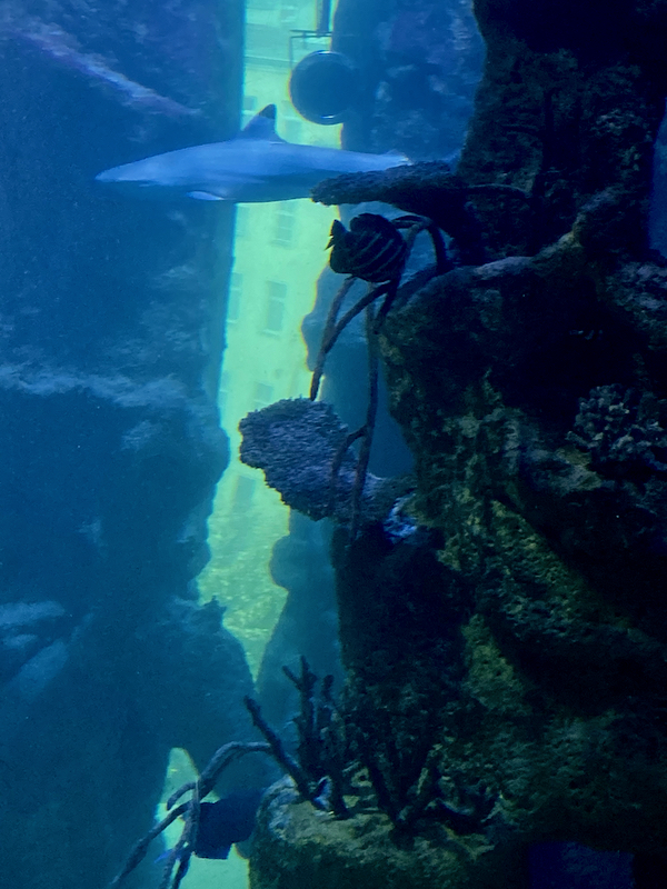Les étages supérieurs, vers lesquels nous continuons à grimper à pied, abritent de moins en moins de choses. Je remarque tout de même quelques araignées magnifiques qui feraient hurler bien des gens de ma connaissance. Au fond d’un grand aquarium, dans la trouée entre deux récifs, on aperçoit l’avenue à travers la paroi vitrée de la tour. C’est assez surréaliste de voir des requins passer tranquillement devant des rangées d’immeubles néo-classiques… La beauté d’une énorme tortue de mer me coupe le souffle. Elle s’appelle Puppi; elle est ici depuis 40 ans, et je ne sais pas si je dois m’en attrister ou me dire qu’au moins, elle n’a pas fini étouffée par du plastique dans l’océan où elle aurait dû vivre libre. Nous montons jusqu’en haut du bâtiment, où se trouve une plateforme d’observation actuellement en travaux. La moitié de terrasse à laquelle nous pouvons accéder nous offre une vue magnifique sur les toits de la ville. Redescente en ascenseur et achat à la boutique d’un petite poulpe en peluche aussitôt baptisé Albrecht.