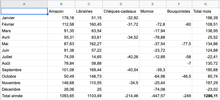 Début 2019, j’ai eu envie de mesurer combien je dépensais exactement en livres. Je me suis donc créé un petit tableau pour noter au fur et à mesure mes achats sur Amazon ou en librairie, ainsi que mes reventes sur Momox ou en bouquinerie – car faute de place ou d’étincelle de joie à leur vue, je conserve très peu d’ouvrages après les avoir lus.