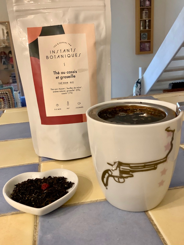 Dans l’ensemble, je consomme surtout des thés verts natures ou délicatement parfumés, mais j’avoue que l’après-midi, je ne dédaigne pas un robuste Earl Grey ou un noir aux fruits rouges pour compenser le coup de barre de 16h30. Le cassis est l’une de mes saveurs préférées, tout droit remontée de mon enfance et du sirop que préparait mon grand-père maternel avec les baies cueillies au fond de son jardin. Et au long de l’année écoulée, j’avais été super sage en matière d’achats de thé, vidant mes stocks et ne rachetant que les variétés que je buvais régulièrement. J’étais donc enchantée de me faire ce petit plaisir!