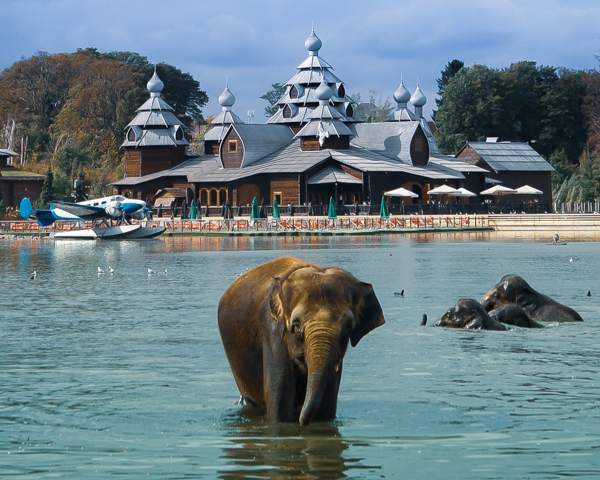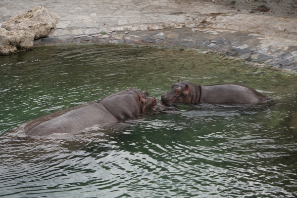 Après ça, nous quittons la chambre où j’aurais bien élu domicile en laissant nos bagages, que le personnel rapportera aux tipis pour nous. Je veux retourner à l’enclos des hippopotames que nous avons à peine aperçus hier et pas du tout ce matin. Nous patientons en vain un bon moment. Puis, à la seconde précise où nous tournons les talons, nous entendons le bruit caractéristique d’une grosse tête qui émerge de l’eau en soufflant. Une? Non, trois! Toute la famille: Papa, Maman et le petit né au début de l’année. Même s’ils restent dans leur bassin, nous prenons plaisir à les voir sortir brièvement le museau pour respirer, se faire un petit câlin et replonger aussitôt. Je me réjouis de ne pas repartir bredouille d’hippopotames.