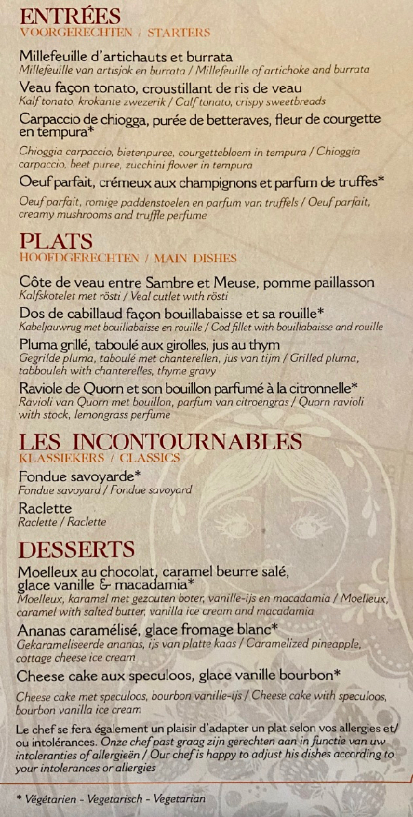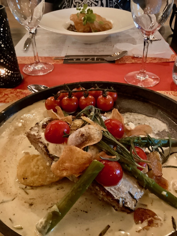 Nous faisons encore un tour dans le parc avant la fermeture. Puis nous nous rendons à l’Izba, le grand restaurant de la Terre du Froid, où nous avons réservé pour dîner à 18h30. Nous avons déjà mangé là lors de notre visite précédente, et je ne garde pas un souvenir impérissable de leur buffet habituel. Je suis donc ravie de découvrir que nous aurons droit à un repas entrée/plat/dessert servi à table, et encore plus ravie de parcourir le menu très alléchant. Covid oblige, les groupes de convives sont très éloignés les uns des autres, ce qui nous permet de converser sans être embêtés par la proximité de nos voisins. Je me régale d’un oeuf parfait qui porte bien son nom, d’une côte de veau très joliment présentée et d’un délicieux ananas caramélisé à la glace au fromage blanc. L’atmosphère est calme mais agréable, et nous passons un très bon moment.