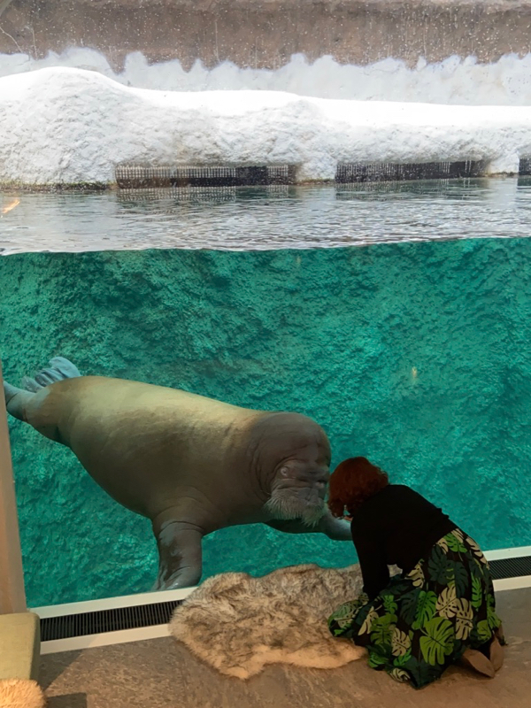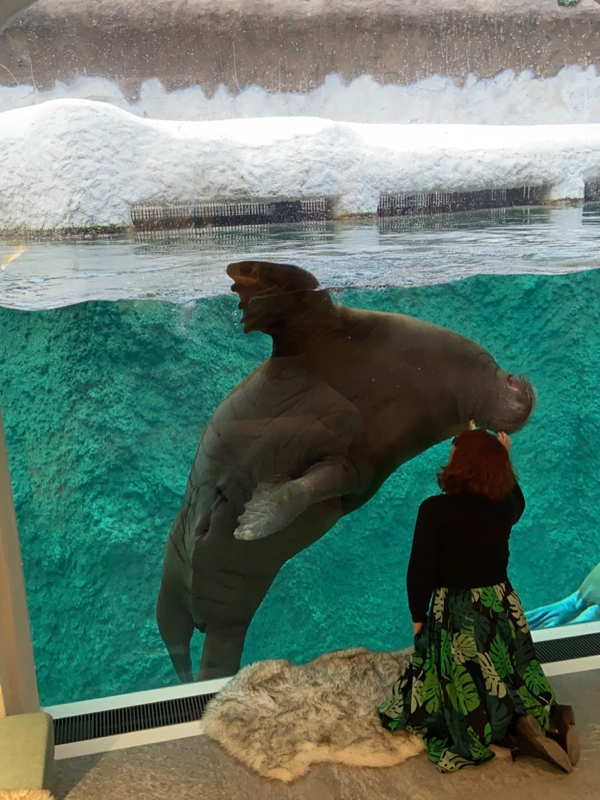 Nous regagnons notre chambre pour y passer une dernière heure avec les morses. Le gros mâle décidément très curieux s’approche de la vitre, y colle son visage pour m’observer et donne de petits coups de tête comme pour réclamer une grattouille. Je suis presque en transe de ravissement; ces quelques minutes resteront longtemps gravées dans ma mémoire.