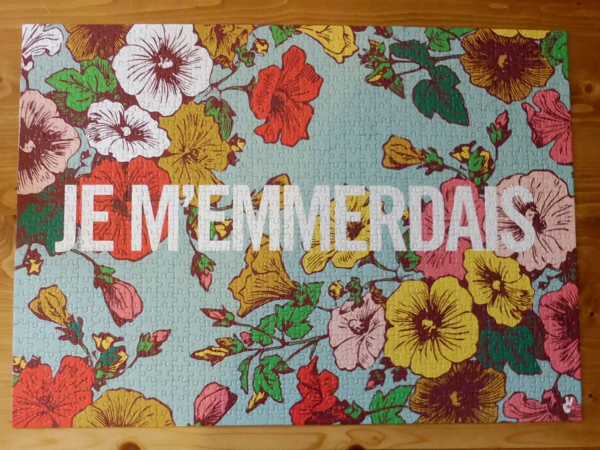 ★ Après m’être beaucoup battue avec la soixantaine de pièces uniformément bleu ciel qui restaient, je termine enfin mon puzzle Piece & Love. Jamais je n’avais passé autant de temps sur un modèle. N’ayant pas l’intention de le garder, je propose de le donner sur Instagram, et en moins d’une heure, trois personnes intéressées se manifestent. Le gros mot en kit, ce segment de marché sous-exploité.