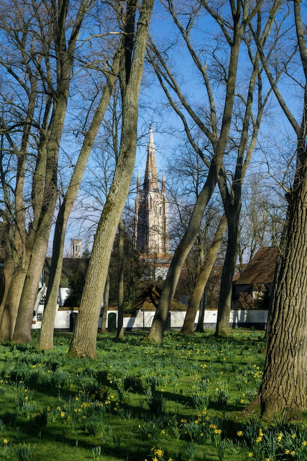 Le lendemain matin, nous nous sommes dirigés sans nous presser vers le béguinage que nous n’avions jamais visité. Il y avait un peu plus de monde que la veille, mais rien de bien méchant. Les pelouses étaient piquetées de jonquilles, et malgré la fraîcheur de l’air, ça sentait déjà le printemps. Nous avons savouré le calme et la douceur de ce moment avant de nous engager dans une grande rue en travaux où un restaurant proposait des nouilles asiatiques à emporter. Nous avons emporté nos deux barquettes de pad thai (moins bon que celui de Chouchou, mais soit) jusqu’à l’église voisine, et de nouveau, nous avons pique-niqué sur un banc au soleil en songeant que nous vivions des temps décidément étranges…