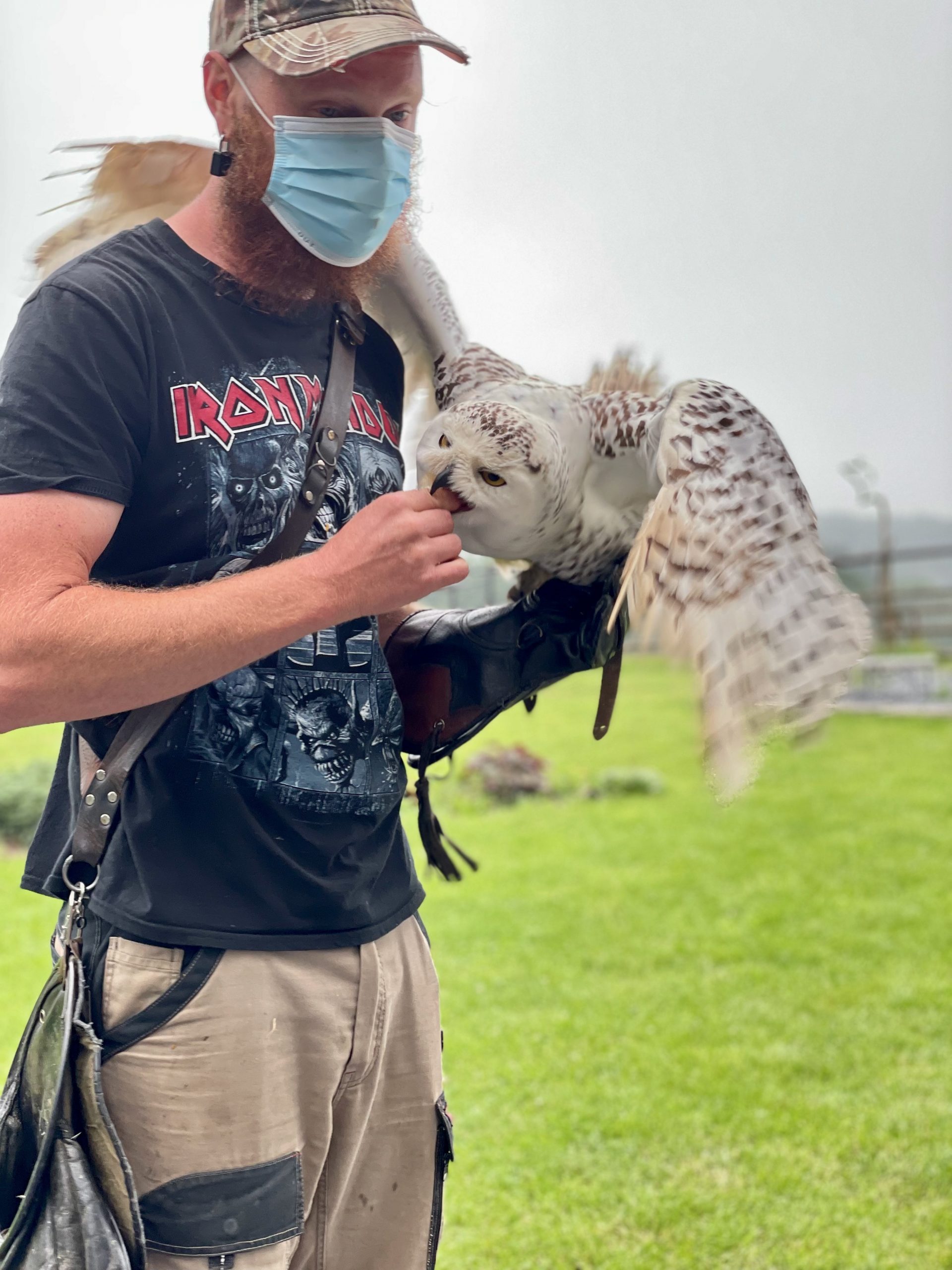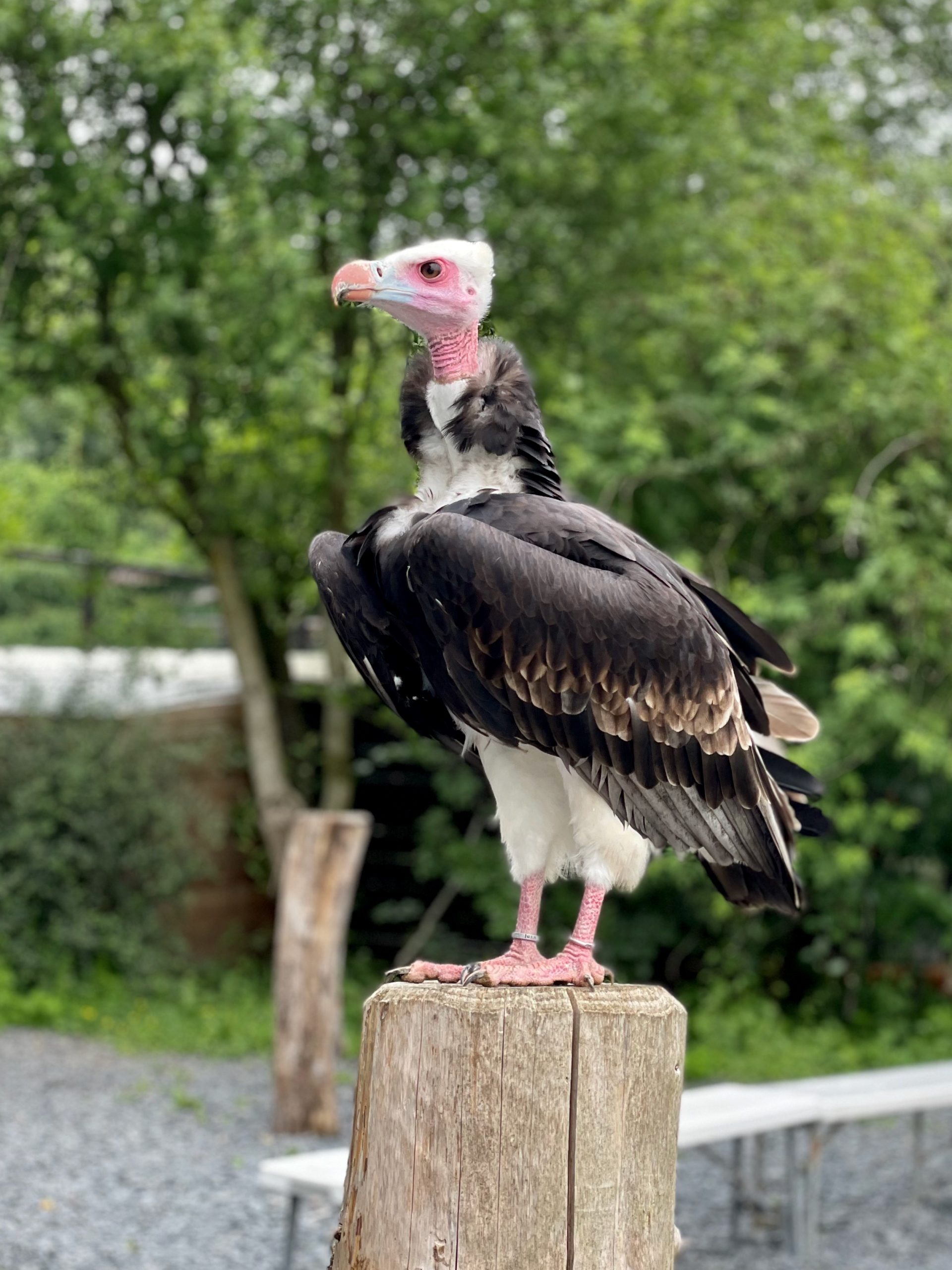 Arrivés un peu en avance, nous prenons tout notre temps pour faire le tour des volières. Il nous semble que les installations se sont développées et améliorées depuis notre première visite, et nous nous disons que Steph et Wouter ont dû s’occuper à ça pendant les longs mois de fermeture. En réalité, ils n’ont pas fait de travaux faute de sous: ils ont juste instauré un sens de visite à cause du Covid et changé certains oiseaux de place. Je retrouve mon filleul Guy dans une cage avec quatre autres minuscules chouettes des terriers parmi lesquelles j’ai du mal à le reconnaître. Je pousse des piaillements de joie en identifiant d’autres oiseaux, notamment l’impressionnant vautour à tête blanche Mowgli (qui appartient à une espèce en voie de disparition à cause des superstitions dans son habitat naturel) ou Pepper l’aigle bleu du Chili qui n’y voit que d’un oeil. Une bénévole qui n’était pas là la dernière fois est en train de s’affairer dans les volières. Veinarde. Si j’habitais plus près, je supplierais Steph et Wouter de me laisser venir une journée par semaine pour leur donner un coup de main.