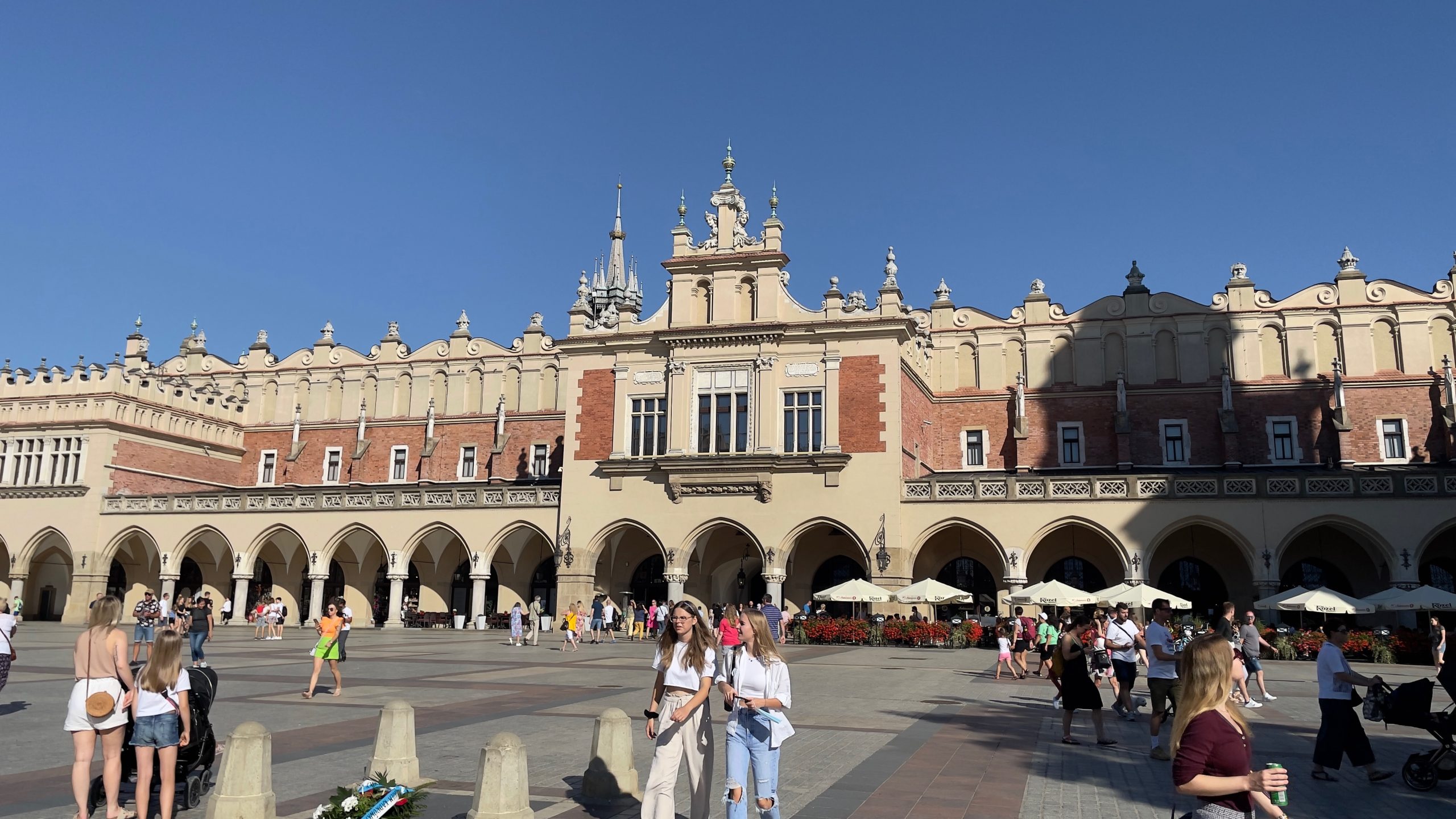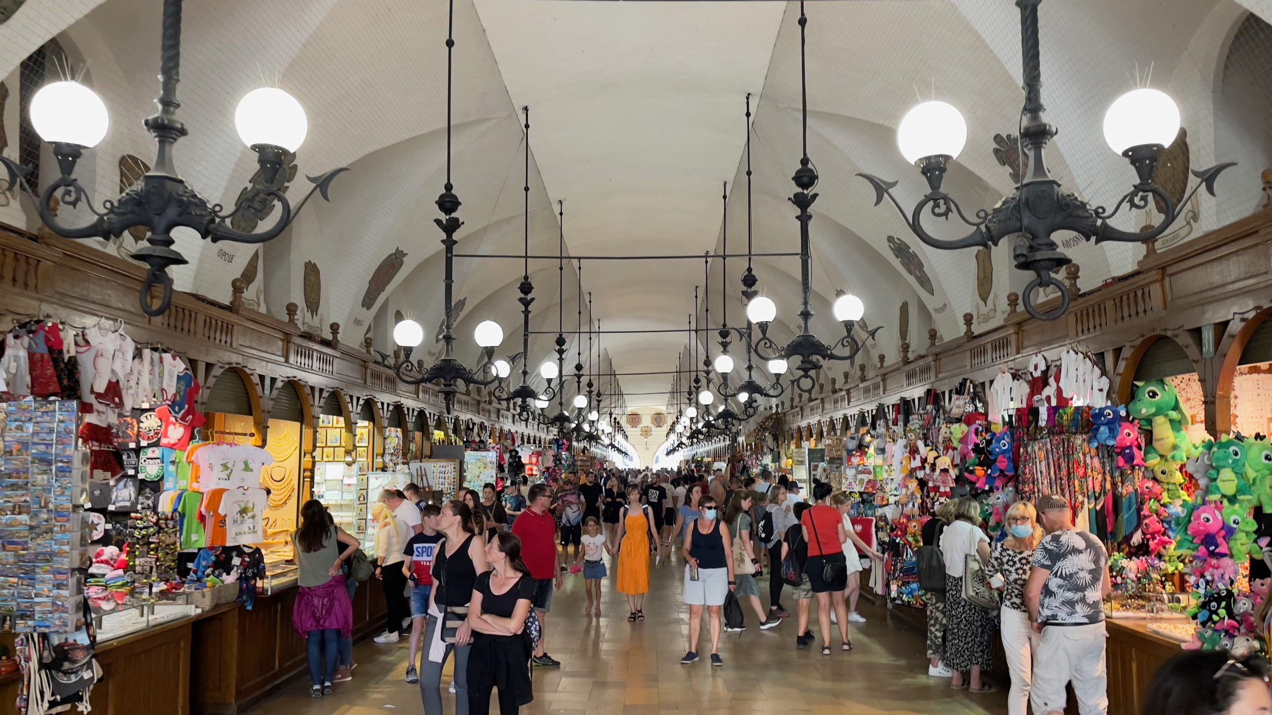 Vers 16h30, propres et vêtus de frais, nous sortons pour une première exploration. Il fait 27° (au moins deux de trop pour moi), et je suis abasourdie de trouver les rues de la vieille ville grouillantes de monde. Pas un poil d’ombre sur la grande place du Rynek. Nous voulons nous réfugier dans les anciennes halles aux draps, mais elles sont bondées de gens sans masque et bordées d’affreuses boutiques de souvenirs. Grâce à ces dernières, nous découvrons néanmoins que si l’emblème de Varsovie est une sirène, celui de Cracovie est… un dragon. Et pour Gdansk, une licorne, peut-être?