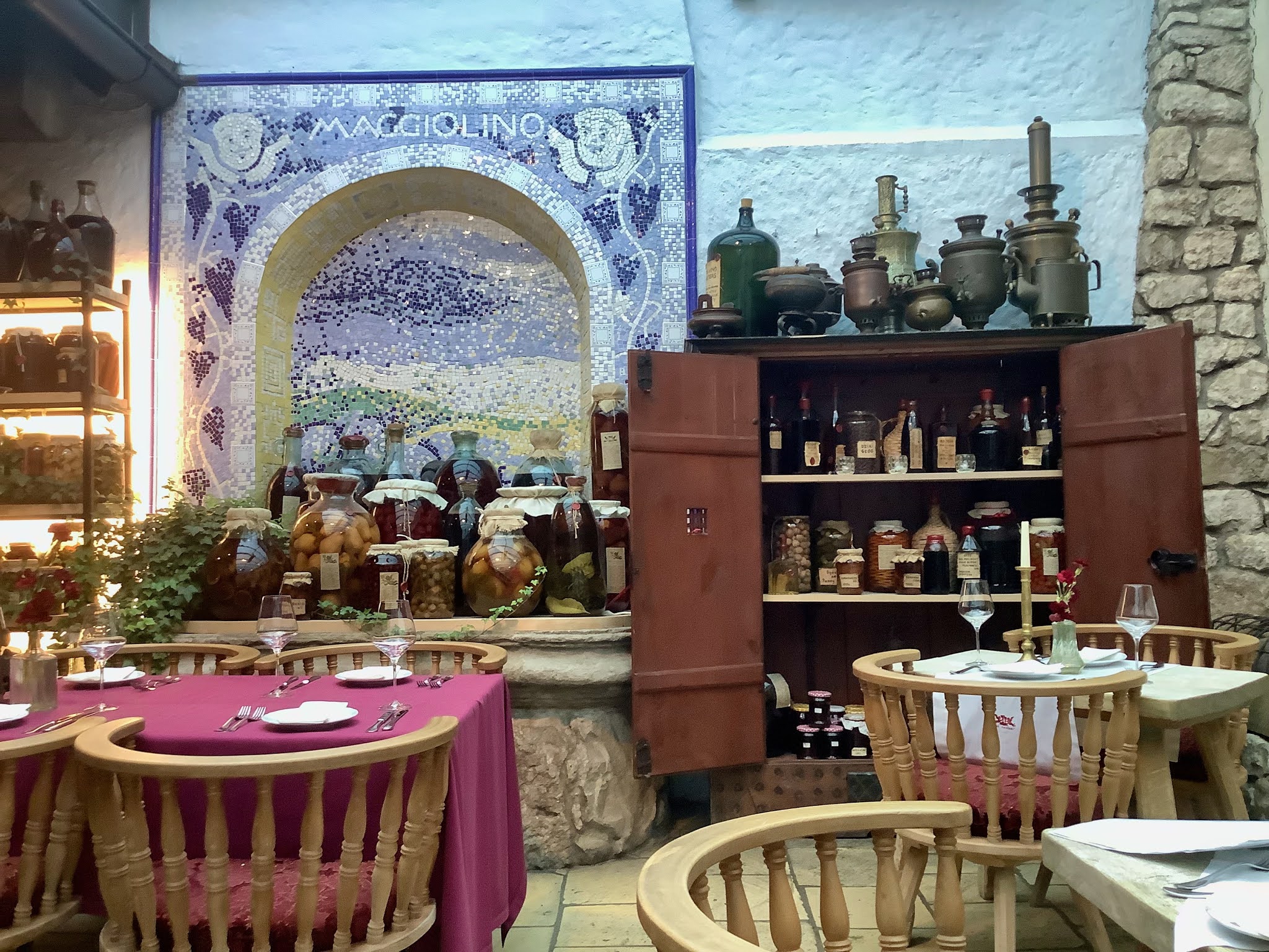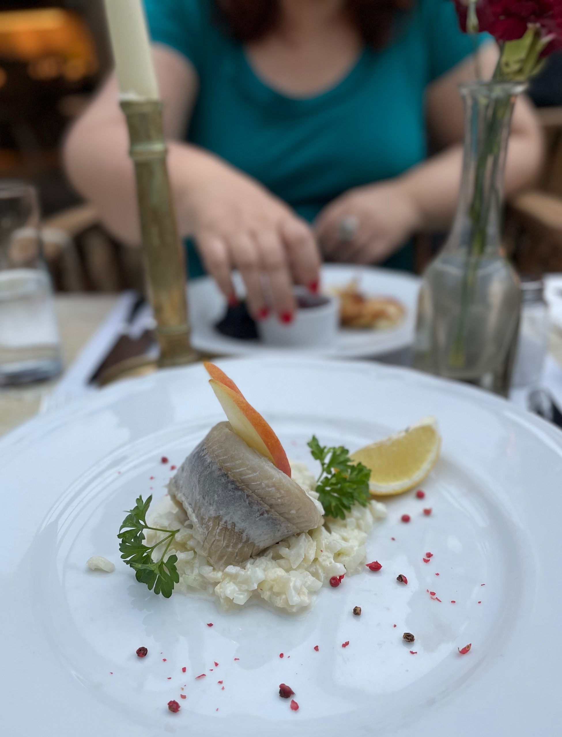 Du coup, nous décidons de passer directement à l’étape « dîner de bonne heure ». Mais les jolies terrasses sont déjà prises d’assaut, et quand je demande si le resto un peu chic spécialisé dans la viande d’oie fumée aurait une table libre pour nous, le serveur me toise le long de son nez et lâche du bout des lèvres que c’est complet avant de s’éloigner sans attendre ma réponse. Ca fait vraiment envie. Sentant monter ma frustration, Chouchou suggère qu’on retourne dans notre quartier où il a repéré un thai d’apparence sympa. Alors que nous redescendons la voie royale (oui, la configuration ici est exactement la même qu’à Varsovie), nous passons devant une enseigne de style moyenâgeux qui m’interpelle. A tout hasard, je demande si ce serait possible de dîner: la réponse est oui! La serveuse nous entraîne vers un joli patio où il fait agréablement frais et où il reste encore plein de place.