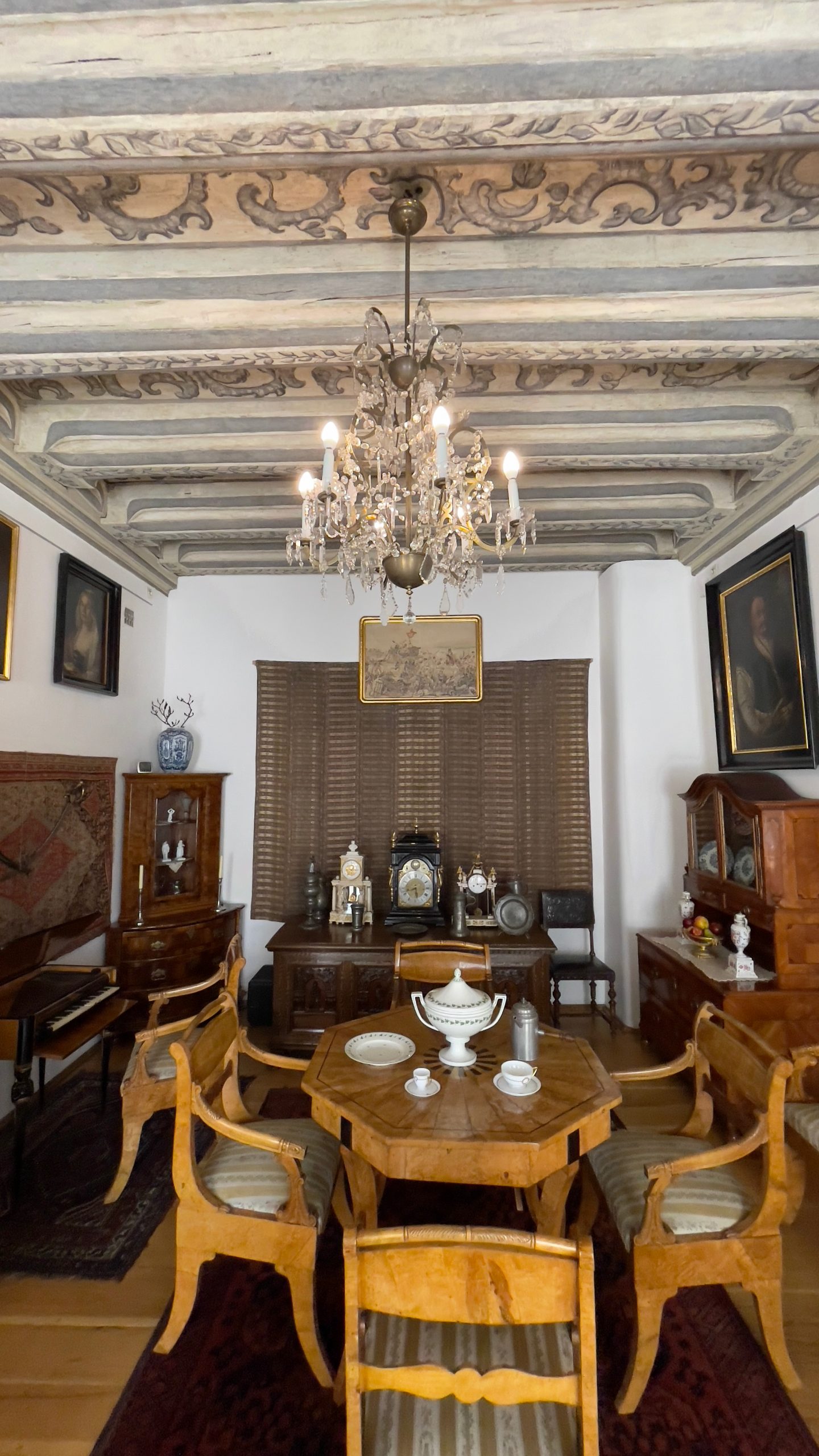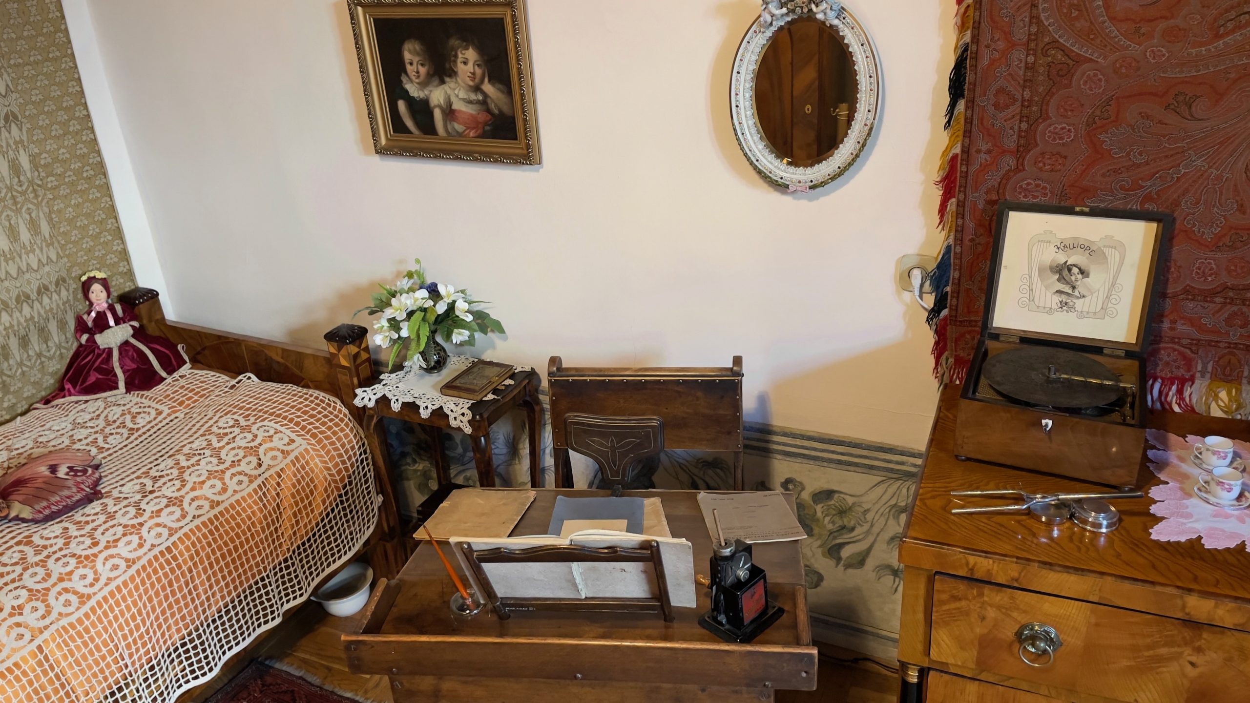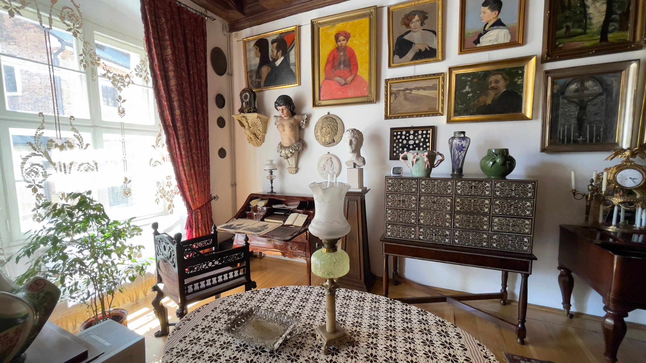 Nous nous dirigeons ensuite vers la Maison Hipolit, aménagée en musée qui témoigne du style de vie de la bourgeoisie polonaise à partir du 17ème siècle. La déco hyper chargée me fait saigner les yeux; si j’avais dû vivre entre ces murs, elle m’aurait donné des cauchemars. Je note combien les lits sont courts: même mon mètre cinquante-quatre aurait du mal à y dormir à l’aise. Je relève aussi la présence, sur le bureau de la jeune fille de la maison, d’un soutien-menton destiné à garantir sa bonne posture. Seuls un petit fauteuil avec un dossier en forme de coquillage et le coin du salon dressé pour le thé avec de jolies tasses en porcelaine trouvent grâce à mes yeux. Sans même parler de l’électricité et de la plomberie moderne, je suis bien contente d’être née à la fin du 20ème siècle! (Oui, malgré les papiers peints à fleur orange et marron absolument atroces qui ornaient les murs des appartements français dans les années 70.)