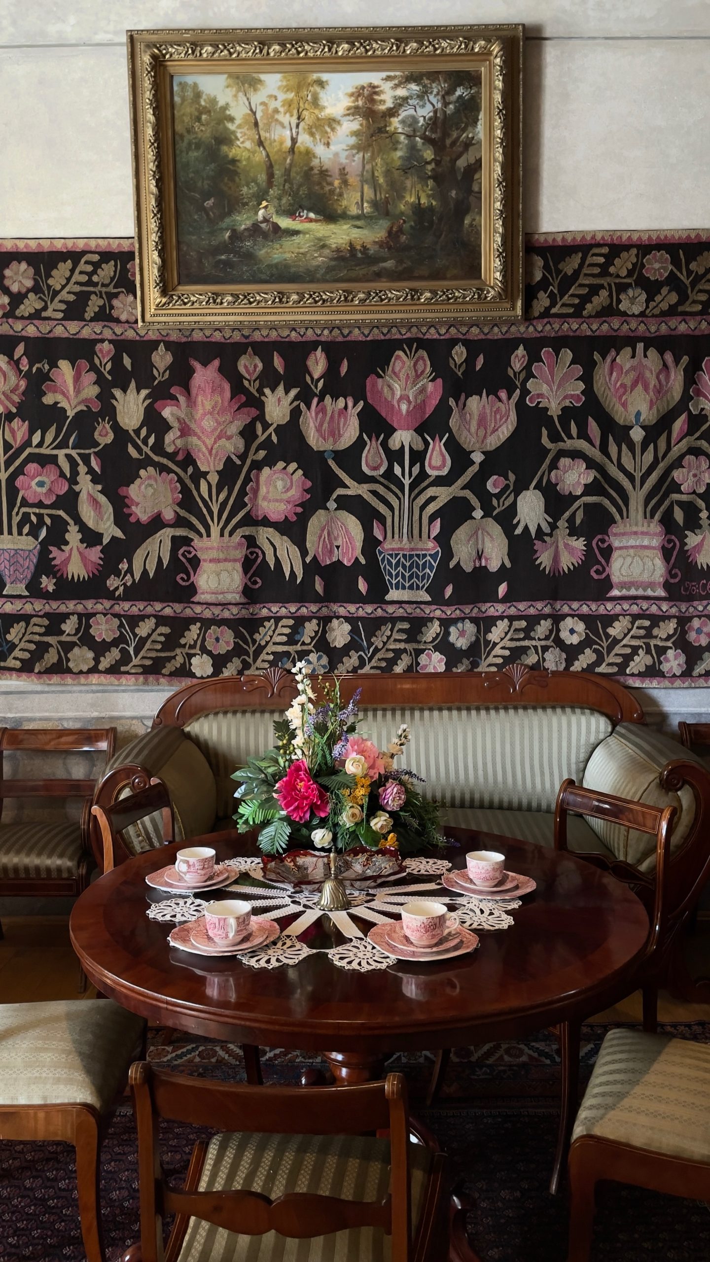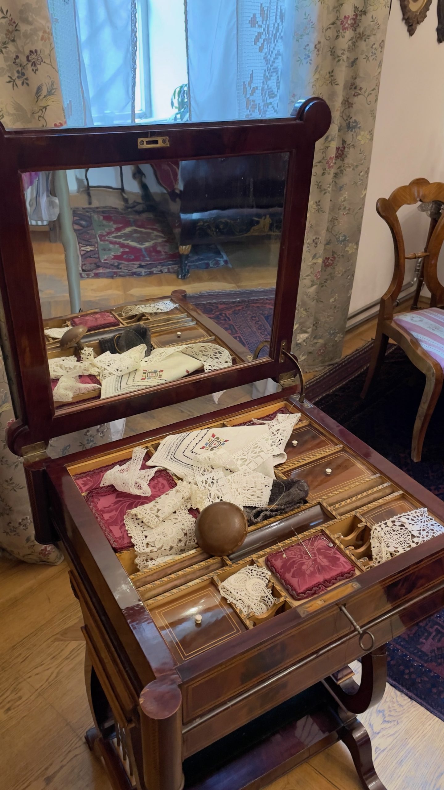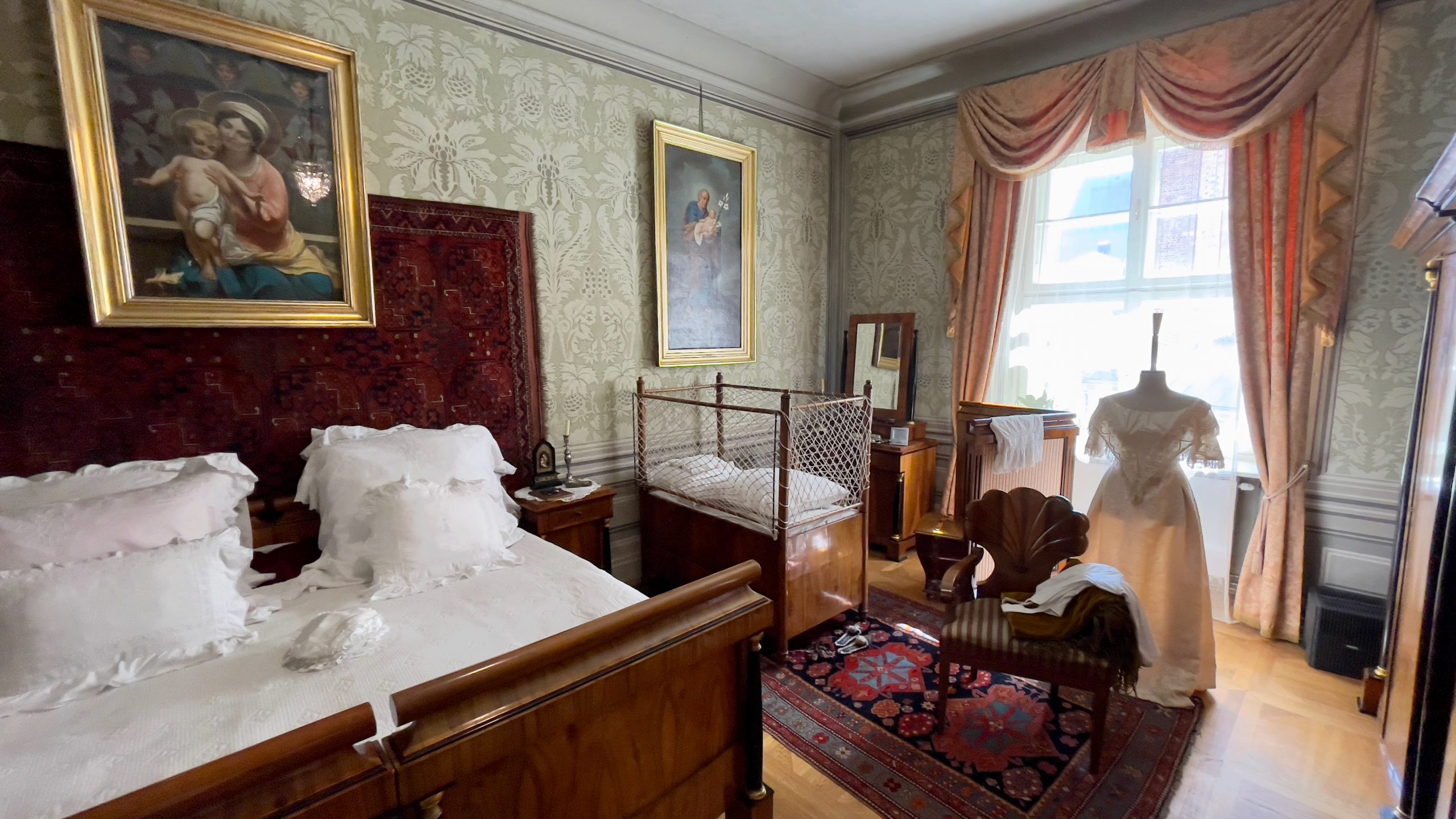 Nous nous dirigeons ensuite vers la Maison Hipolit, aménagée en musée qui témoigne du style de vie de la bourgeoisie polonaise à partir du 17ème siècle. La déco hyper chargée me fait saigner les yeux; si j’avais dû vivre entre ces murs, elle m’aurait donné des cauchemars. Je note combien les lits sont courts: même mon mètre cinquante-quatre aurait du mal à y dormir à l’aise. Je relève aussi la présence, sur le bureau de la jeune fille de la maison, d’un soutien-menton destiné à garantir sa bonne posture. Seuls un petit fauteuil avec un dossier en forme de coquillage et le coin du salon dressé pour le thé avec de jolies tasses en porcelaine trouvent grâce à mes yeux. Sans même parler de l’électricité et de la plomberie moderne, je suis bien contente d’être née à la fin du 20ème siècle! (Oui, malgré les papiers peints à fleur orange et marron absolument atroces qui ornaient les murs des appartements français dans les années 70.)