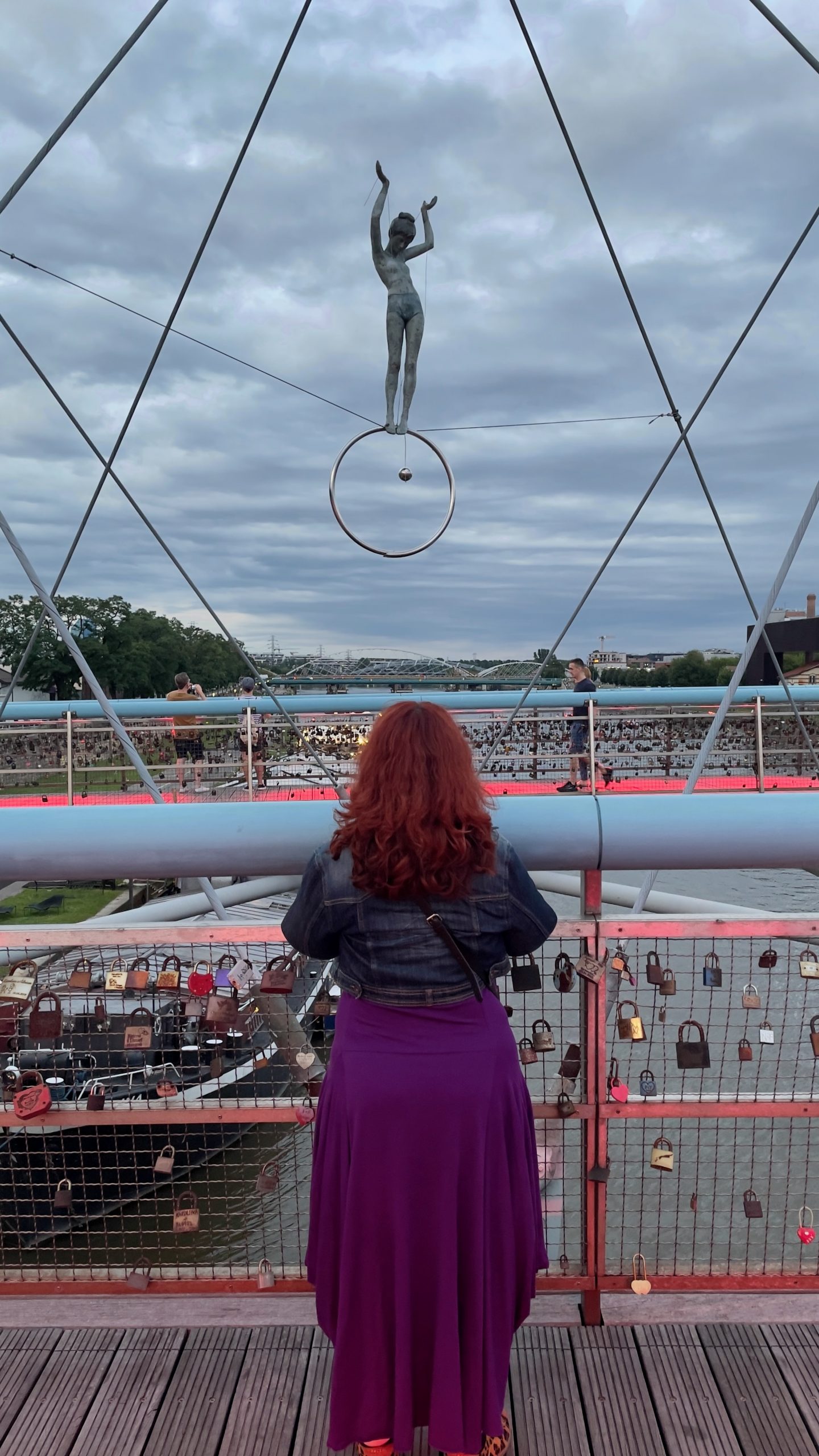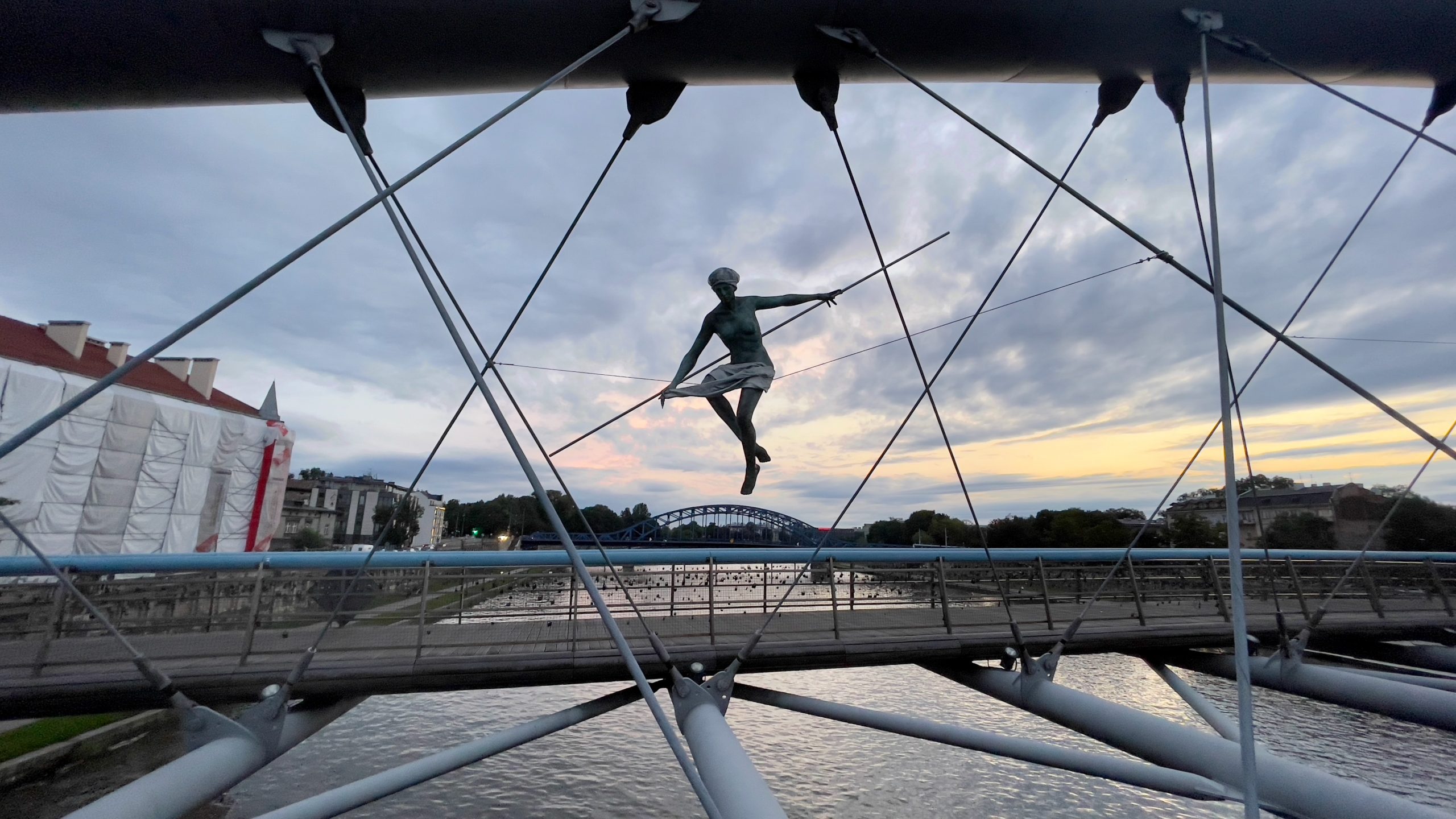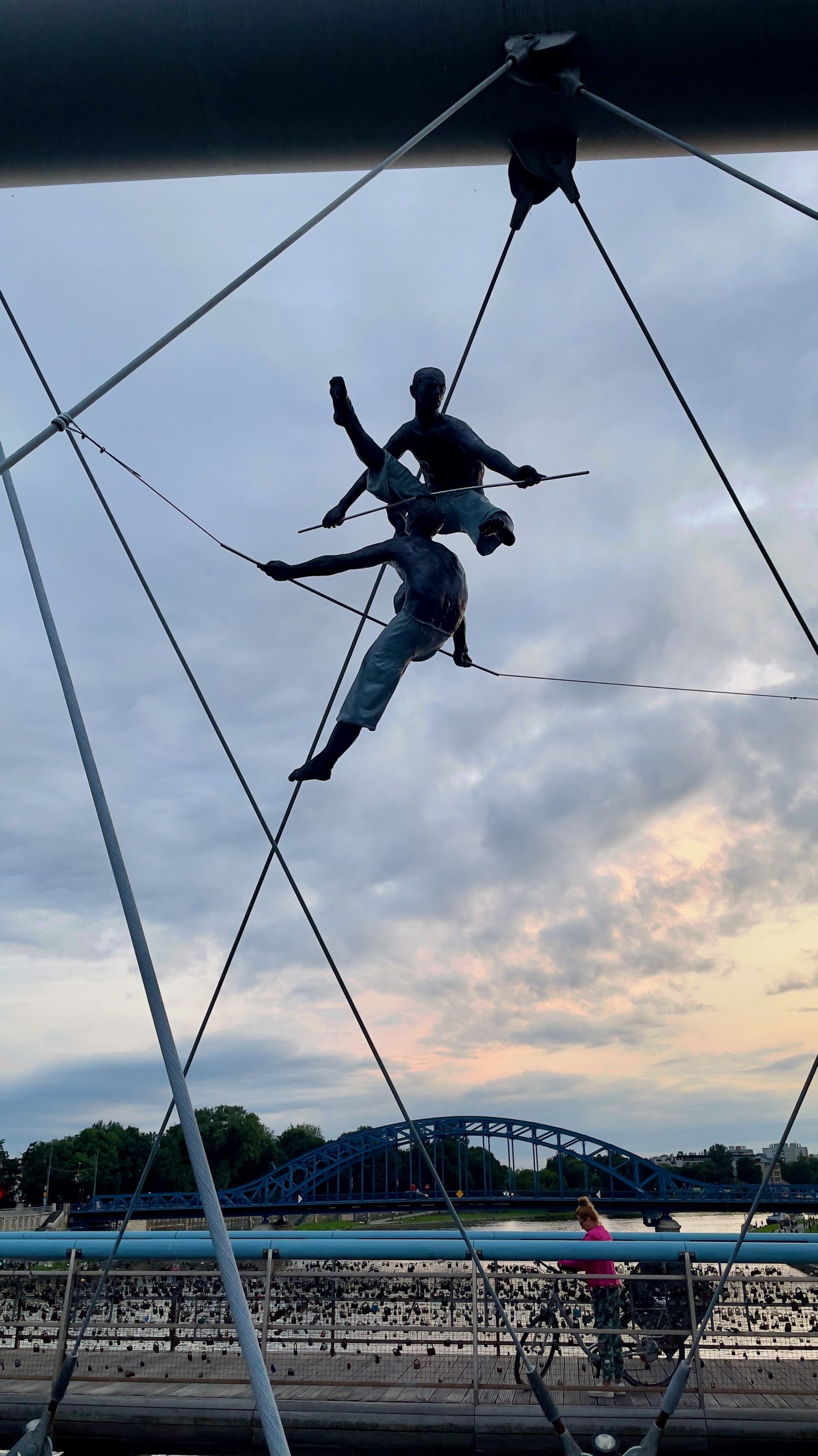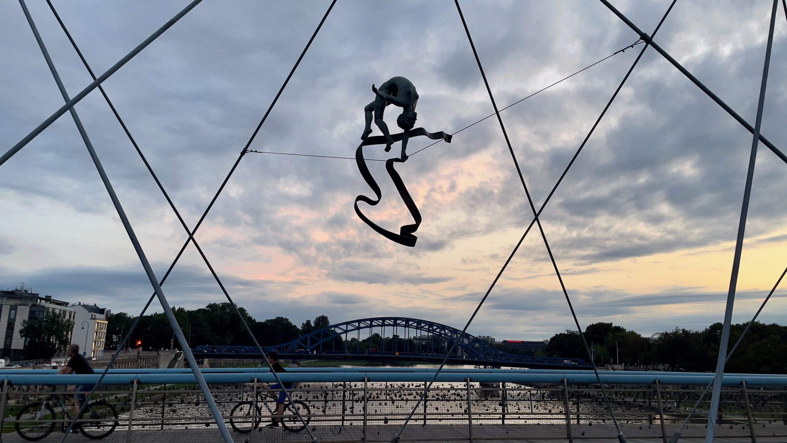 Nous ressortons peu avant 19h pour aller manger au thai d’en face, histoire de diminuer le risque de métamorphose en pierogis. Puis nous enfilons les rues très animées de notre quartier, où l’ambiance est vraiment festive et bon enfant, jusqu’à la passerelle du Père Bernatek qui enjambe la Vistule (le même fleuve qu’à Varsovie). De gracieux acrobates de métal y sont suspendus en l’air sur fond de soleil couchant hélas aux trois quarts dissimulés par de gros nuages. Lorsque je vais me coucher peu avant minuit, ces derniers éclatent en libérant l’orage le plus impressionnant auquel j’ai jamais assisté. Les éclairs se succèdent à des intervalles très courts, illuminant notre chambre; les coups de tonnerre résonnant tout près, la pluie tombe à verse, et mon cerveau me chuchote que ce serait vraiment horrible de mourir noyée dans les galeries de la mine que nous devons visiter demain. Voilà voilà voilà.