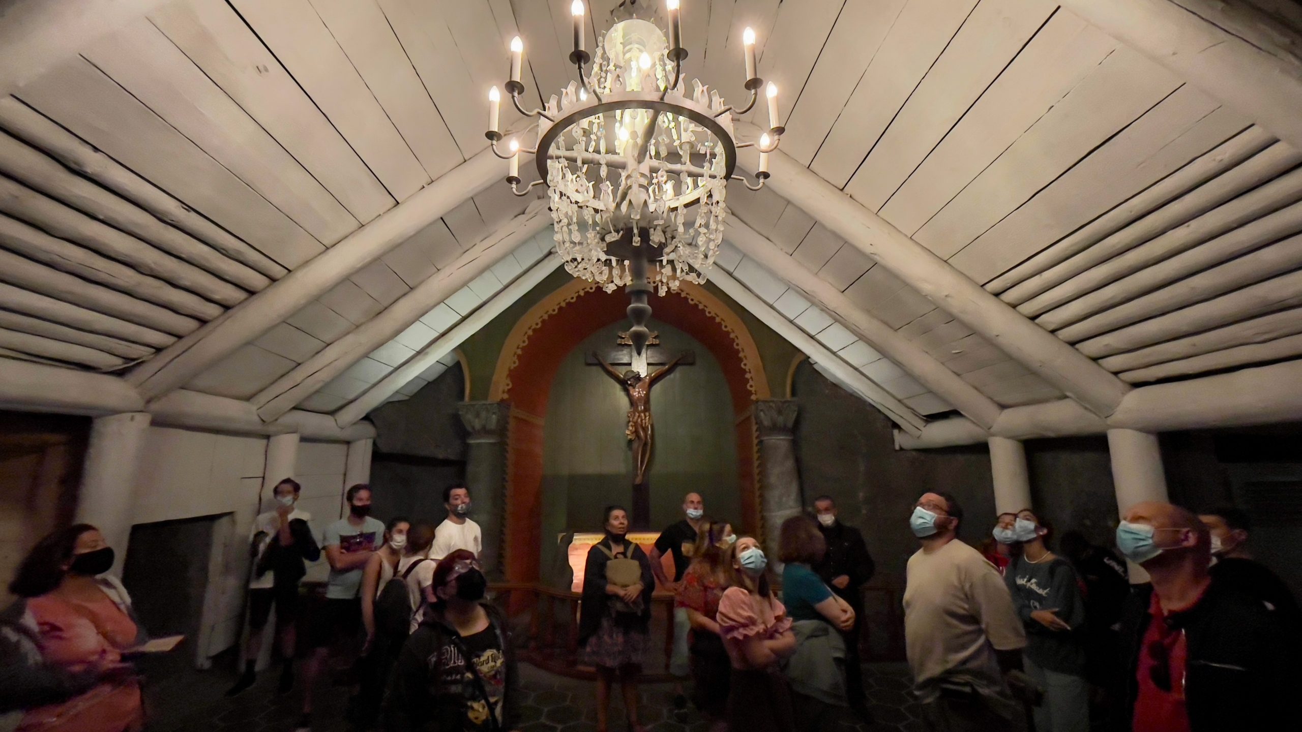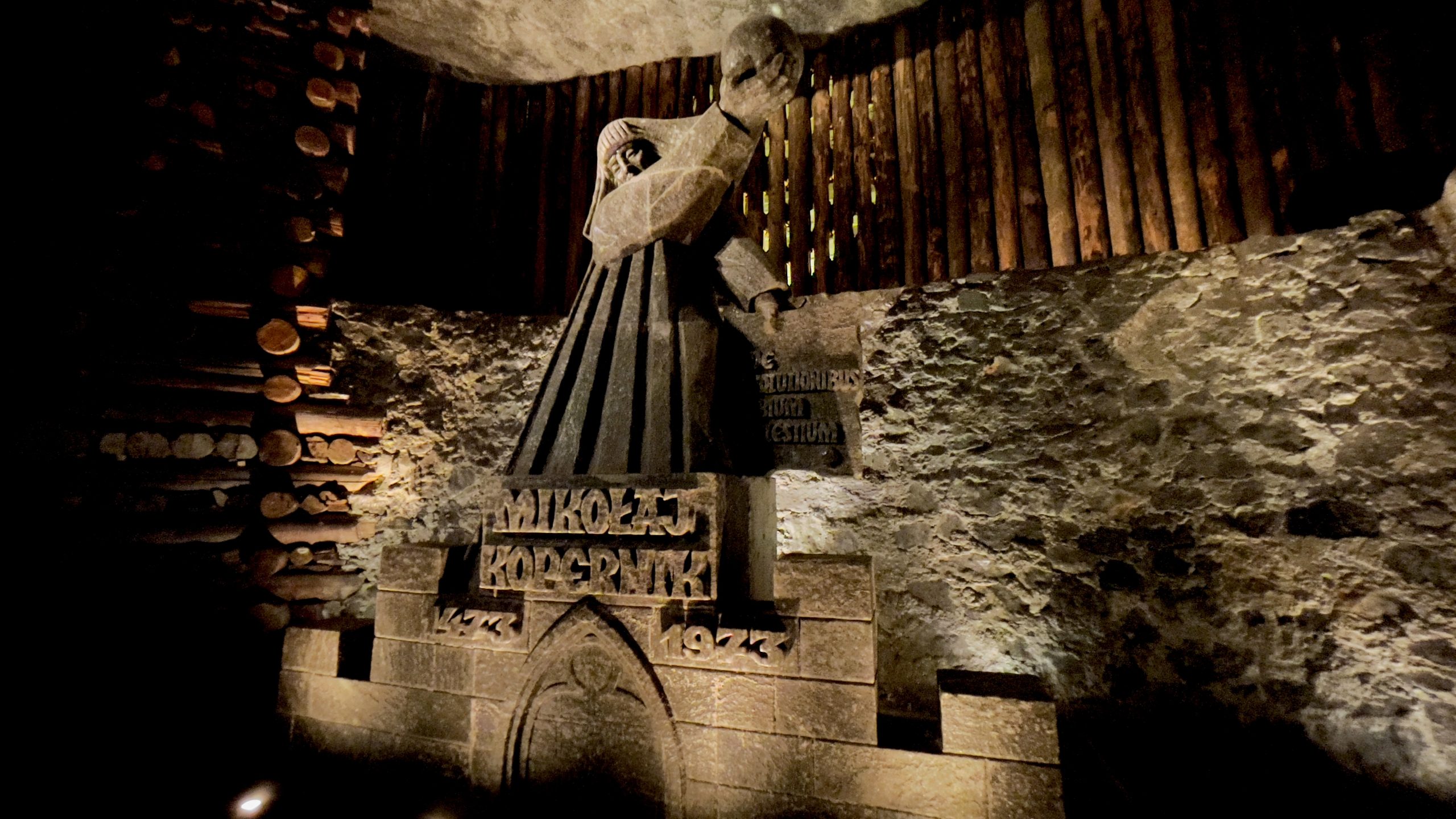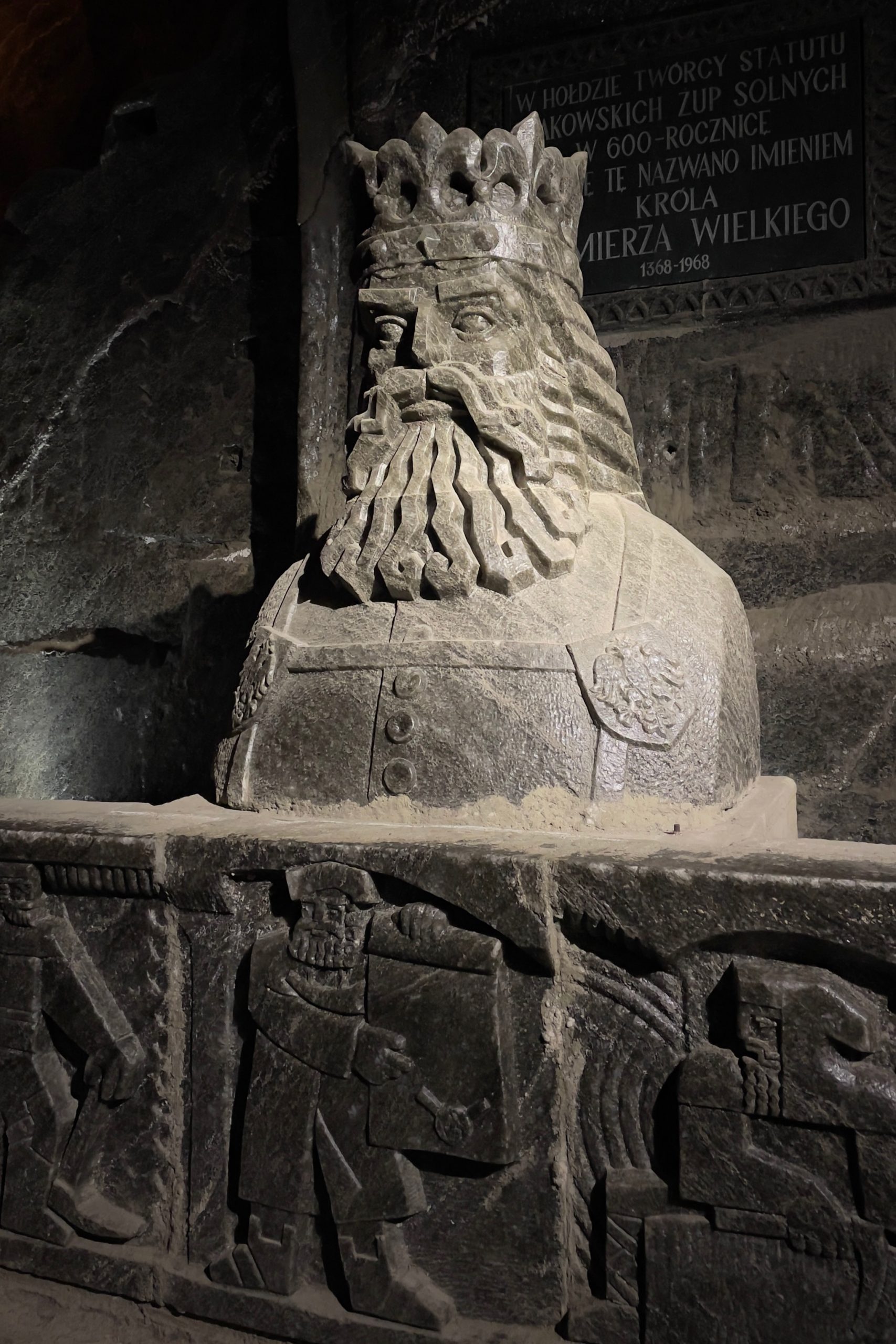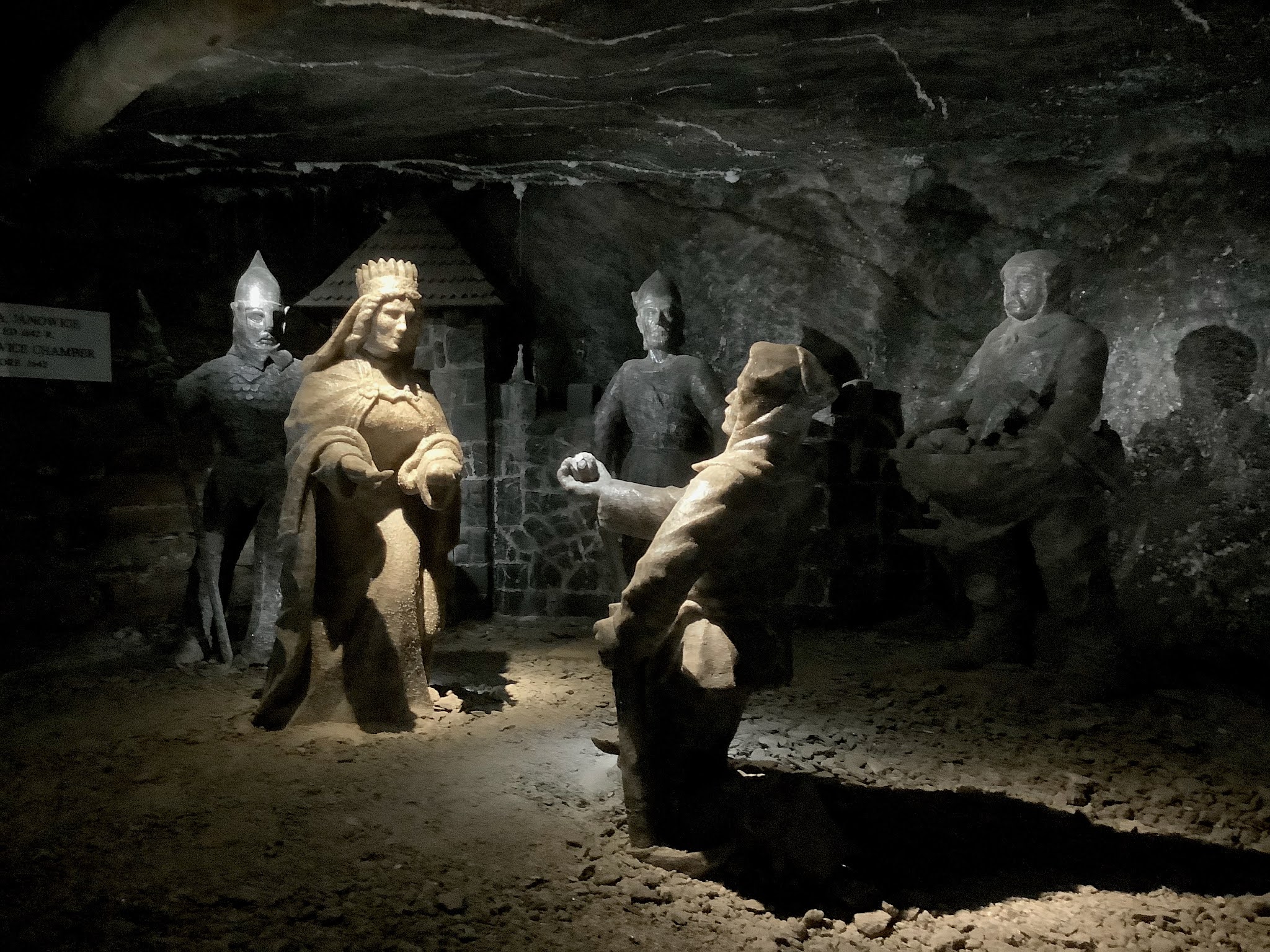 Ce que je vois me désarçonne quelque peu. Je m’attendais à des stalactites de sel, des carrières souterraines, voire des gros tas de blocs bruts – or nous traversons chapelle sur chapelle, séparées les unes des autres par quelques dioramas explicatifs et statues de grands personnages historiques, avec à peine quelques dépôts blanchâtres de-ci de-là. J’imagine que la véritable extraction a lieu plus bas, dans les niveaux où nous n’irons pas. Mais comme très souvent, le décalage entre mon imagination et la réalité est une source de déception que je dois faire un gros effort pour surmonter. Reste tout de même des visions étonnantes. « Regarde, une salle de bal! » m’écrié-je à l’attention de Chouchou en découvrant un vaste espace au plafond duquel pendent des lustres en cristaux de sel. « Non, c’est encore une chapelle, juste plus grande que les autres », me détrompe-t-il impitoyablement. Et en effet, une effigie de Jean-Paul II se dresse dans le fond. Franchement, ma version était beaucoup mieux.