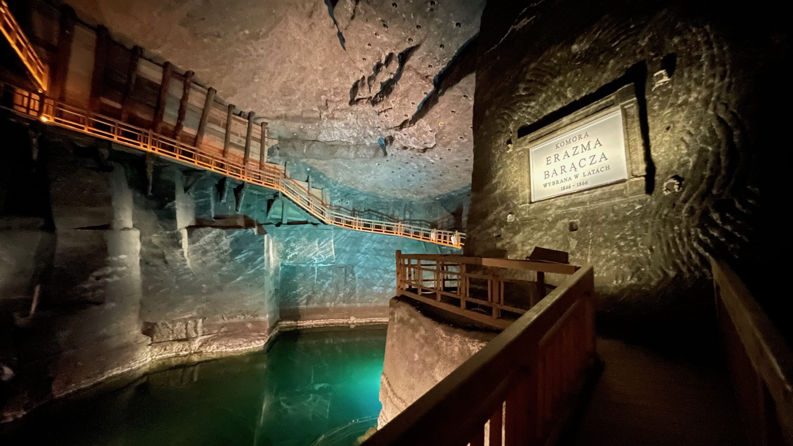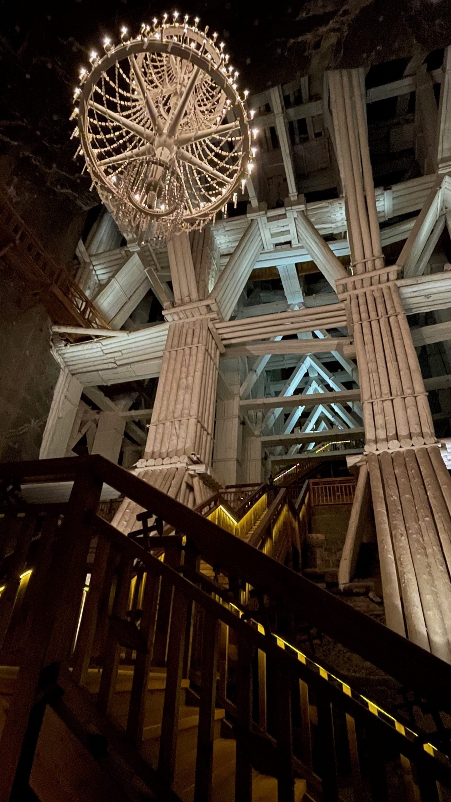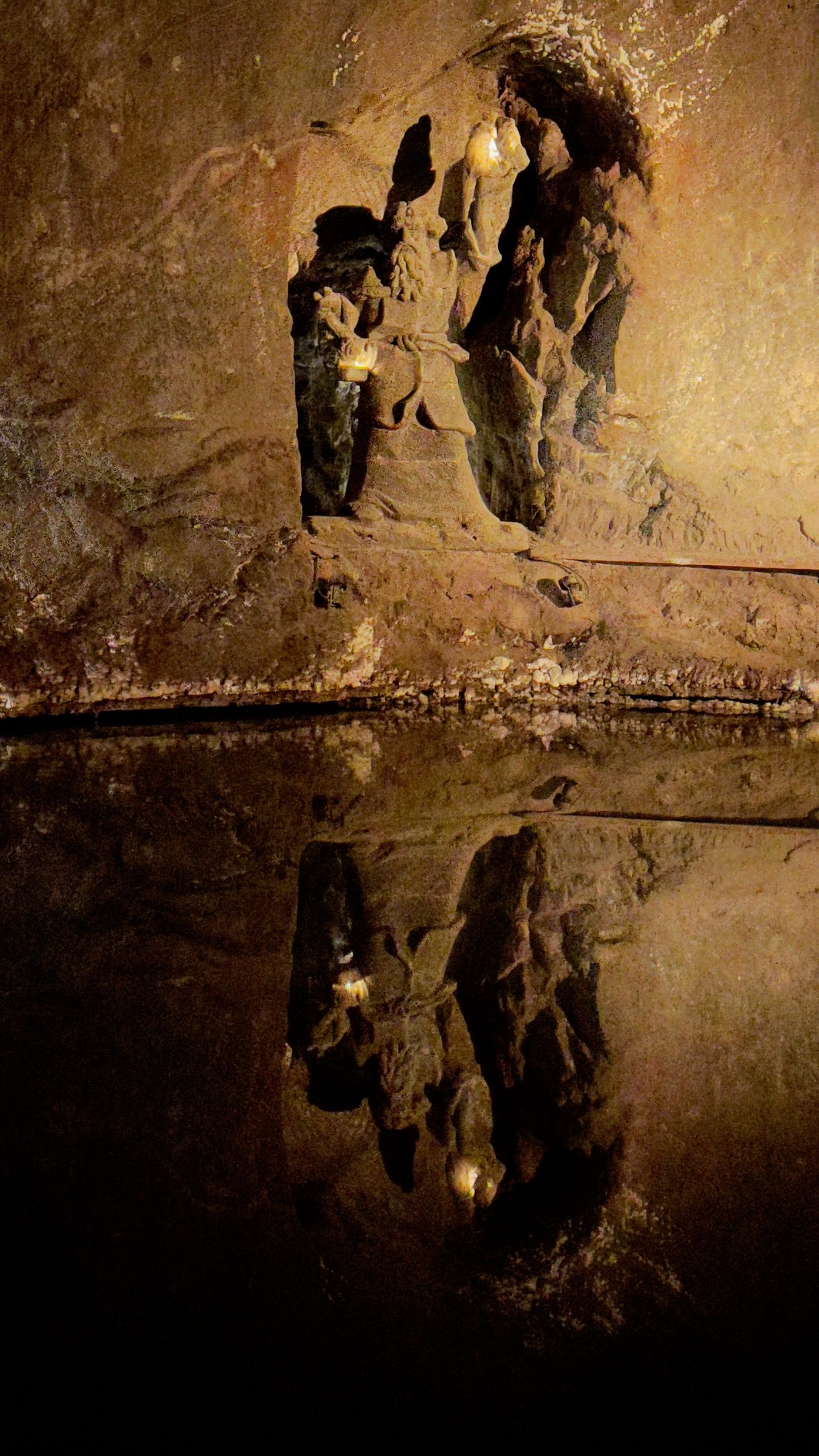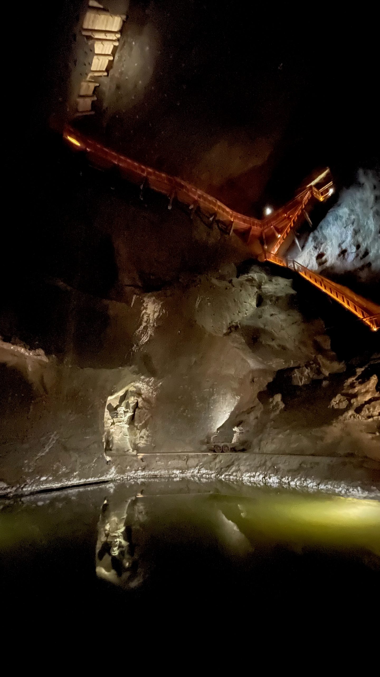 Je suis assez vite rassurée sur les conditions matérielles de la visite. Les galeries sont larges, pas toujours très hautes mais je rappelle que je suis un Minipouss, et ni froides ni particulièrement humides (je regrette même de m’être encombrée d’un sweat-shirt). Tant que j’évite de penser aux milliards de tonnes de pierre qui s’entassent au-dessus de ma tête et à l’impossibilité de regagner rapidement la surface, tout va bien. Je ne peux hélas guère me focaliser sur les explications du guide: entre son accent très prononcé et les bavardages des autres membres du groupe, je capte à peine une bribe de phrase par-ci par-là. Alors, je me contente d’ouvrir les yeux et d’admirer la fabuleuse ingénierie qui permet l’exploitation continue de cette mine – de nos jours, la plus grande d’Europe – depuis plusieurs siècles. Comme toujours, ma perception de la réalité est toute personnelle. Après avoir sondé avec fascination un monstrueux abysse pendant 30 bonnes secondes, et m’être imaginée laissant tomber un objet dedans pour écouter combien de temps il mettrait à atteindre le fond, je réalise qu’il s’agit de la surface d’un lac reflétant le puits qui se trouve au-dessus. Hum.