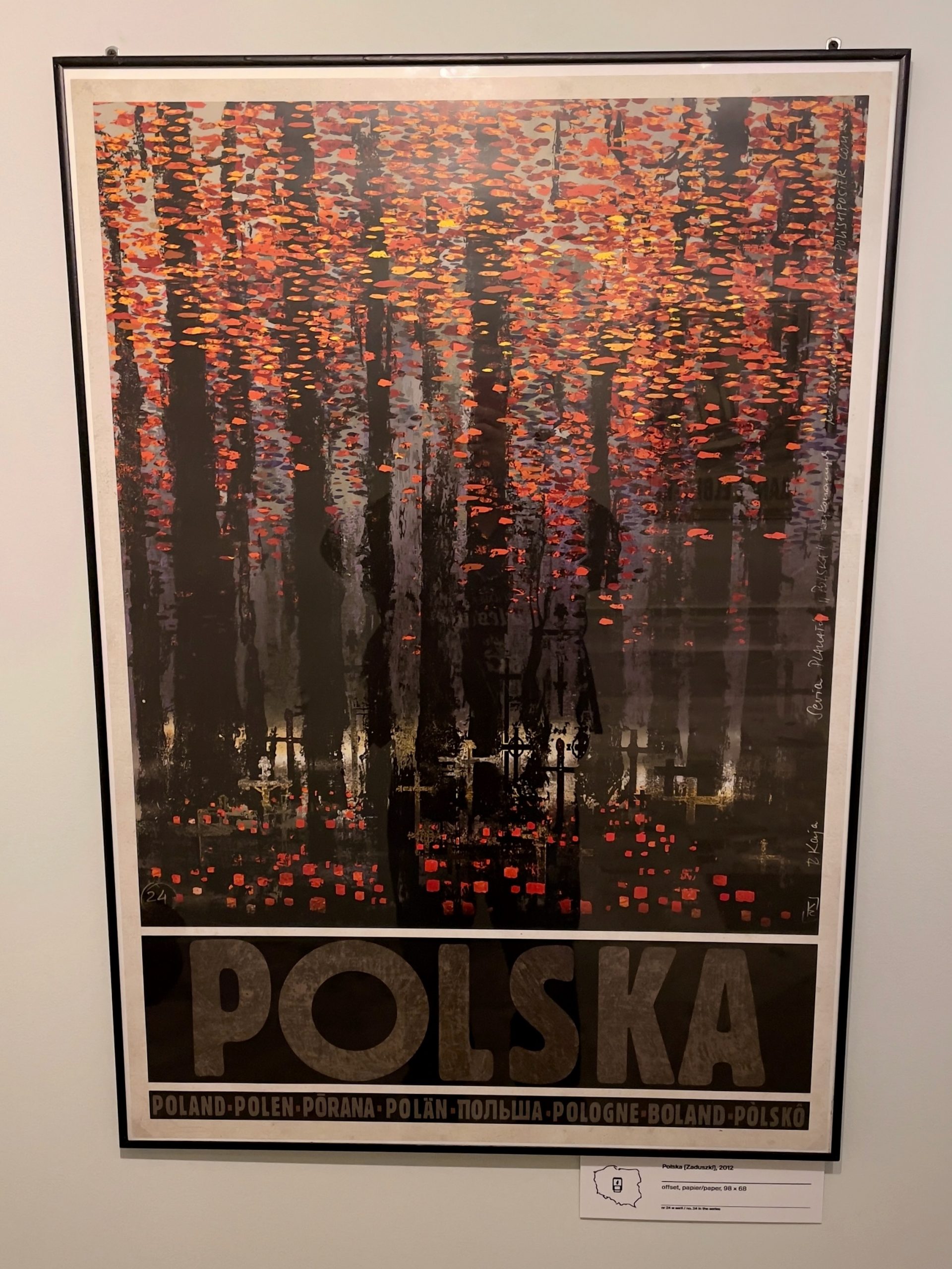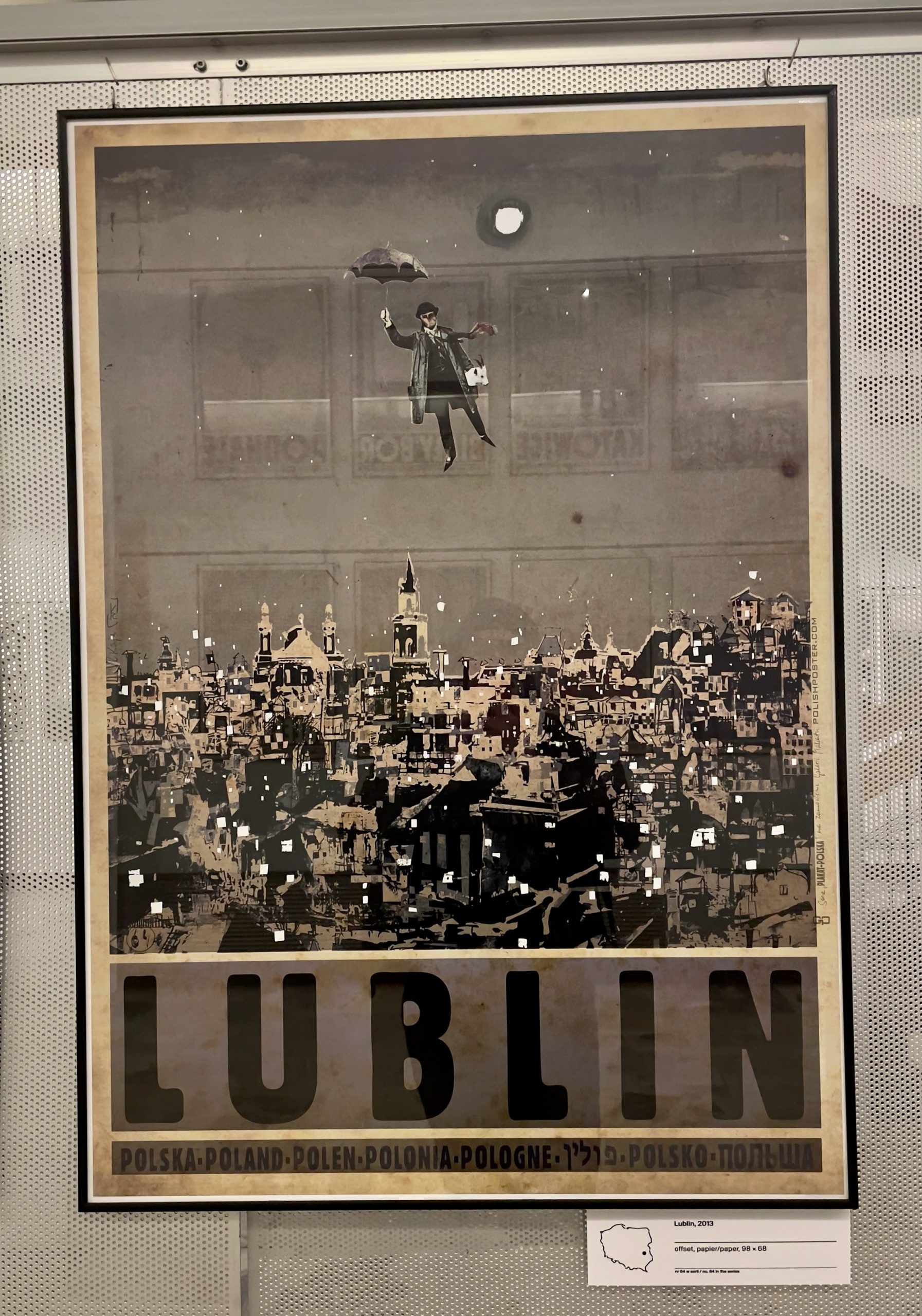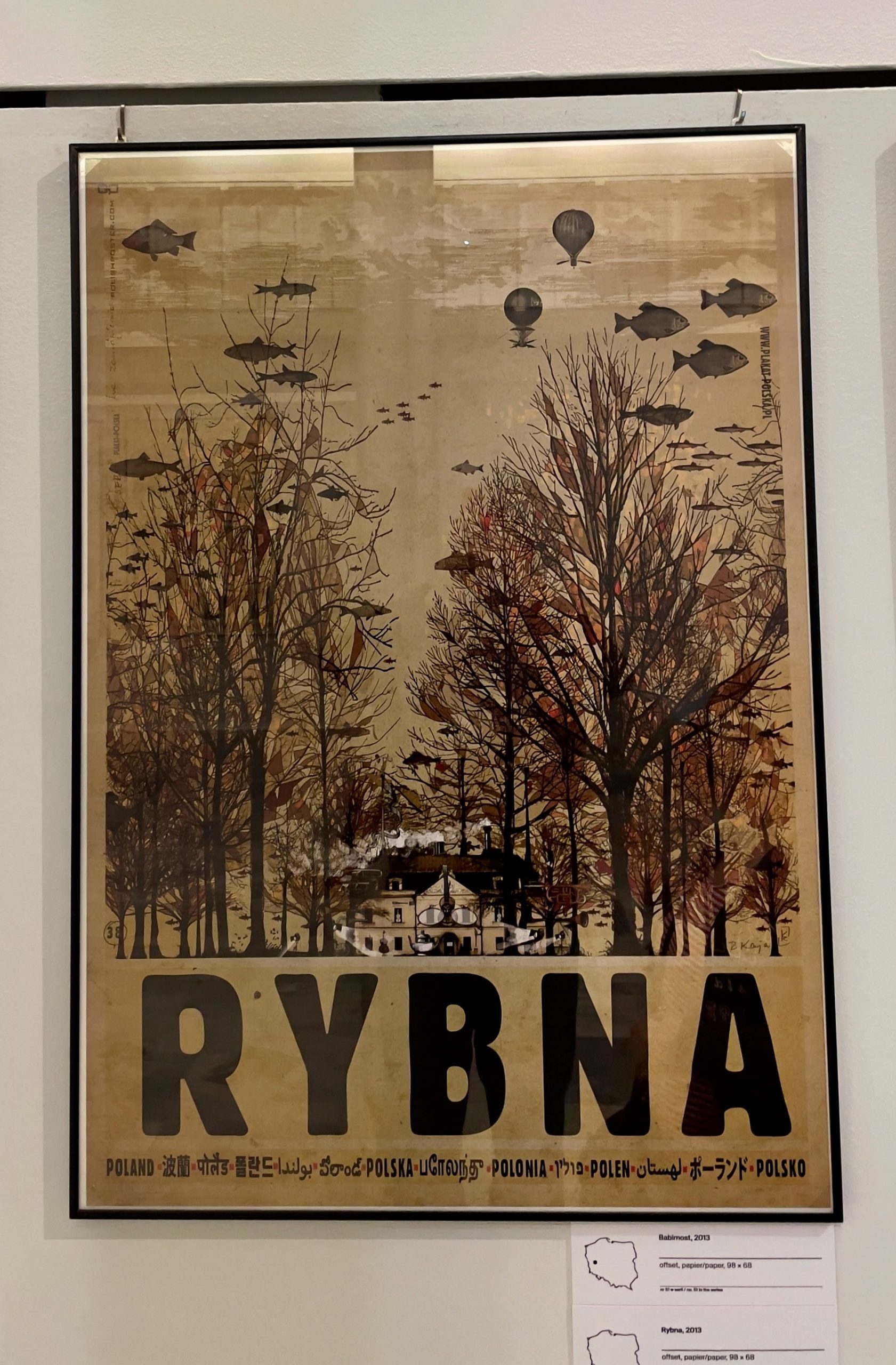 Sous une pluie battante, nous prenons le bus 116 jusqu’à son terminus de Wilanow, à une demi-heure de trajet au sud de la ville. C’est au pas de course et quasiment en aveugle que nous traversons l’enceinte du palais jusqu’au Muzeum Plakatu dédié aux affiches polonaises. Il existe en effet tout un art graphique local dont j’ignorais l’existence avant-hier matin, mais dont les premiers aperçus dans des boutiques de souvenirs m’ont immédiatement séduite. Lorsque nous pénétrons dans le bâtiment rectangulaire dont la modernité et l’austérité contrastent très fort avec l’esthétique quasi versaillaise du palais voisin, nous sommes tout d’abord déçus. En effet, au lieu de la collection permanente variée que nous nous attendions à voir, il n’y a qu’une expo temporaire consacrée au travail d’un dénommé Ryszard Kaja – notamment, à une collection de 160 pseudo-affiches touristiques réalisées durant les 7 dernières années de sa vie.
