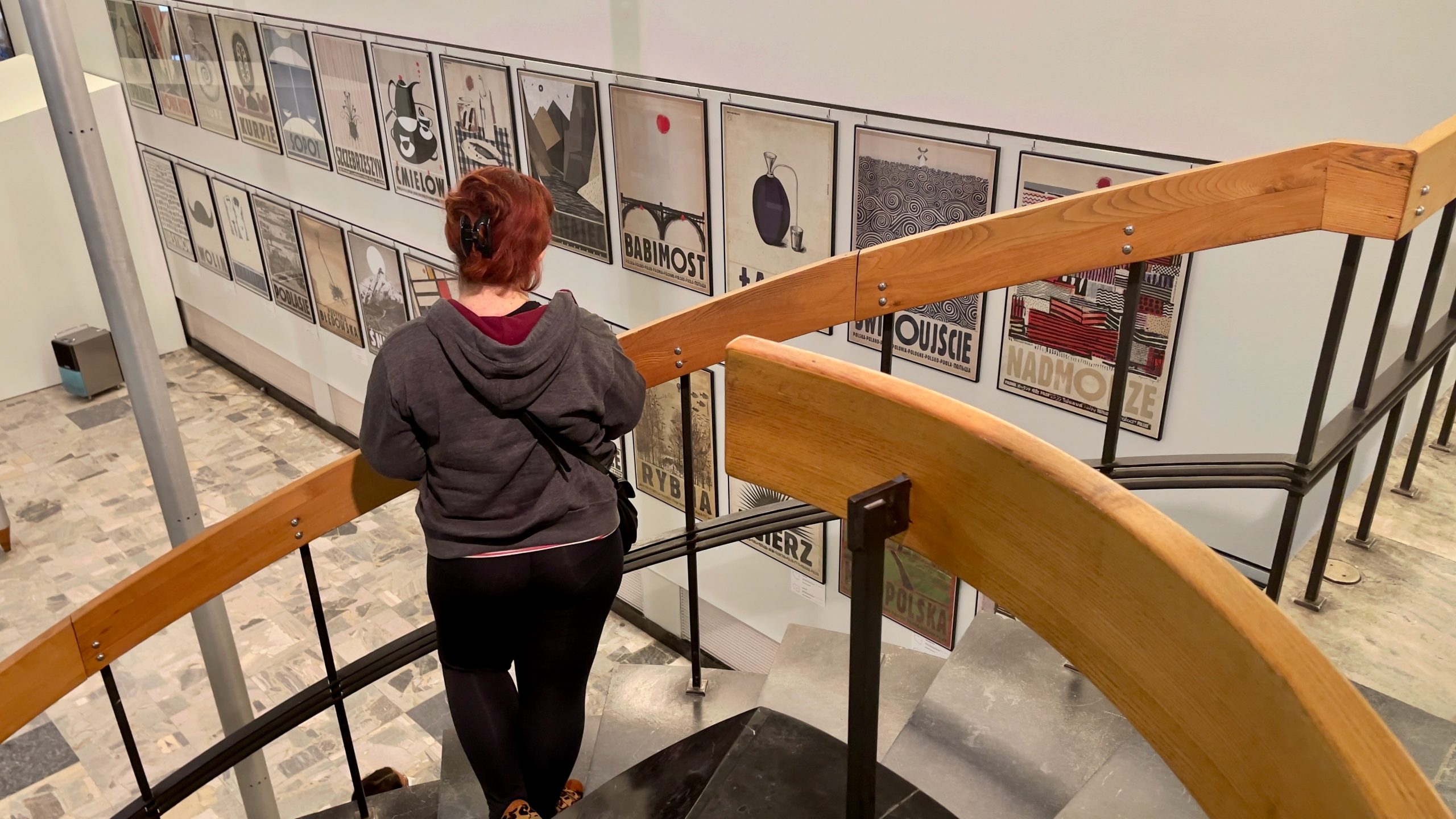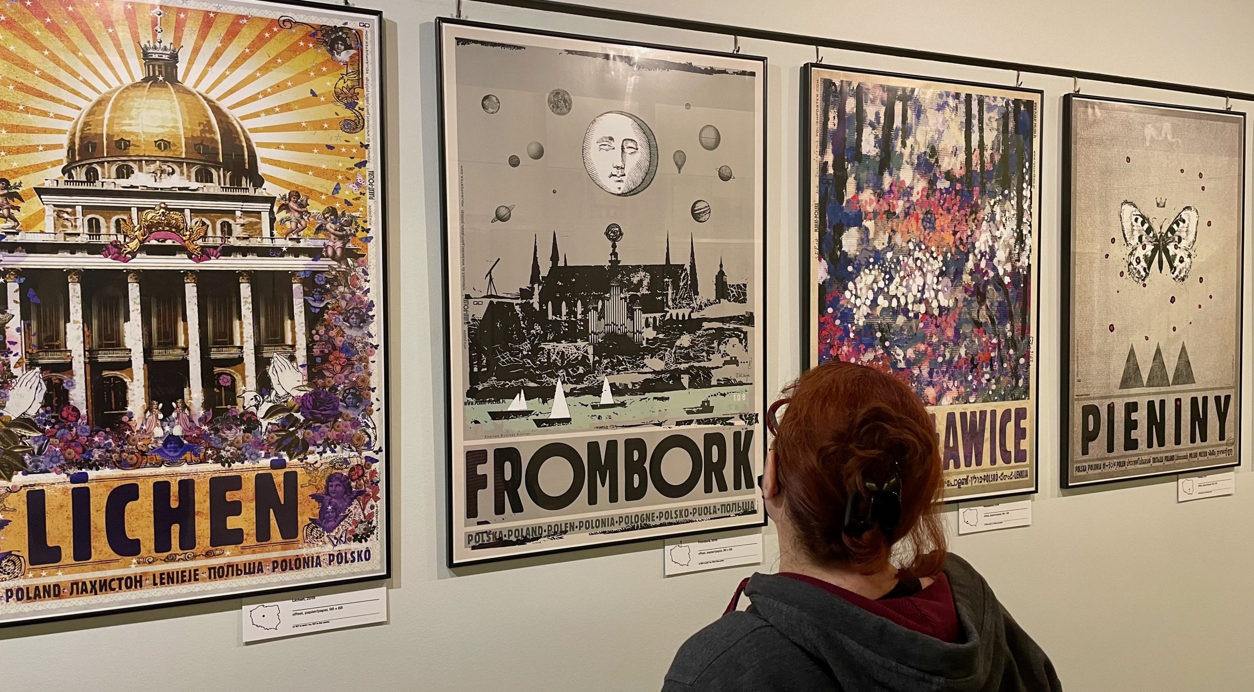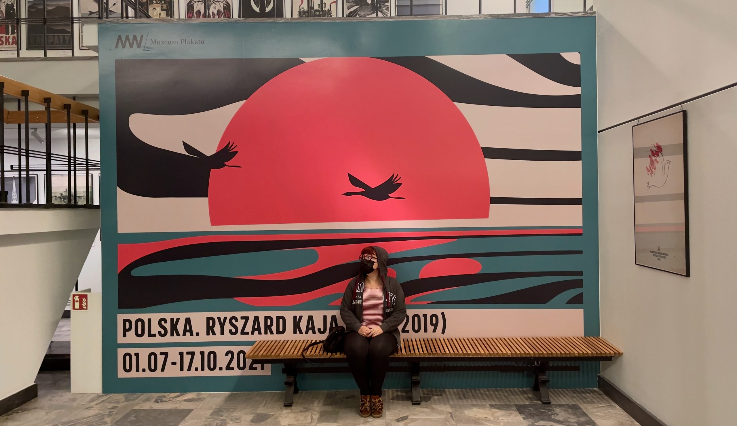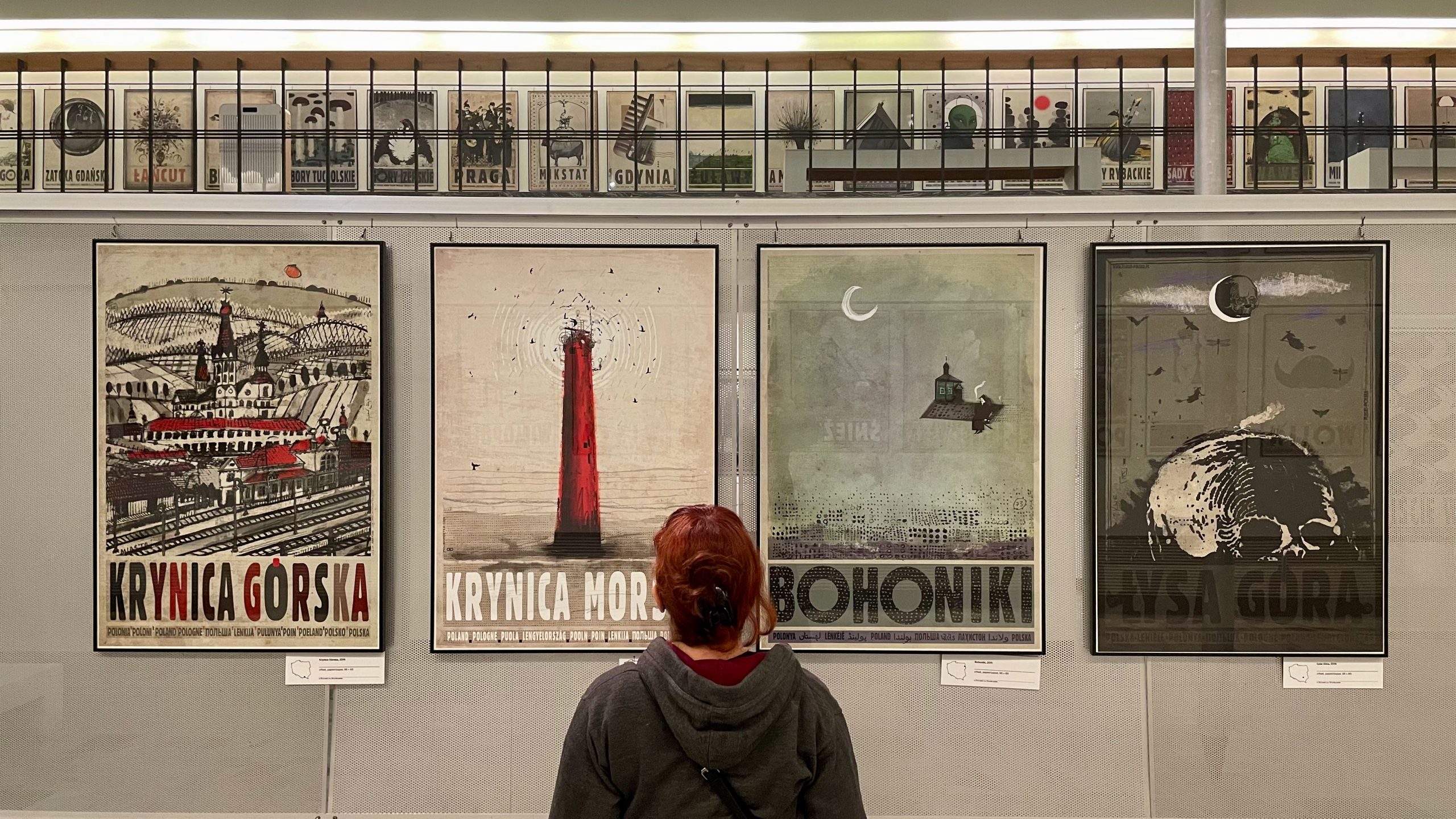 Sous une pluie battante, nous prenons le bus 116 jusqu’à son terminus de Wilanow, à une demi-heure de trajet au sud de la ville. C’est au pas de course et quasiment en aveugle que nous traversons l’enceinte du palais jusqu’au Muzeum Plakatu dédié aux affiches polonaises. Il existe en effet tout un art graphique local dont j’ignorais l’existence avant-hier matin, mais dont les premiers aperçus dans des boutiques de souvenirs m’ont immédiatement séduite. Lorsque nous pénétrons dans le bâtiment rectangulaire dont la modernité et l’austérité contrastent très fort avec l’esthétique quasi versaillaise du palais voisin, nous sommes tout d’abord déçus. En effet, au lieu de la collection permanente variée que nous nous attendions à voir, il n’y a qu’une expo temporaire consacrée au travail d’un dénommé Ryszard Kaja – notamment, à une collection de 160 pseudo-affiches touristiques réalisées durant les 7 dernières années de sa vie.