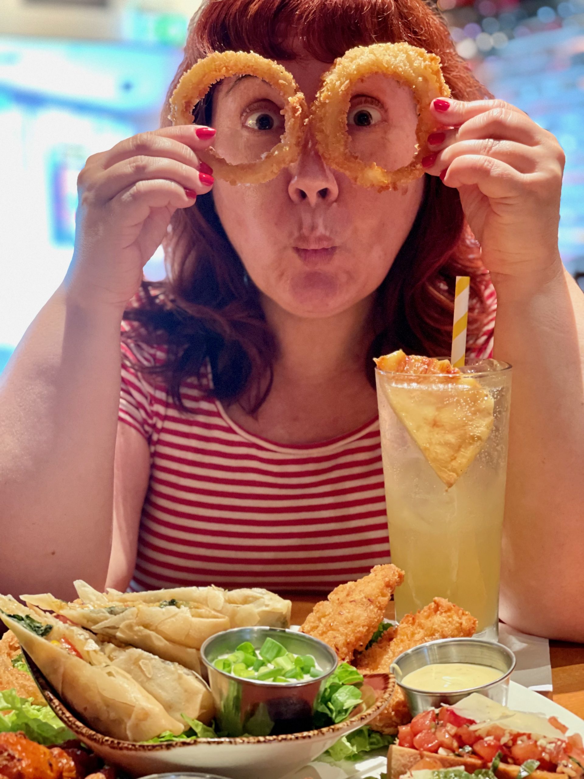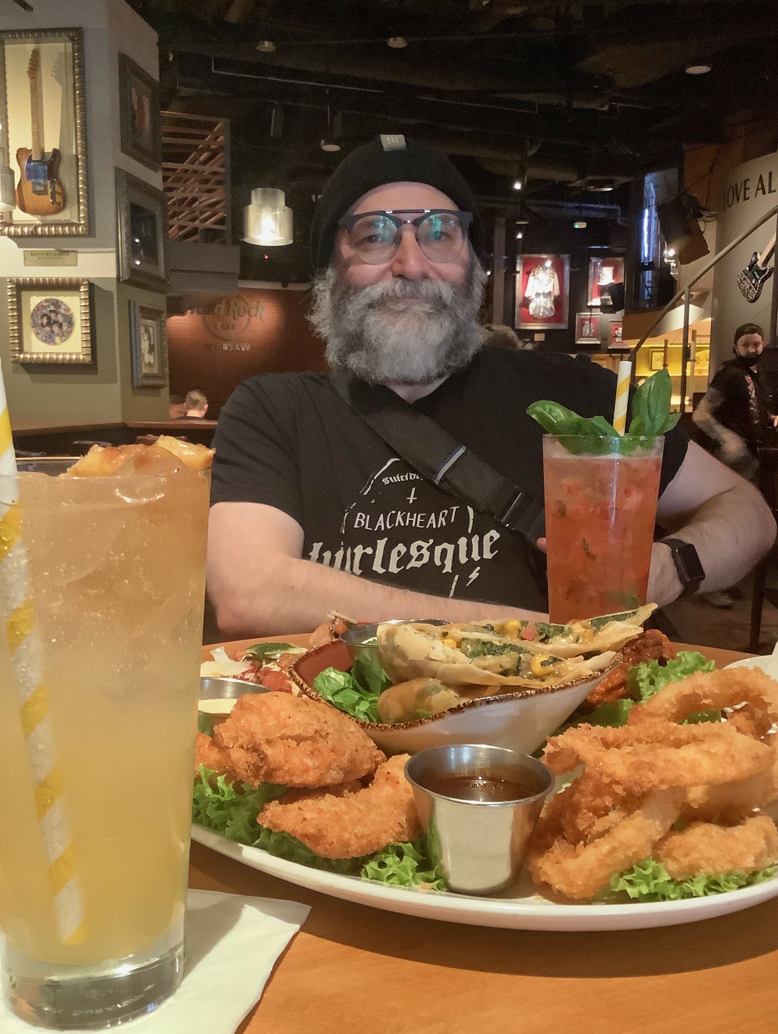 Il fait soif. Nous allons nous poser devant un verre de limonade au Hard Rock Café voisin. Comme c’est l’heure du goûter et que je n’ai pas envie de sucre, nous commandons aussi un jumbo combo à base d’ailes de poulet, d’onion rings et de mini-bruschetta. A une époque, je dînais au HRC de toutes les villes que je visitais, et j’y achetais aussi un T-shirt pour ma collection. Je m’en suis lassée il y a un petit moment, mais du coup, j’ai plaisir à y revenir après plusieurs années. Et, oui, bien que le choix de T-shirts pour femme soit toujours aussi minable à côté des modèles pour homme, je me laisse quand même tenter par le Rockabilly à col bateau en coton anthracite tout doux. De son côté, Chouchou est incapable de résister à l’appel de la sirène de Varsovie sur fond blanc.