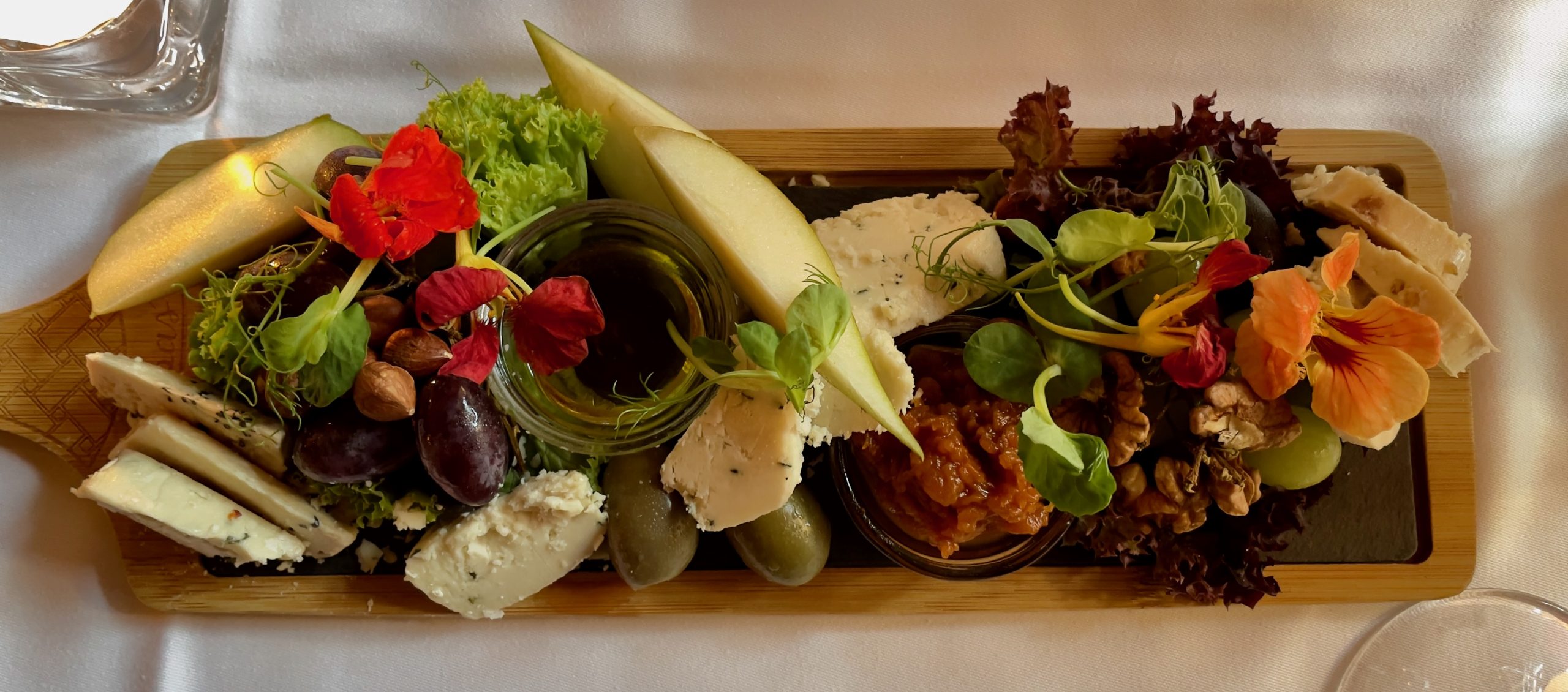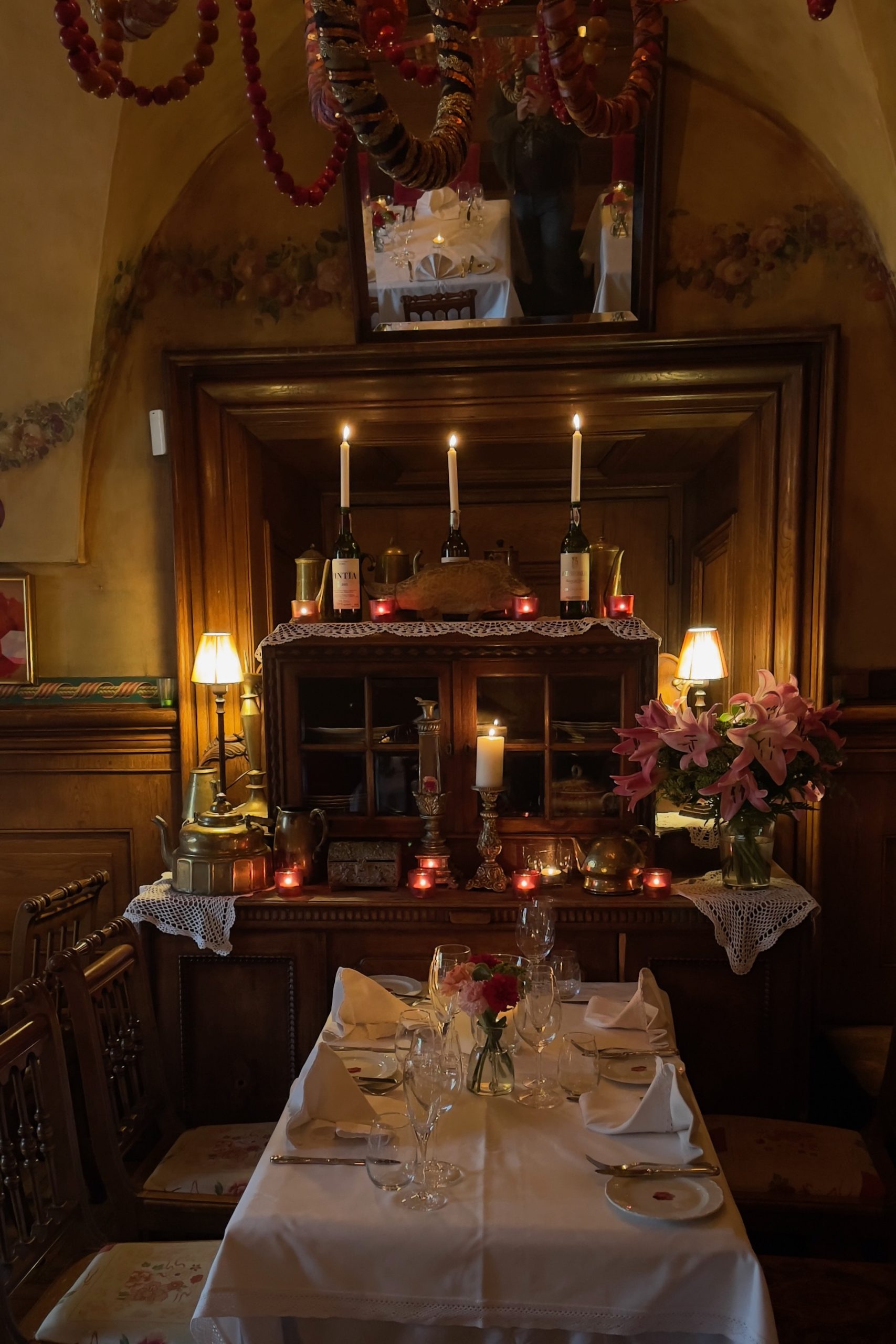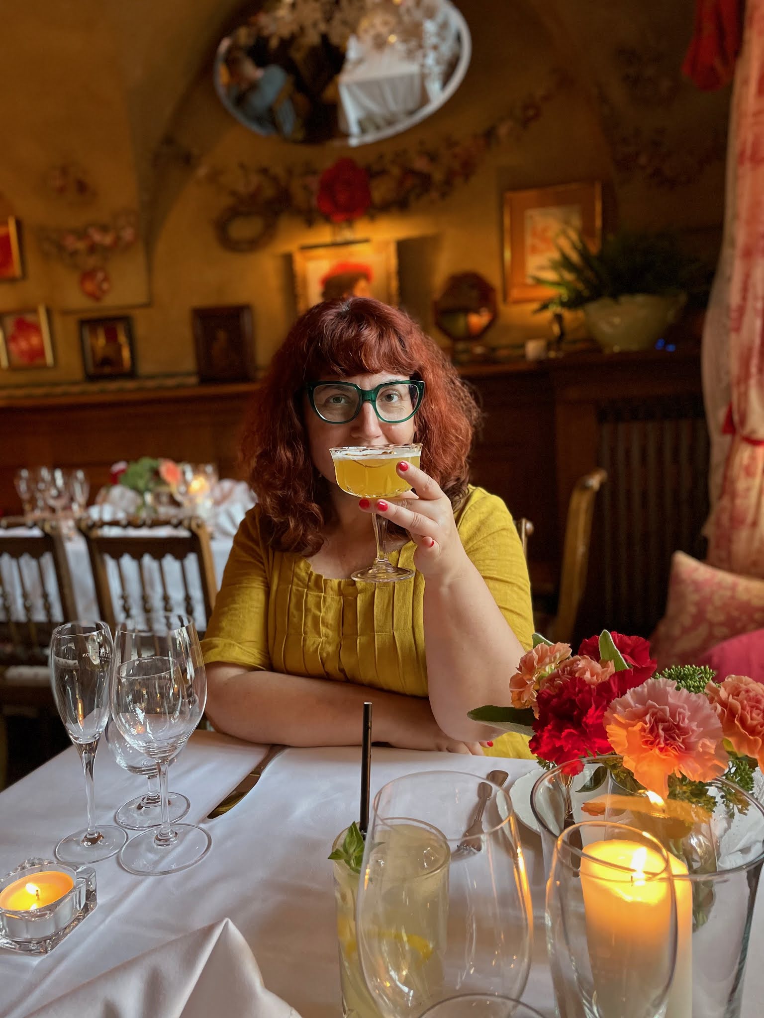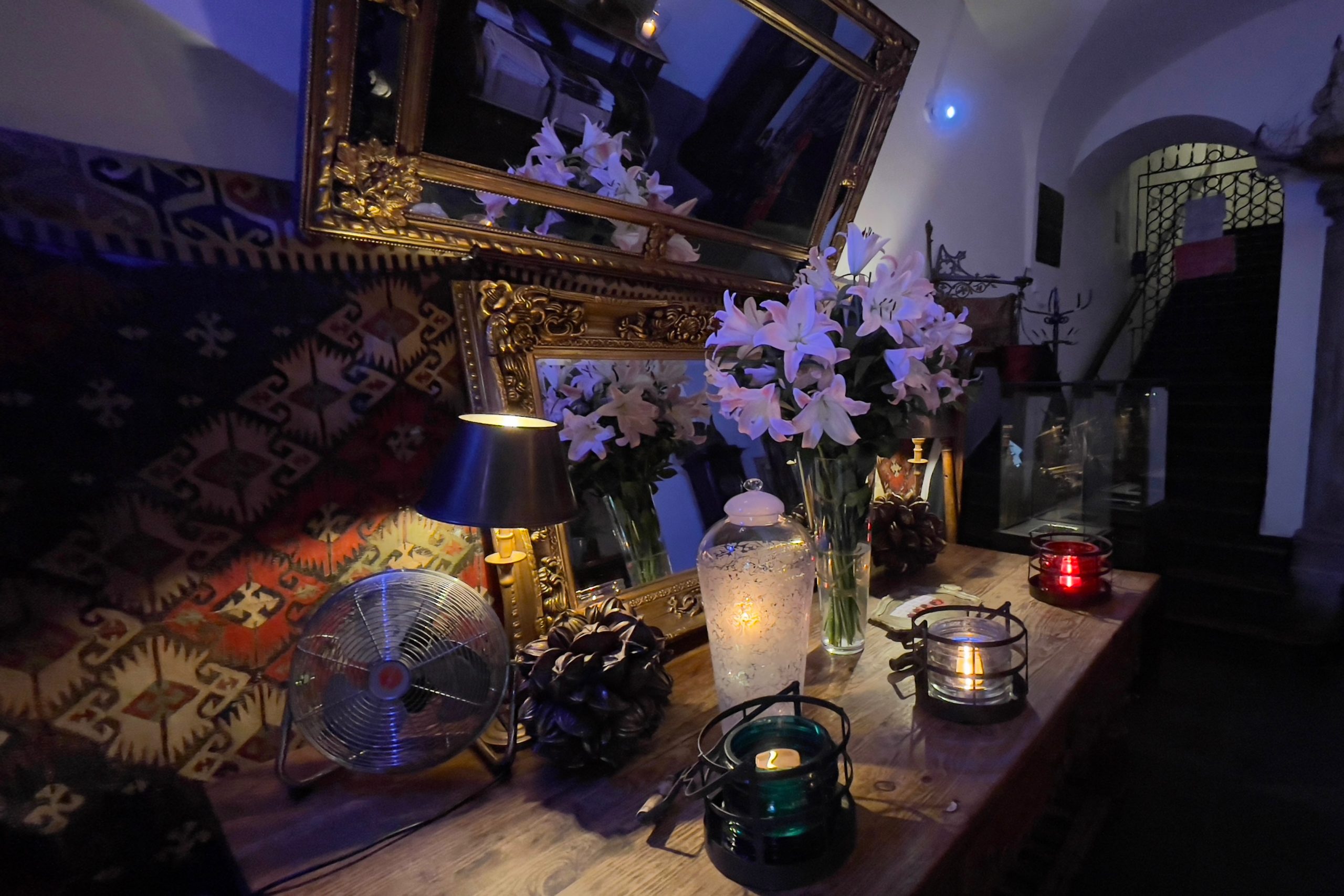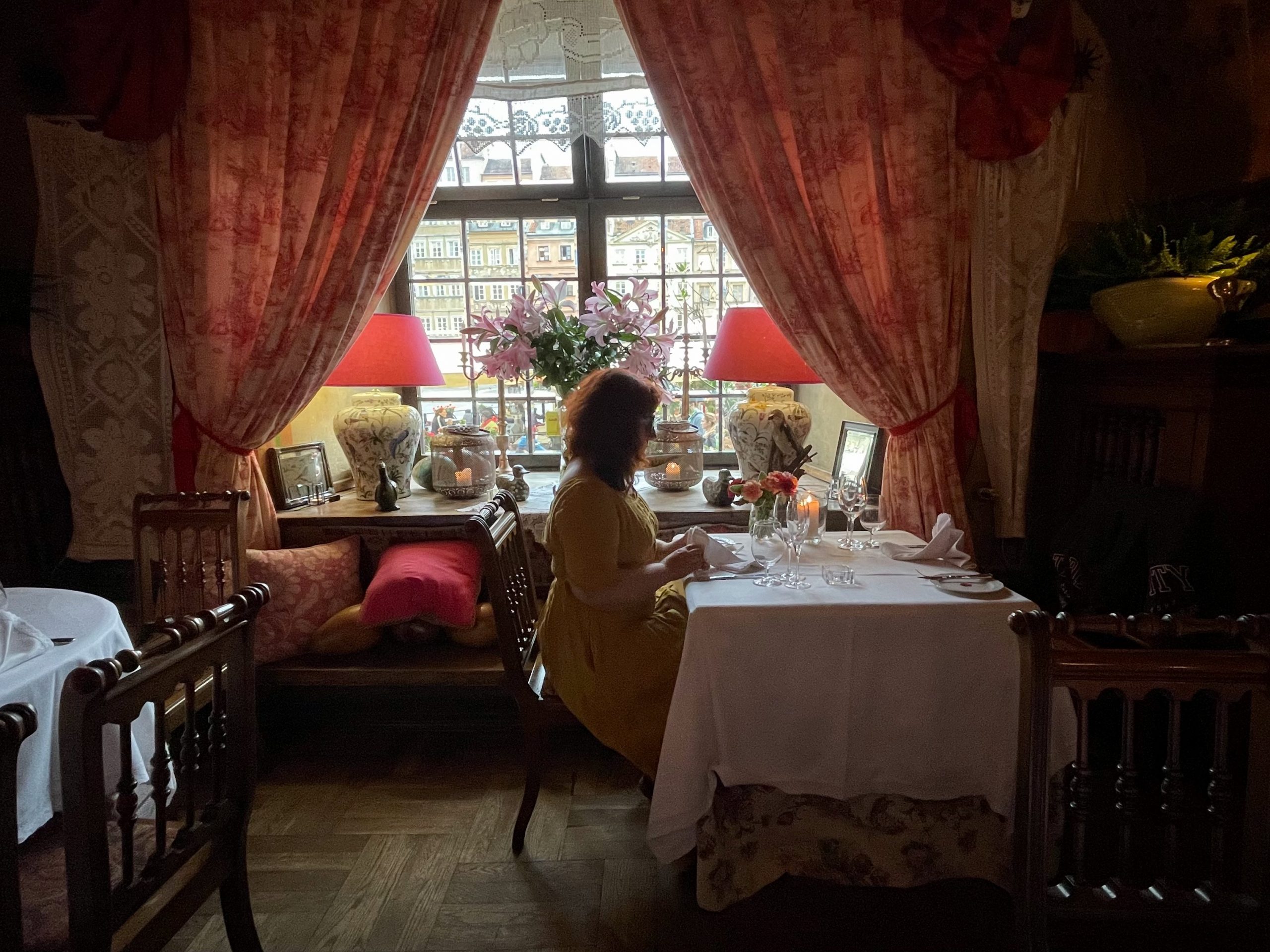 Il est à peine 17h30 quand nous nous présentons avec une heure d’avance au restaurant où nous avons réservé pour le dîner. La déco d’U Fukiera est à tomber dans le genre bohème chic et romantique. On nous installe près de la vitrine, à l’endroit le plus lumineux des deux salles et avec une vue très sympa sur la place Rynek Starego Miasta entre les lys roses d’un énorme bouquet – je suis ravie. Nous commandons une planchette de fromages à partager en entrée, et recevons une petite oeuvre d’art mélangeant noix, noisettes, raisins blanc et noir, tranches de poire, olives vertes, confit de tomates, huile d’olive, cresson sauvage et petites fleurs. Je l’arrose d’un cocktail Oasis à base de gin et de liqueur d’abricot tandis que Chouchou reste à la limonade maison.