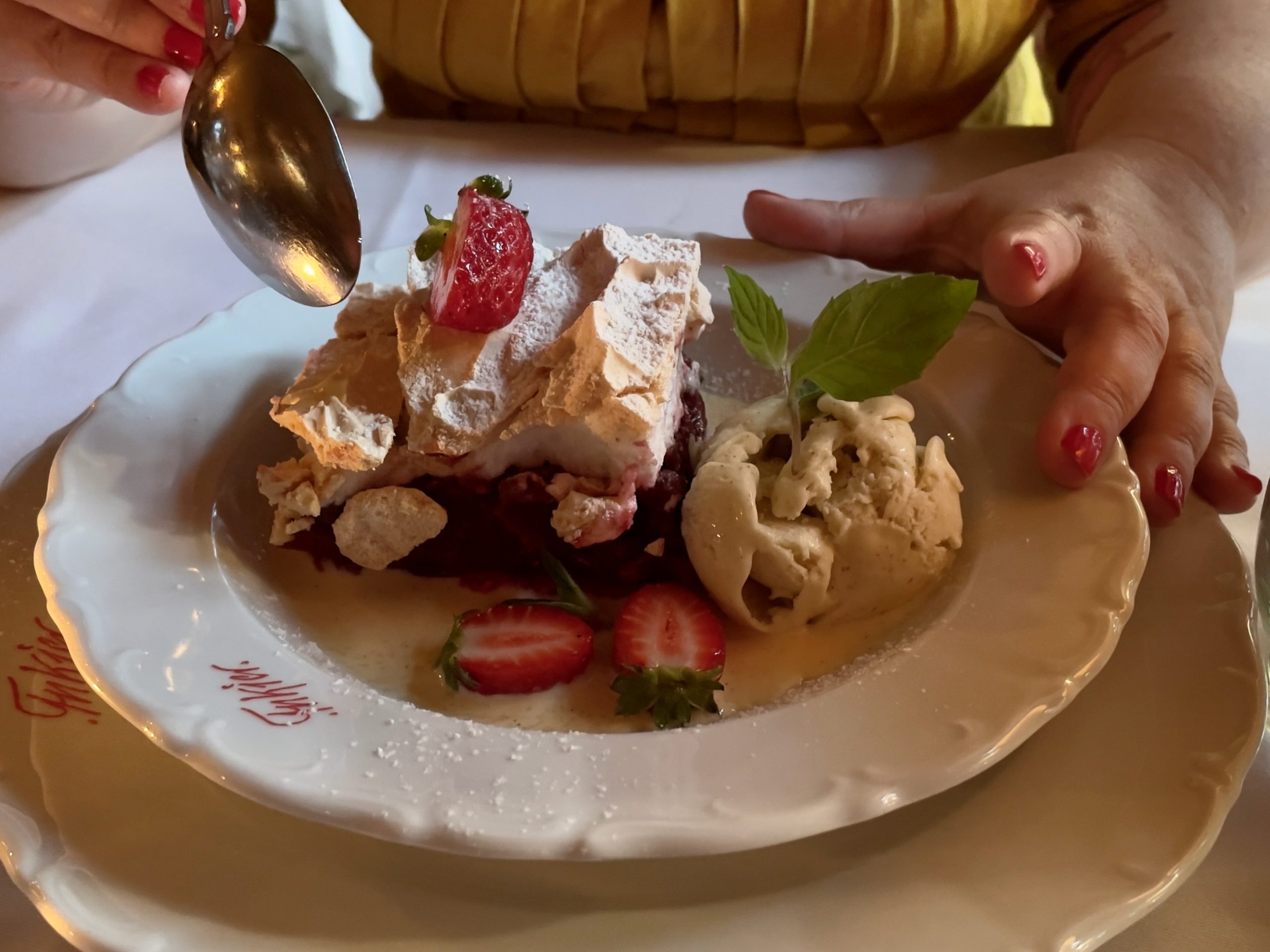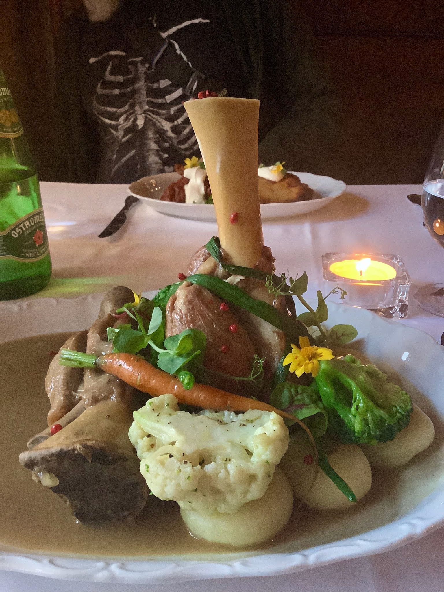 Après ça, je savoure un impressionnant jarret de veau avec la viande la plus tendre que j’ai jamais mangée et une sauce absolument divine dans laquelle je pourrais prendre un bain, accompagné de gnocchis polonais et de petits légumes croquants. C’est si copieux que même Chouchou s’avoue vaincu avant de m’avoir aidée à finir. Certes, j’ai un peu triché en voulant garder de la place pour un dessert à partager: ce sera une red apple pie meringuée avec sa boule de glace vanille. Les yeux aussi comblés que les papilles, je réclame l’addition: moins de 80€ à deux pour le meilleur repas que j’ai fait depuis des années. En plus, le service était parfait. Réconciliée avec la vie (mais probablement très fâchée avec ma balance le jour où je me pèserai de nouveau), je propose que nous rentrions à pied malgré les quelques gouttes qui ont commencé à tomber.