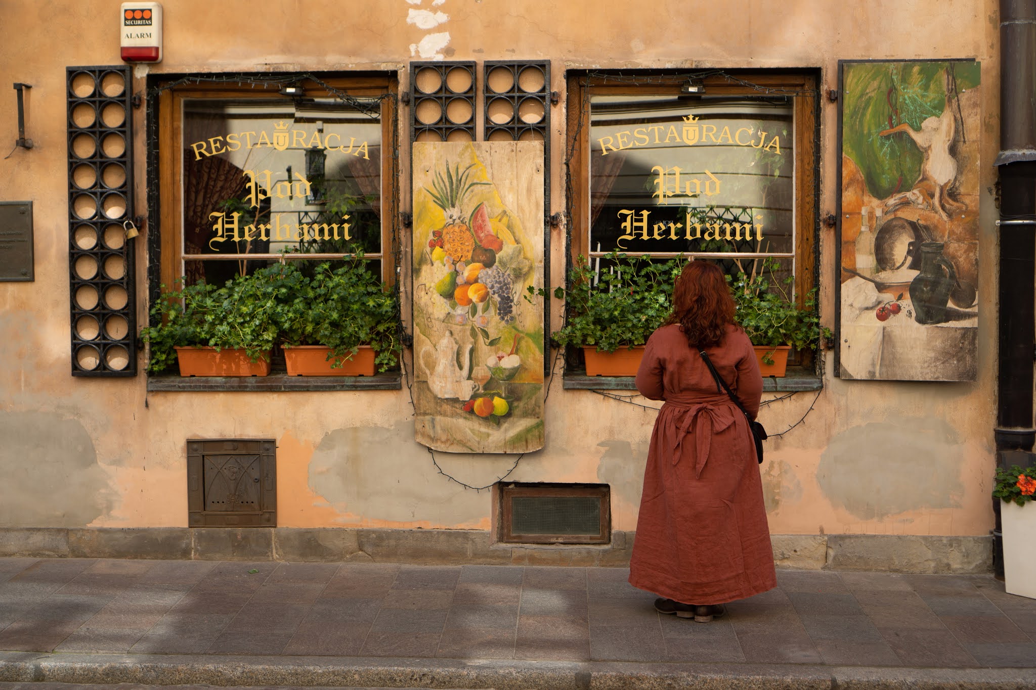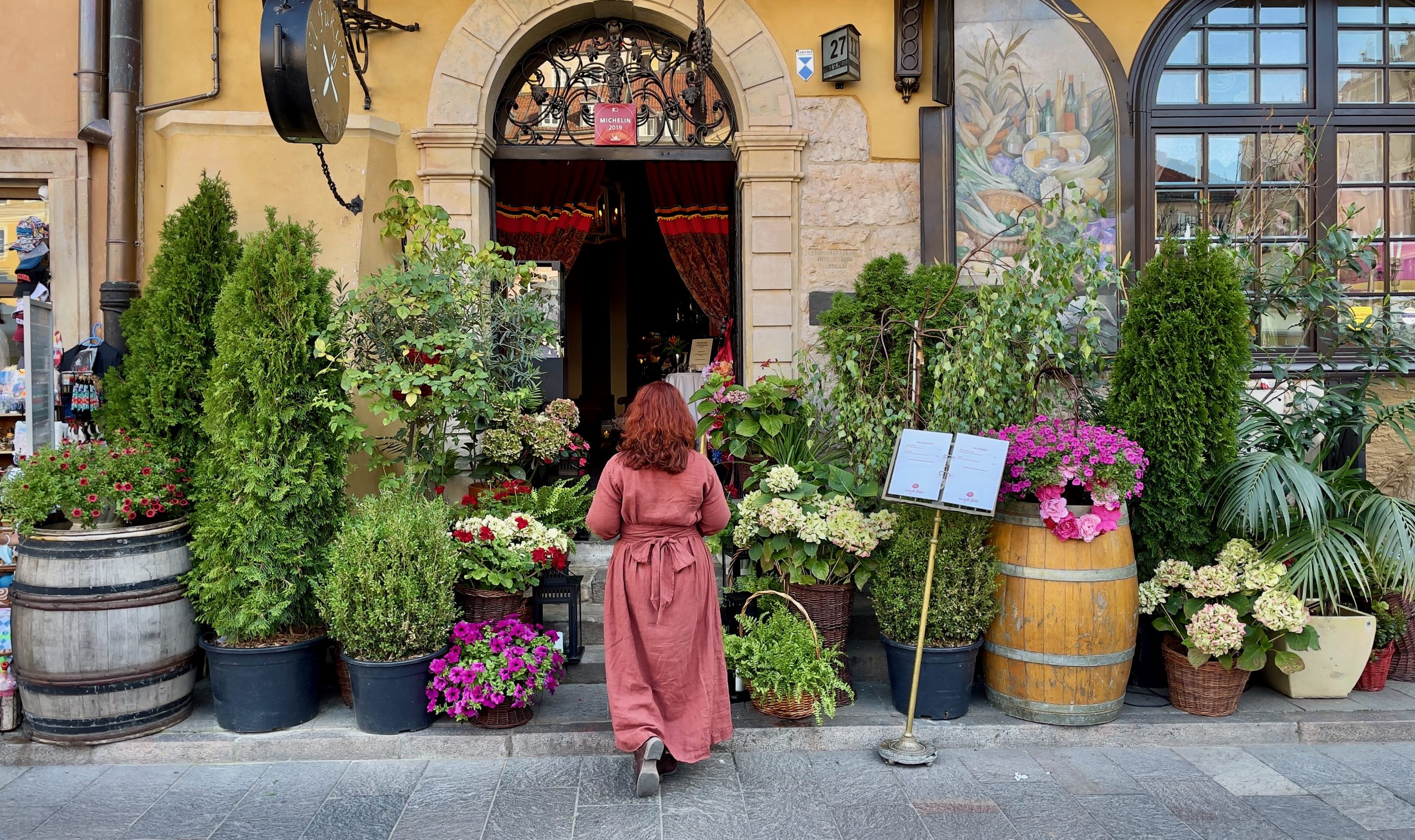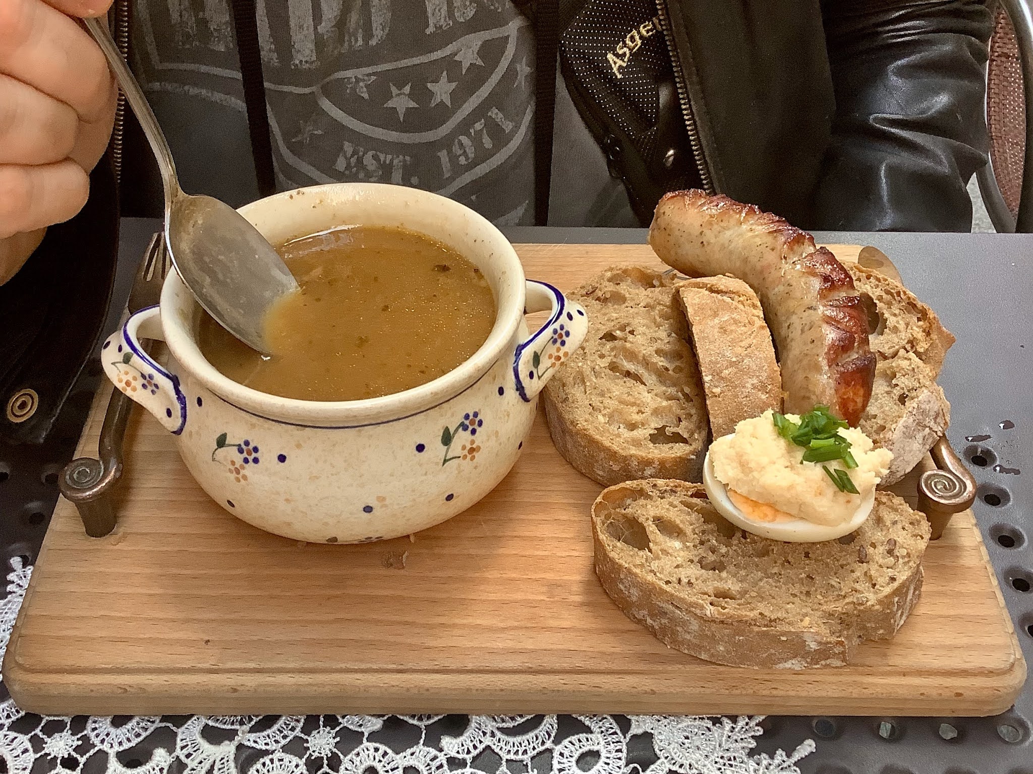 Nous faisons traîner encore un peu jusqu’à l’heure du dîner, puis allons signaler à la serveuse de chez Zapiecek que nous sommes intéressés par la prochaine table qui se libèrera dans la ruelle. Nous n’attendons qu’une dizaine de minutes avant de pouvoir nous installer. Cette fois encore, nous choisissons de commander trois plats à partager: une soupe de chou sûr accompagnée d’une saucisse et de pain noir, des gnocchis avec une sauce aux champignons à la crème et des croquettes panées à la viande et au fromage. Ouais, que du light. Je cale d’ailleurs assez vite. Pour arroser tout ça, nous avons choisi deux limonades maison et, sur la recommandation de la serveuse, j’ai ajouté à la mienne un shot de liqueur de mûre locale qui me plaît tellement que je lui demande de m’écrire le nom de la marque sur un papier. Prix total du festin avant pourboire: 122 zlotys, soit environ 27 euros hors frais bancaires.
