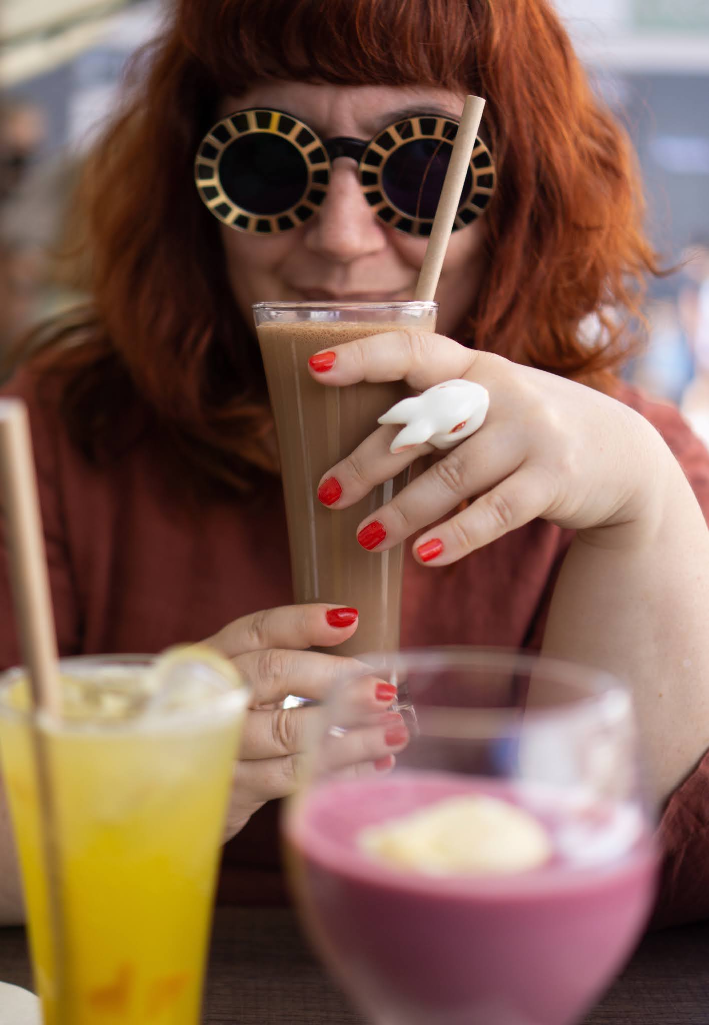 Quand nos vieilles jambes commencent à protester (la cinquantaine, ce n’est pas une blague: en l’espace de quelques mois, c’est dingue comme on s’est raidis et comme on a perdu en endurance tous les deux…), nous nous posons à la terrasse de chez E. Wedel, le chocolatier star de Varsovie. L’intérieur est vraiment très beau dans le genre chic discret, avec ses deux salles spacieuses, ses banquettes en cuir, sa fontaine gazouillante et son élégant néon au mur, mais par un temps pareil, même un vampire dans mon genre n’envisage pas de s’enfermer. Je savoure un délicieux chocolat noir glacé, tandis que Chouchou se délecte d’un dessert à base de chocolat blanc, de cassis et de glace vanille. Avant de partir, j’achète un pot de chocolat en poudre pour moi et un de pâte à tartiner aux noisettes pour notre voisine de Bruxelles qui a gentiment accepté de réceptionner courrier et colis en notre absence.