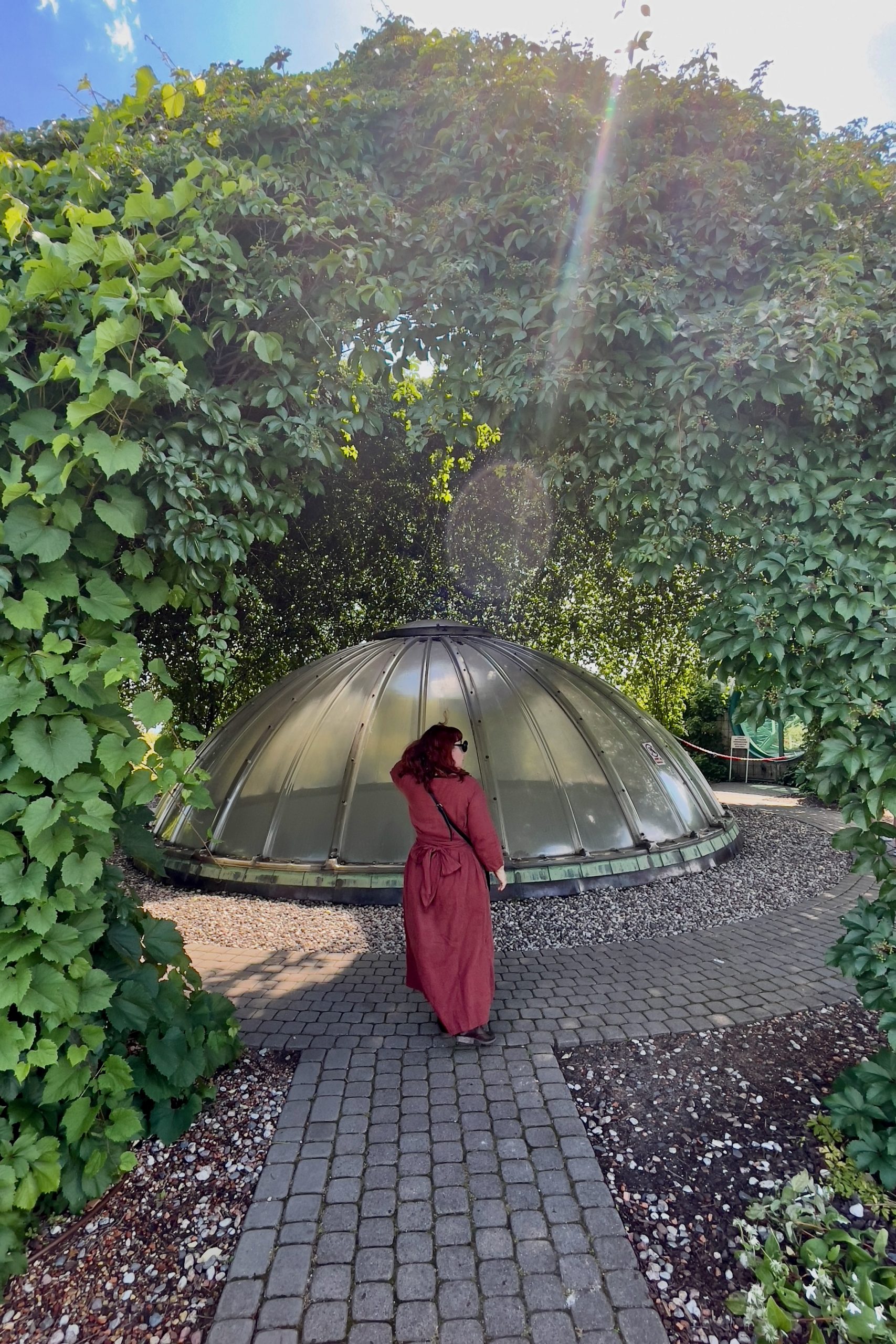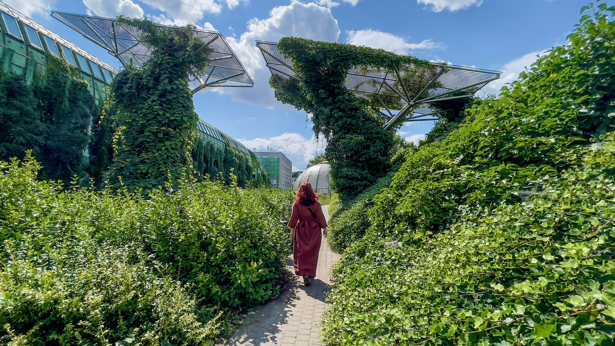 Nous mettons ensuite le cap sur la bibliothèque universitaire voisine, qui présente la particularité d’avoir un jardin sur le toit. Faute d’accès clairement indiqué, nous cherchons un moment et longeons l’impressionnante bâtisse à la façade moderne vert-de-gris, dont les immenses panneaux sont couverts d’inscriptions en divers alphabets et langages. Une employée mal aimable nous pointe enfin dans la bonne direction. Le soleil cogne assez fort à ce moment-là et la lumière est très contrastée, mais nous réussissons quand même à prendre quelques bonnes photos. Le mélange de verrières, de passerelles métalliques, de dômes transparents et de végétation touffue me fait penser au château dans le ciel de Miyazaki. Par contre, mon guide promettait la présence d’un glacier et je ne le vois nulle part – remboursez!