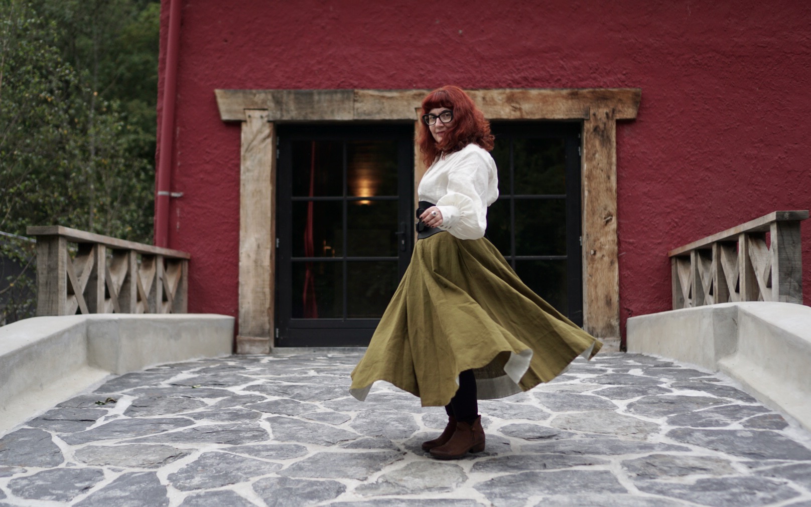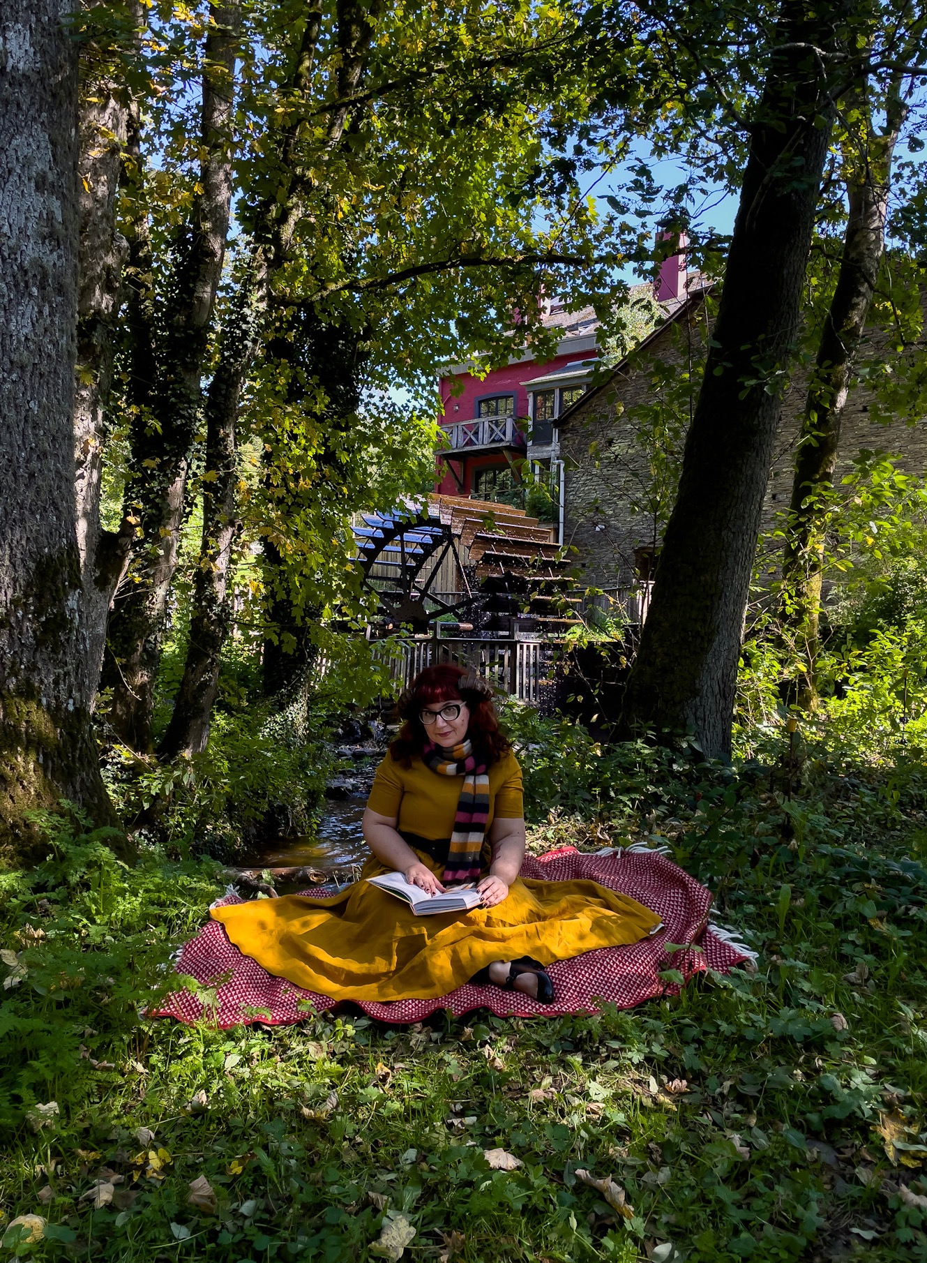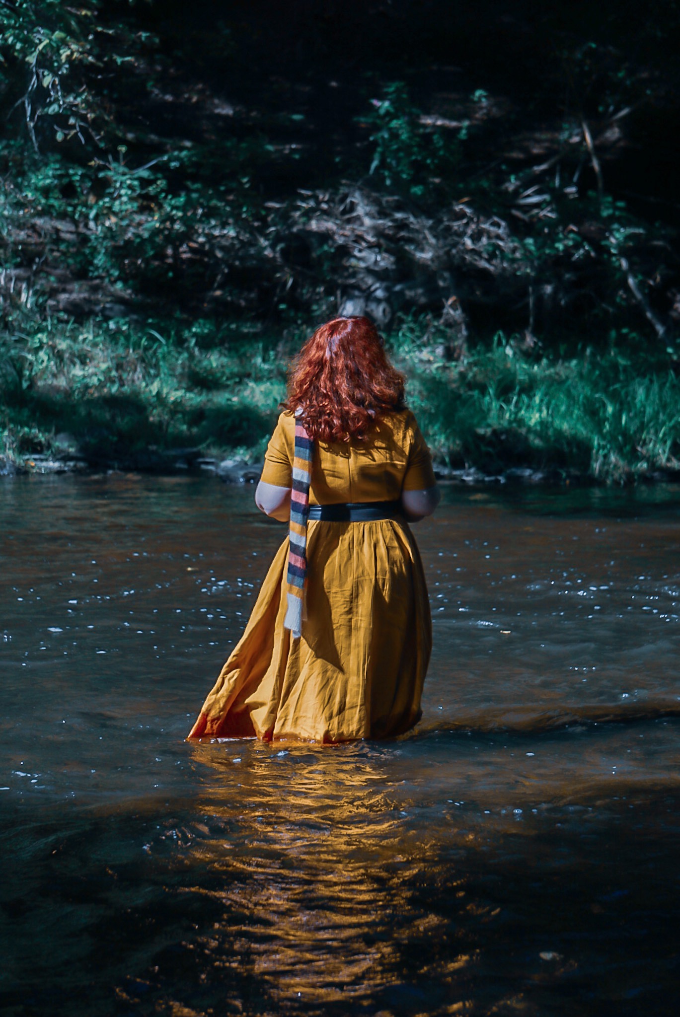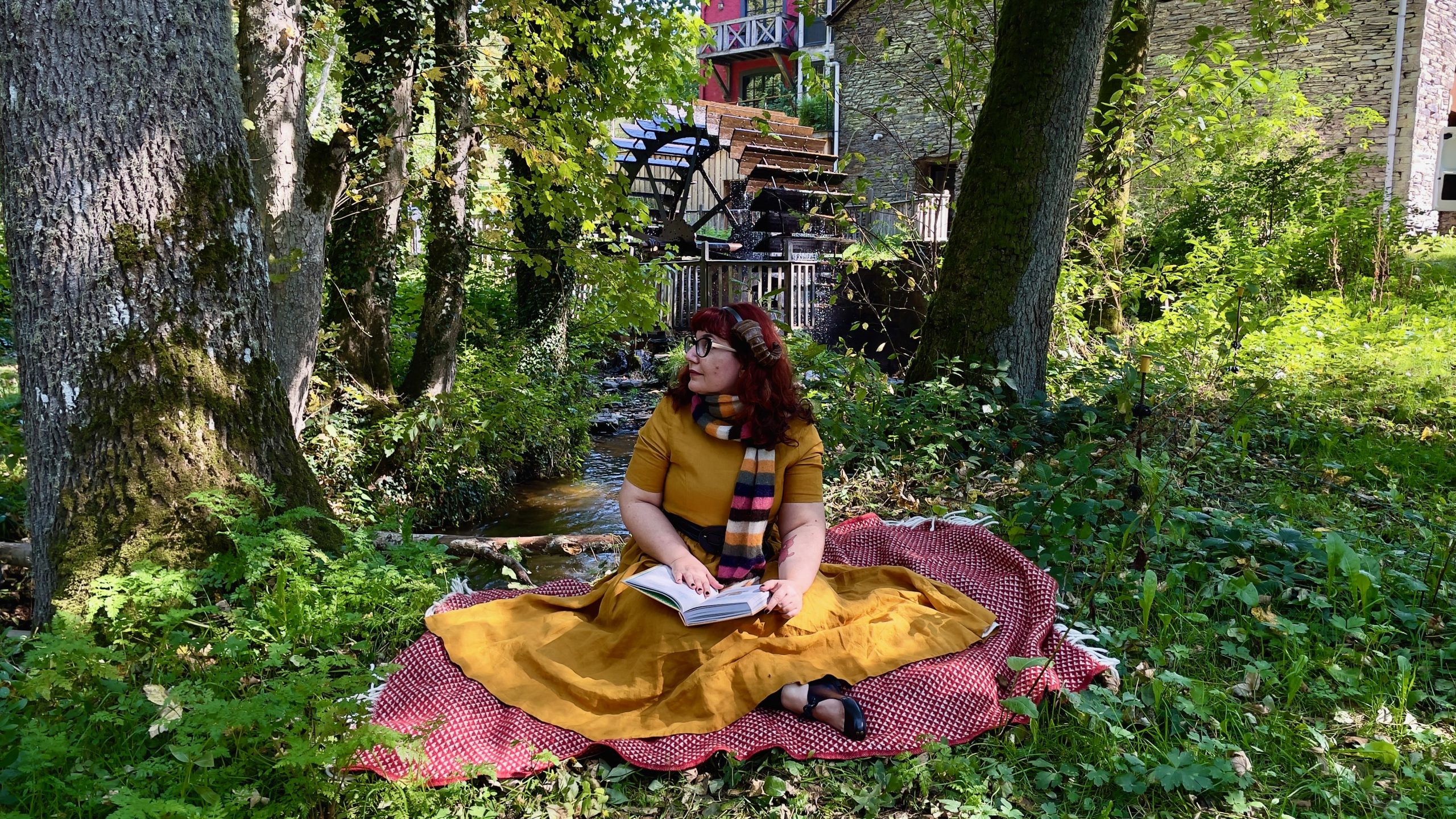 J’ai fait un gros effort pour sortir de ma spirale de greumeuleu et profiter quand même du séjour. Ses aspects comiquement malcommodes mis à part, la Henriette jouissait bel et bien d’une vue époustouflante et d’un calme tel que je n’en avais pas connu depuis bien longtemps. Le chant des oiseaux et le souffle du vent dans les arbres, c’est quand même le meilleur réveil du monde (d’accord: avec le bruit du ressac). En plus, nous avions de la chance côté météo: il faisait très beau mais pas trop chaud, un temps idéal pour manger sur la terrasse entourés par la forêt. Et aussi pour prendre plein de photos. J’avais apporté quatre tenues et des idées assez précises sur la manière dont je voulais les mettre en scène. Au final, nous n’en avons shooté que trois, mais j’ai tellement adoré le résultat que ça n’a pas d’importance. J’ai même poussé l’abnégation jusqu’à entrer dans le ruisseau glacé avec des claquettes de piscine pour tenter une photo dans l’eau. Du coup, la journée passée entièrement sur place n’a pas été très reposante, mais on a bien dormi et pris un grand bol d’air frais et de nature. Et on est repartis de bien meilleure humeur qu’on était arrivés!