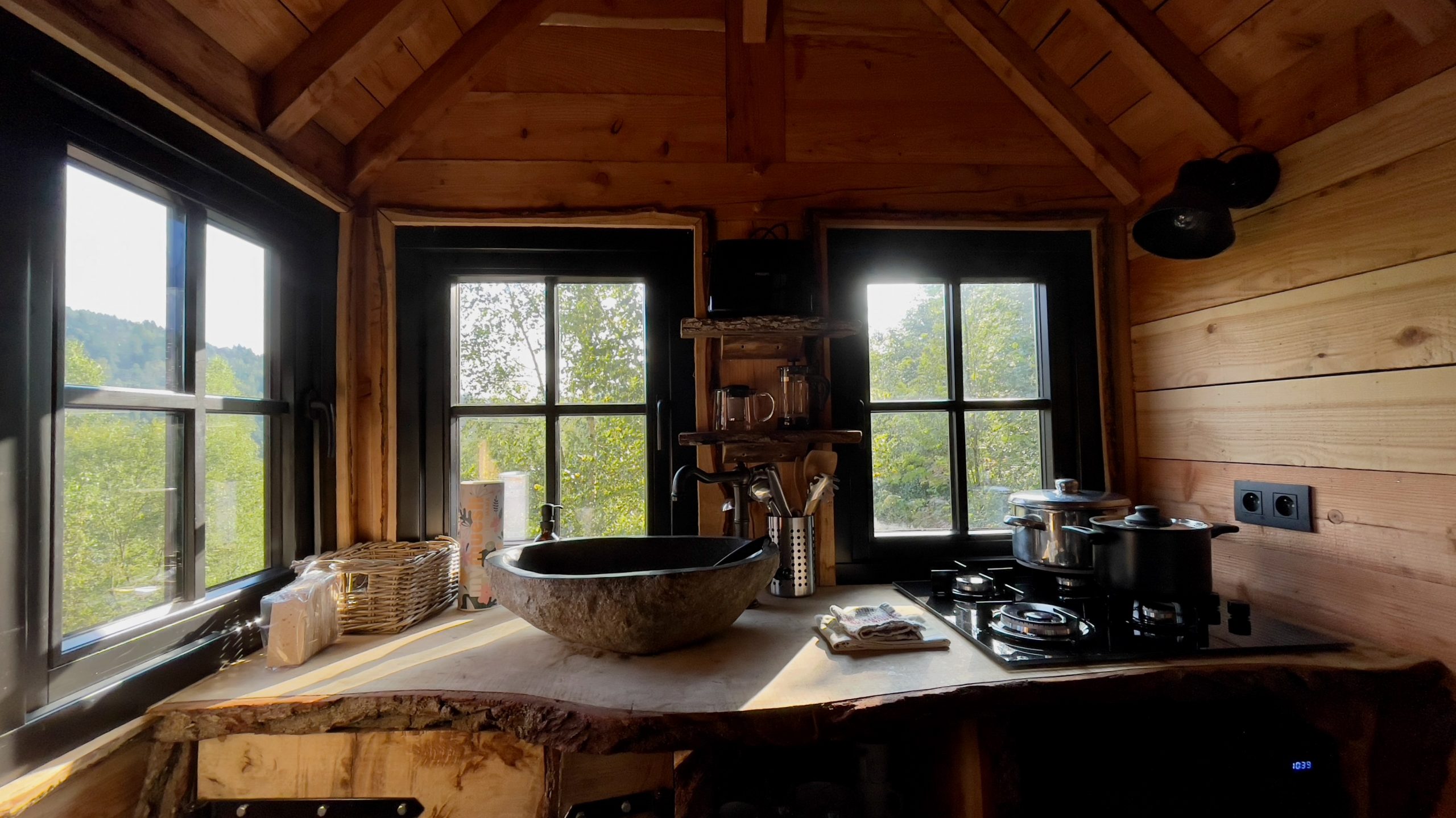 Après ça, la découverte de la cabane elle-même fut une source de grande perplexité. Oui, tout était mignon et photogénique, mais rien n’était pratique. Pour accéder au lit niché dans une ravissante alcôve, il fallait escalader un canapé impossible à bouger – un meuble monstrueux avec une structure massive mais paradoxalement peu de place pour s’asseoir, dont les accoudoirs inutilement larges bloquaient à demi l’entrée des toilettes. On ne pouvait accéder à celles-ci que de profil avant de faire pipi les genoux à l’extérieur faute de place pour manoeuvrer la porte. C’est de profil également (et en rentrant le ventre) qu’il fallait gravir les marches étroites montant vers l’immense baignoire baquet dans laquelle une famille de quatre personnes aurait tenu à l’aise. Temps de remplissage à vue de nez: 3 bonnes heures, donc pas moyen que l’eau reste chaude tout le long. Et robinet très esthétique mais fixe, du coup impossible de se doucher. Un broc à l’ancienne était tout de même fourni pour s’arroser manuellement…