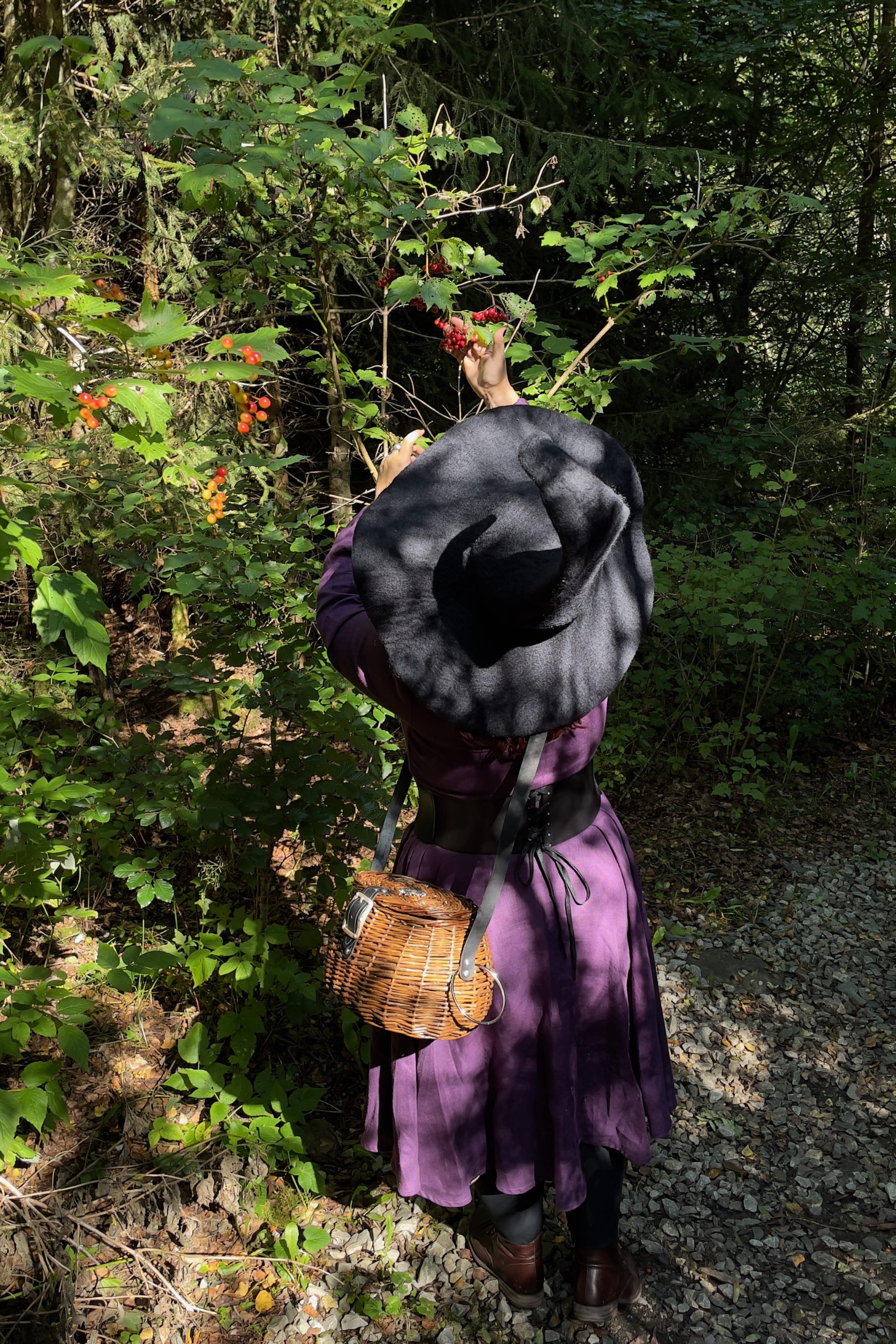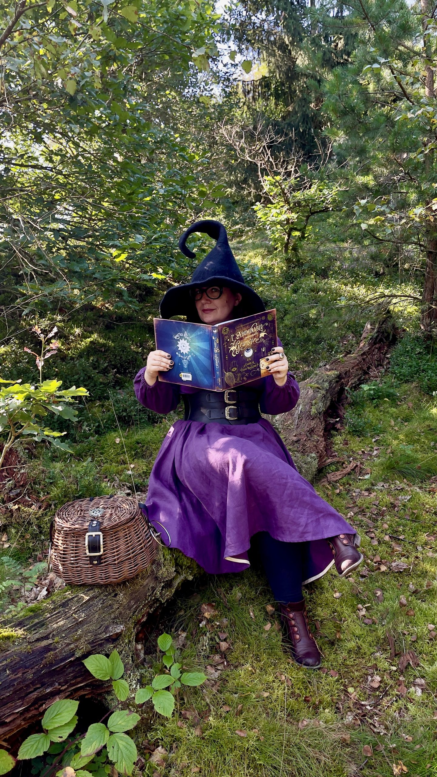 Chapeau et panier de sorcière Costurero Real, robe en lin violet modèle Grace de Cotton Candy Wear,
