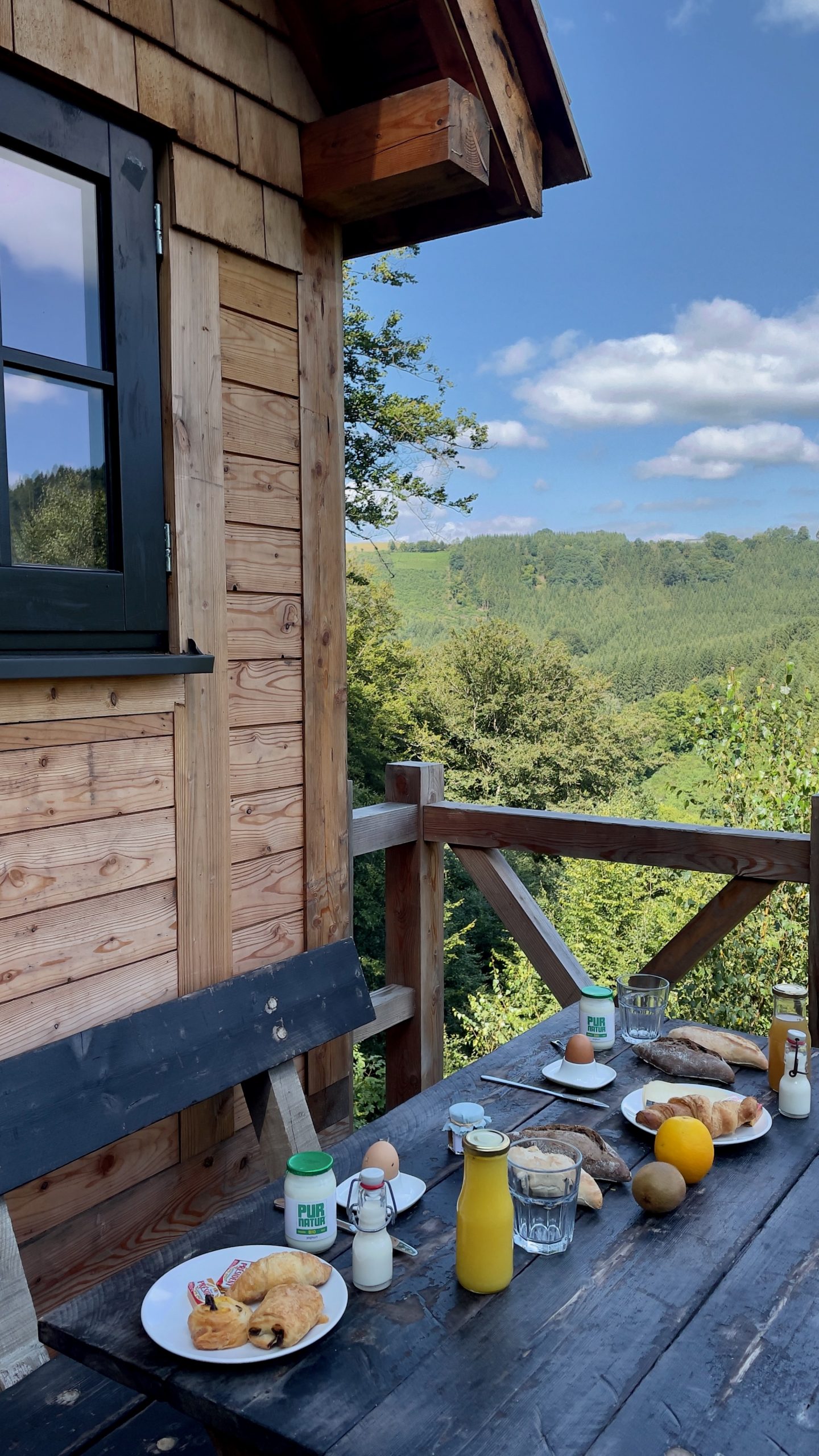 En 2018, pour mon anniversaire, nous avions passé une nuit aux cabanes de Rensiwez, dans la Thalia. J’avais tellement adoré cette expérience (« Avec un stock de bouquins suffisant, je pourrais squatter ici un mois entier! ») que je m’étais juré de revenir un peu plus longtemps. Arrivée à partir de 15h et départ à 11h le lendemain, ça fait court pour profiter, surtout en hiver… L’an dernier, j’avais donc réservé la Perchée pour deux nuits. Mais aux dates où ça tombait, je craignais d’être coincée à Monpatelin par un confinement. J’ai contacté la gérante, qui a gentiment accepté de me faire un avoir pour plus tard. Et quand j’ai voulu reporter à début septembre de cette année, la Perchée était déjà complète jusqu’au milieu de l’hiver. J’ai donc opté pour la Henriette, une des deux cabanes construites sur les crêtes depuis notre séjour précédent. Les photos étaient sympas, et le site promettait une vue magnifique.