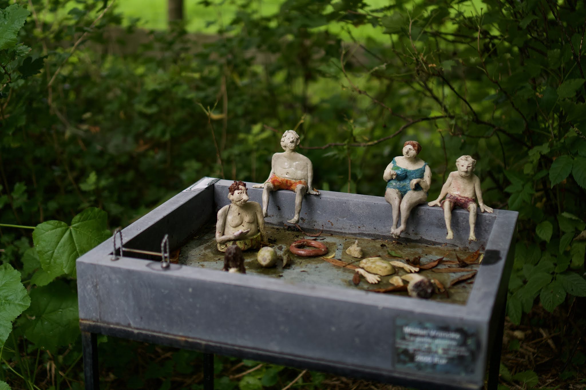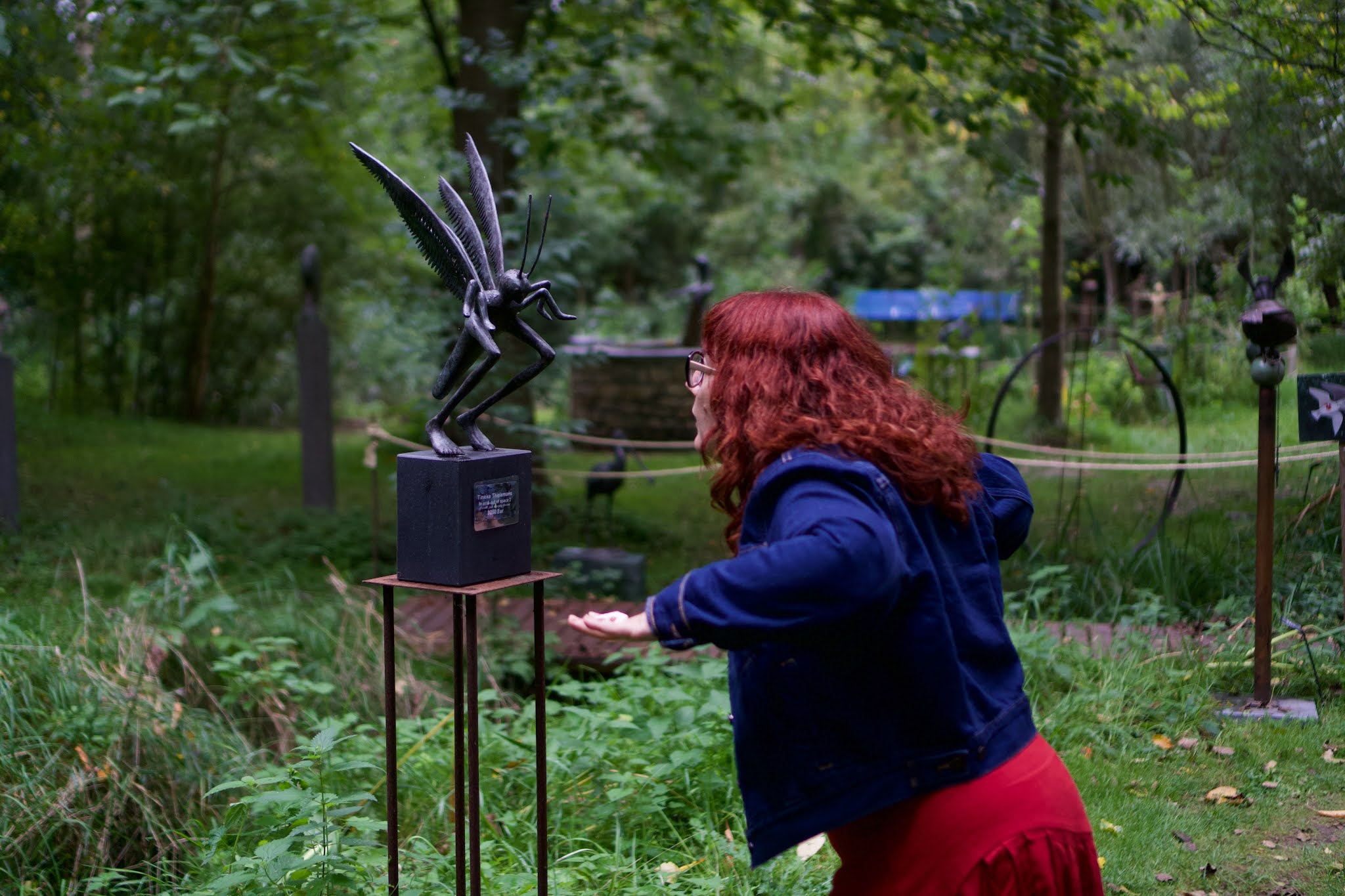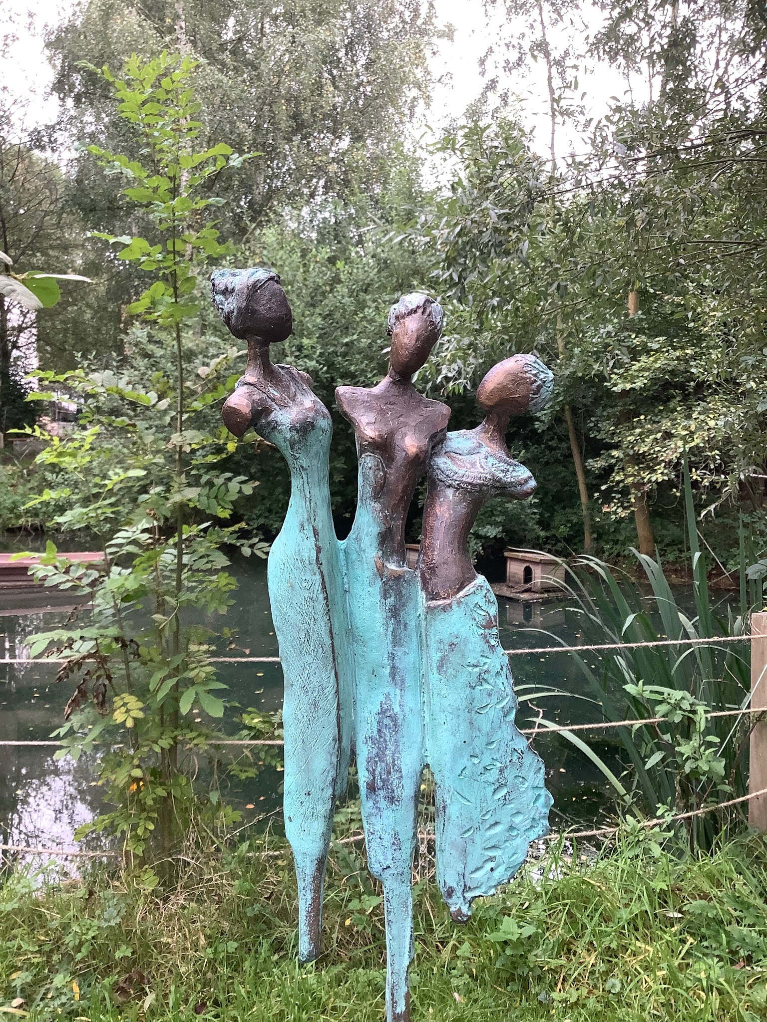 A l’entrée, nous avons payé 8€ (donnant droit, non seulement à un vrai beau ticket que j’ai pu garder en souvenir, mais à une boisson à la buvette). Dès les premiers pas sur le chemin boueux, nous avons compris que l’endroit méritait son nom. Des centaines de sculptures en céramique, en bronze, en terre cuite, en pierre, en fer forgé, en bois ou en verre se nichaient dans les moindres recoins d’un immense jardin-forêt juste assez sauvage pour donner l’impression qu’elles étaient apparues là par magie. Il y avait peu de monde comparé à la surface à explorer, et nous avons déambulé en alternant exclamations de surprise joyeuse et murmures de ravissement.