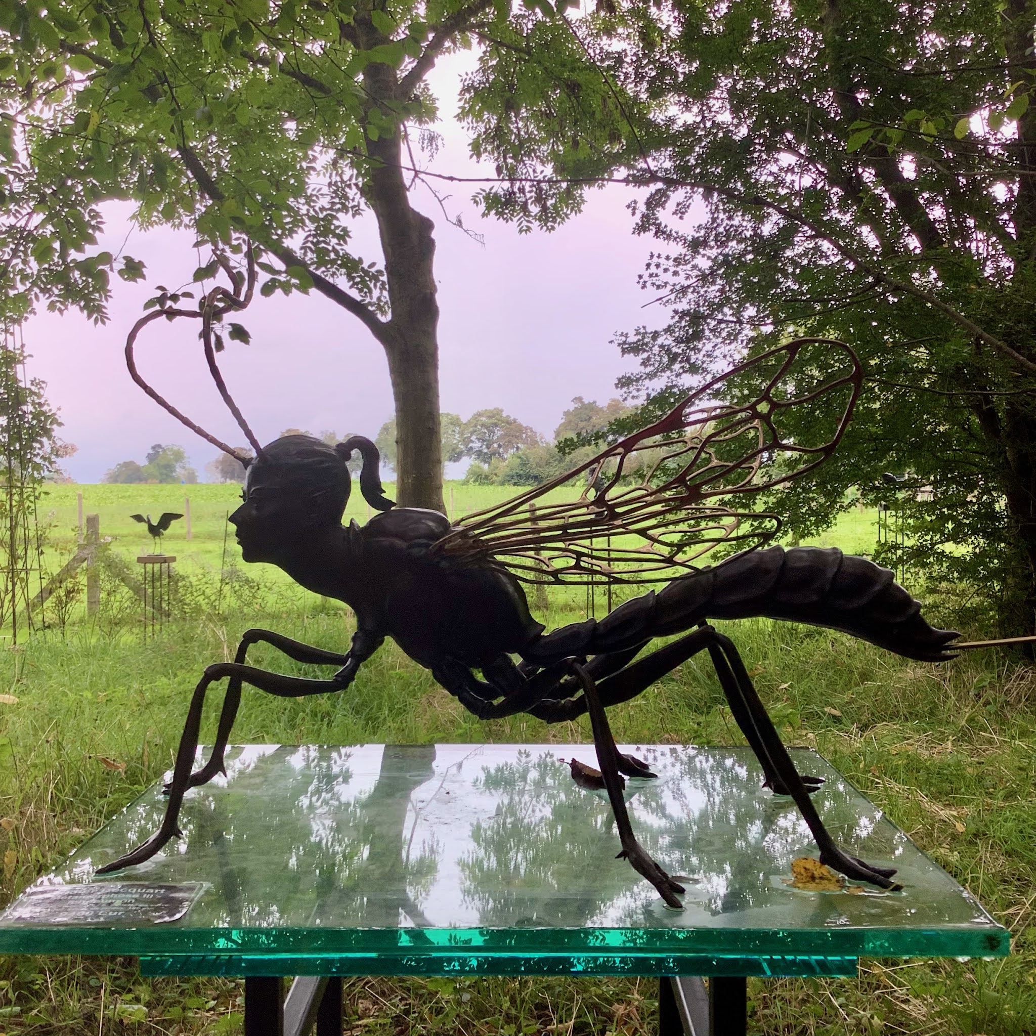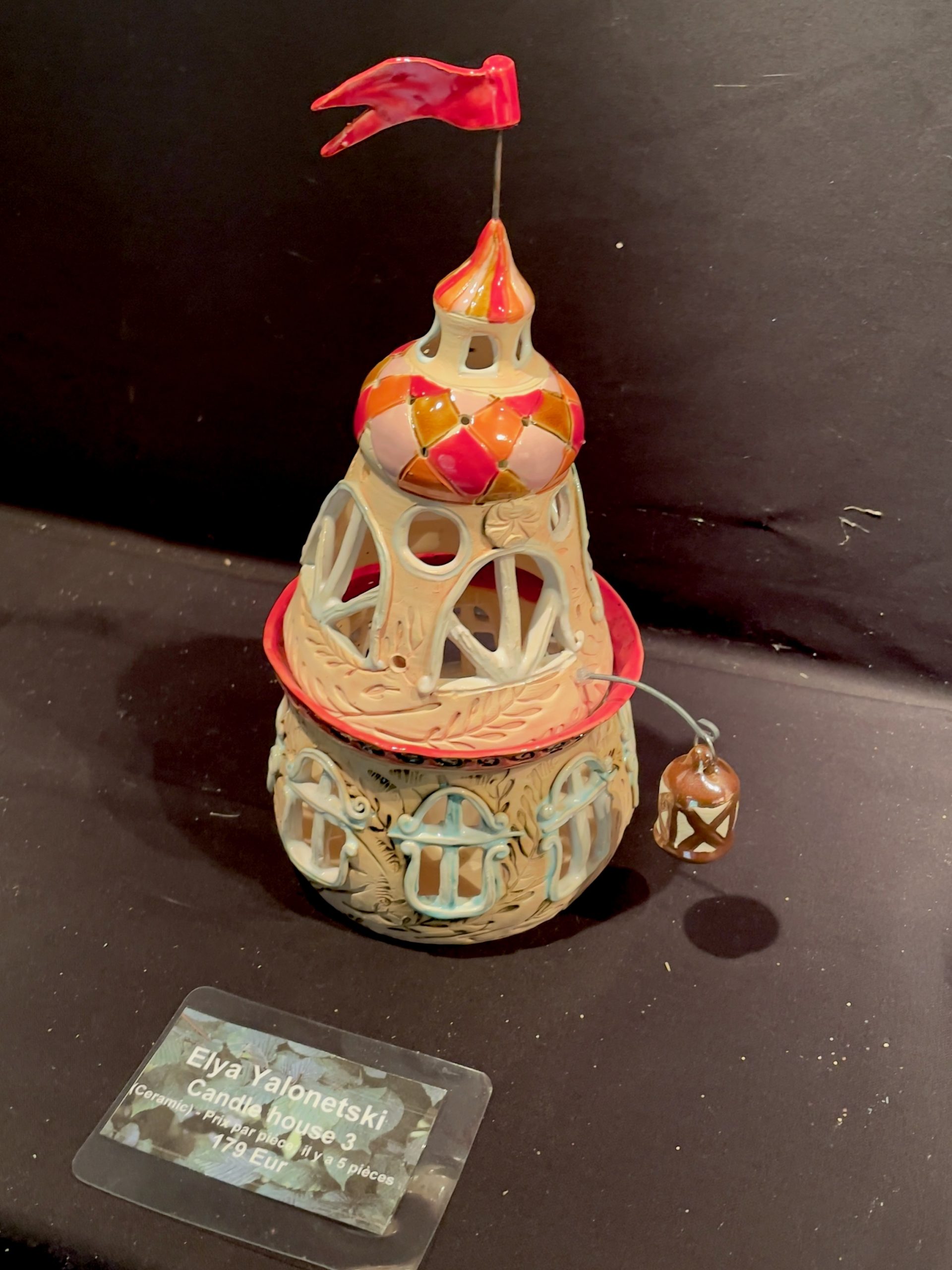 Pour une fois, j’ai regretté de vivre en appartement: il y a bien une douzaine de pièces que j’aurais eu envie d’emporter, et toutes étaient à vendre à des prix très abordables. J’ai été particulièrement séduite par les oeuvres d’Elya Yalonetski, disséminées aux abords d’une étonnante spirale de verdure et dans la cabane voisine. Mais tout était beau et intéressant. Le calme et la fraîcheur ambiante ajoutaient à l’enchantement. Ca et là, un énorme carillon accroché aux branches des arbres tintait dans la brise. Il me semblait avoir pénétré dans un royaume de poche, à l’écart du monde et de son agitation. J’avais envie de coiffer mon chapeau de sorcière, de chasser les autres visiteurs et de jeter un sort sur la propriété pour en faire mon inaliénable domaine. Oui, rien que ça.