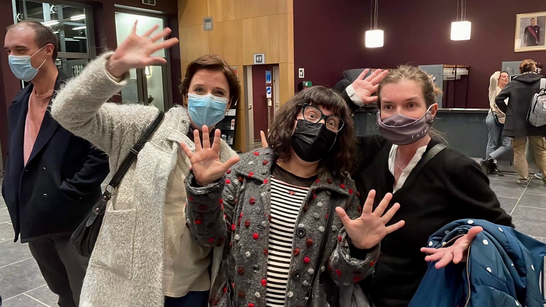 ★ Après avoir bavardé avec Gasparde avant d’entrer dans la salle du centre culturel d’Uccle, nous nous installons à nos places au rang H. Juste devant nous, une dame me fixe très intensément. Elle baisse son masque d’un geste rapide: c’est Ann-Sophie, du circuit des troc parties. Pendant qu’on bavarde, son mari s’écrie: « Hé, ça ne serait pas Sophie-Grosquick là-bas? » Si. Décidément, tout ce que Bruxelles compte de gens de bon goût s’est déplacé pour le spectacle de Marina Rollman.