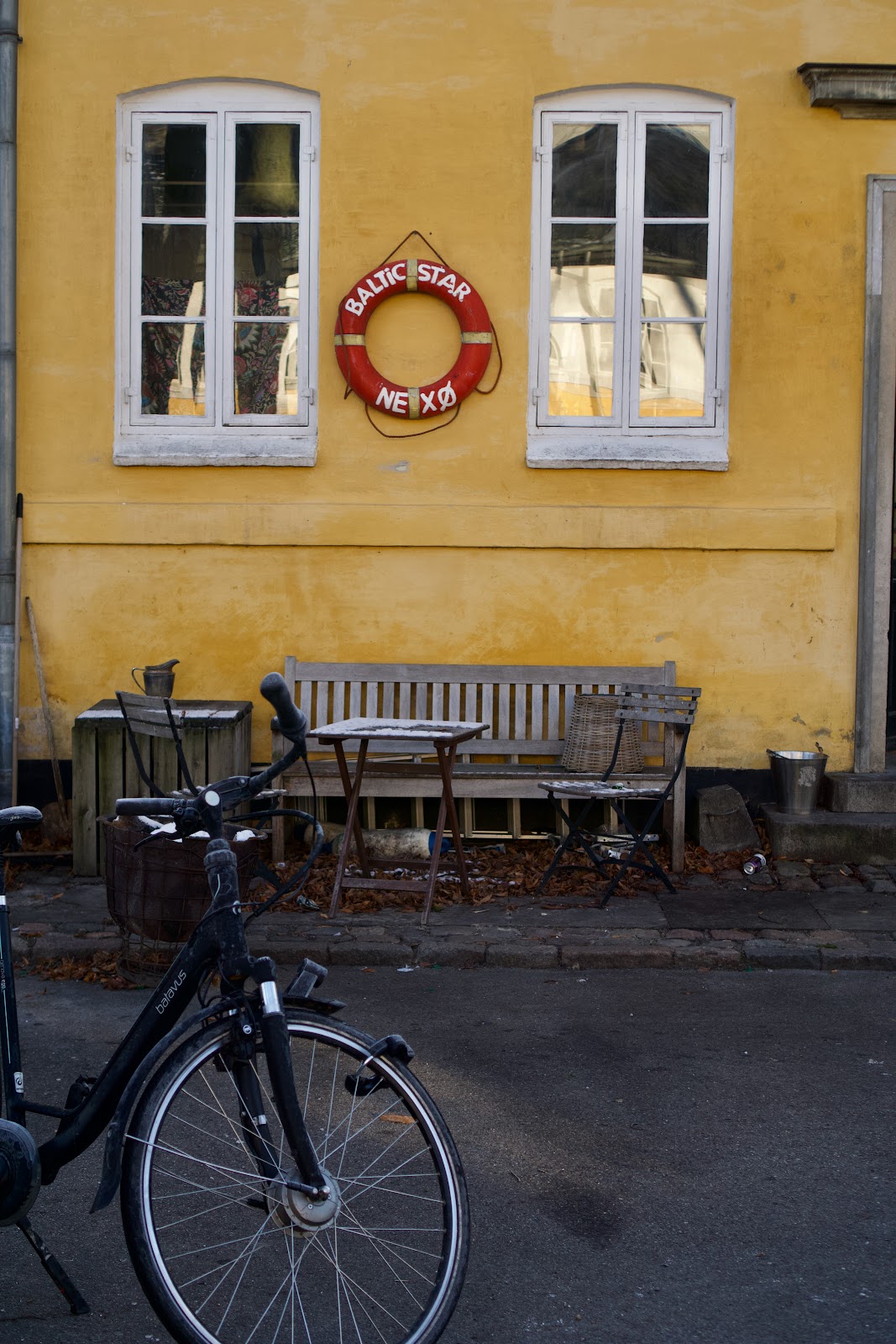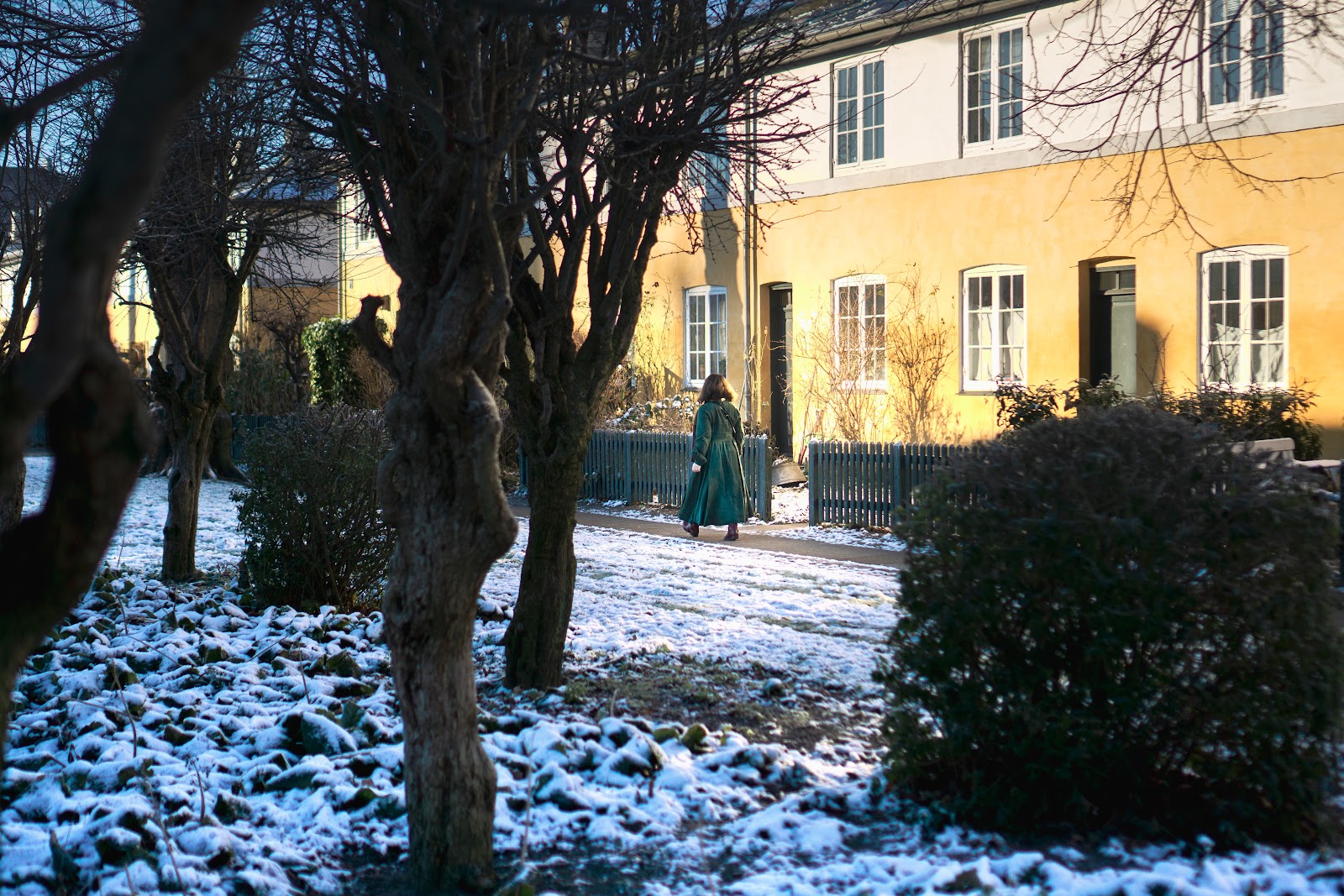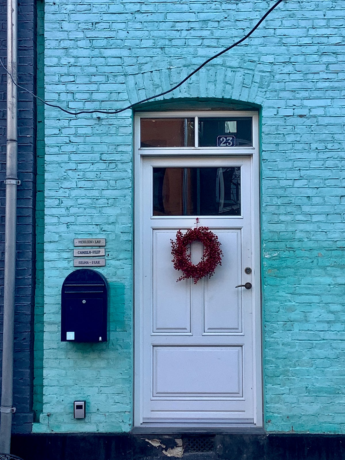 Deuxième journée ensoleillée avec un froid vif mais sec, le temps parfait pour se balader! Nous prenons le métro jusqu’à Trianglen et allons faire des photos dans Olufsvej (l’équivalent local de la rue Crémieux avec ses jolies façades colorées), puis dans le quartier voisin de Brumleby: une enclave de maisonnettes mitoyennes ocre et blanc toutes identiques, créées pour servir de logements sociaux et alignées selon un quadrillage parfait. Rien à voir avec les HLM du quartier où j’ai grandi… Les jardinets sont décorés avec amour, et les aires de jeux saupoudrées de neige donnent envie de retomber en enfance.